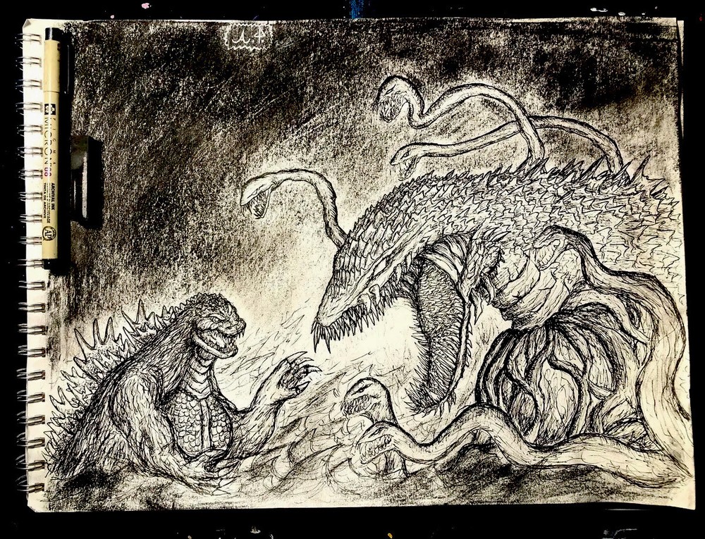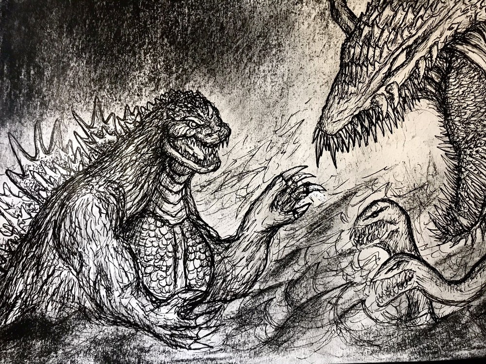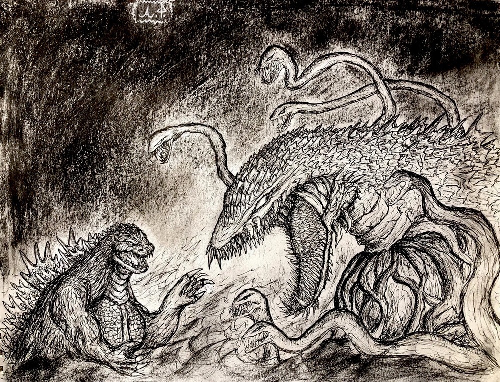 Godzilla vs Biollante original drawing, done in pen/charcoal. 11x14 inches. Sealed with a matte finish.