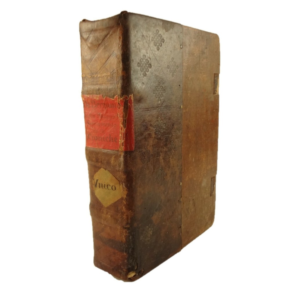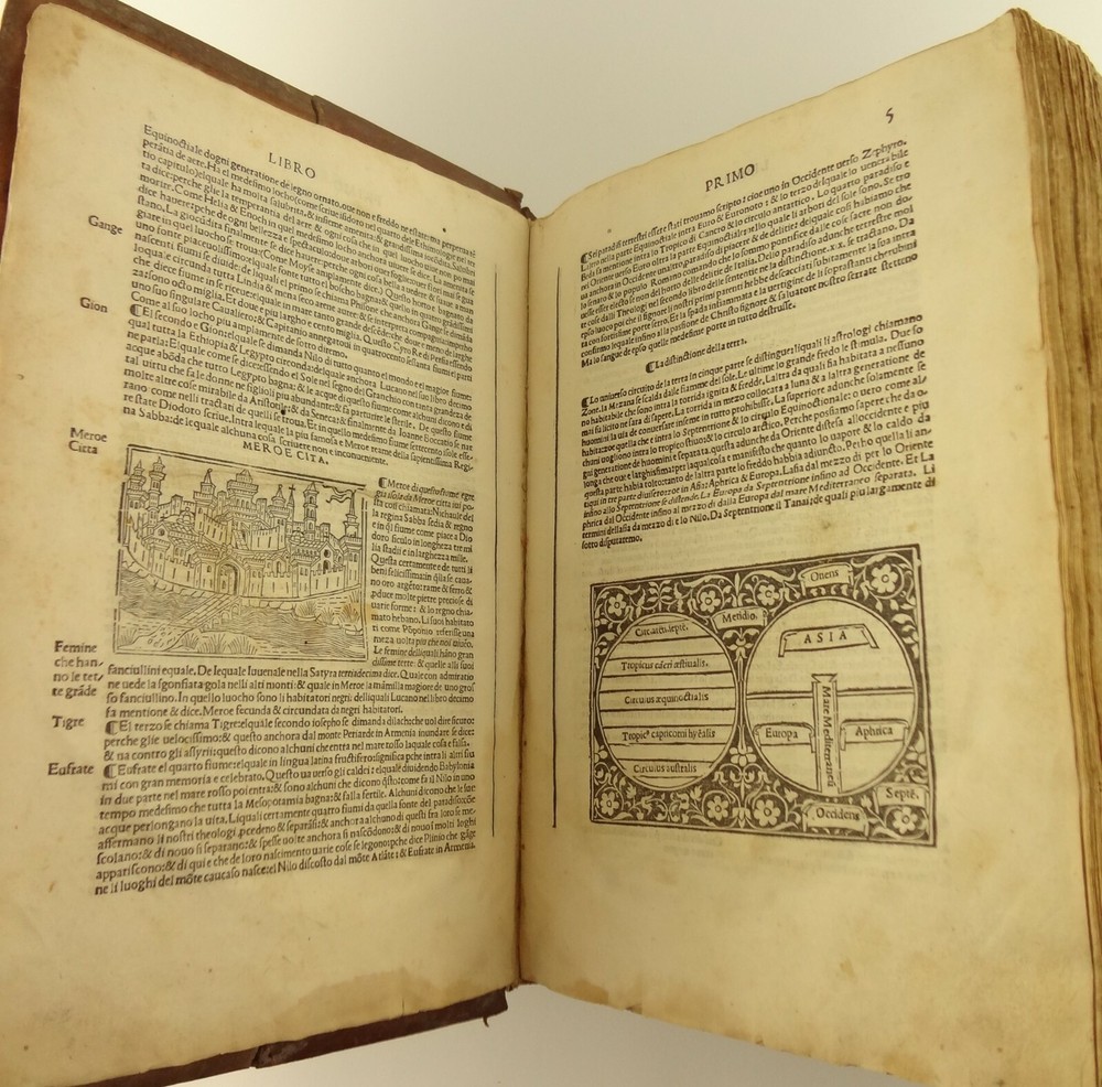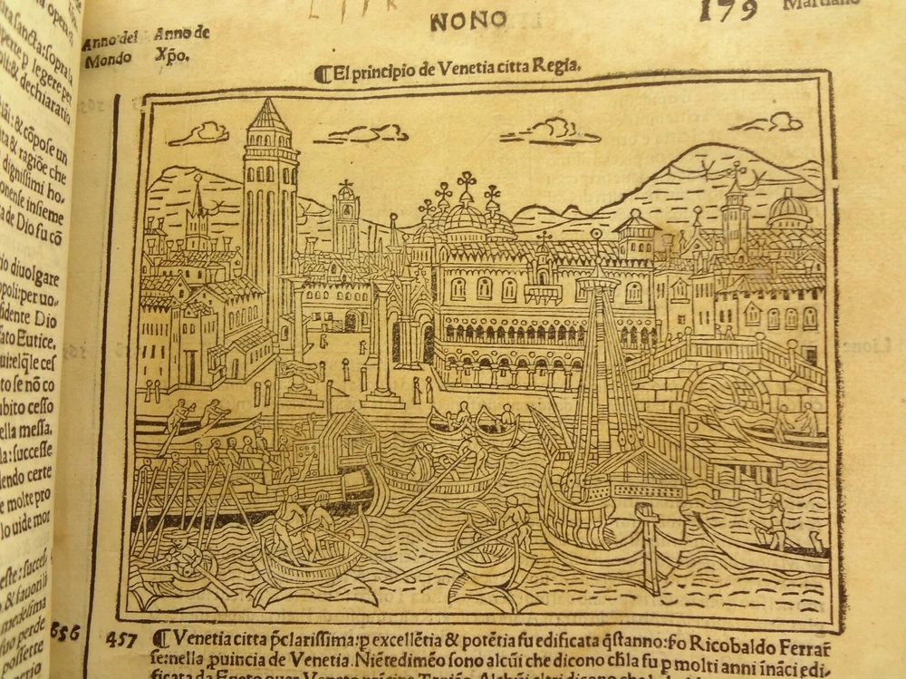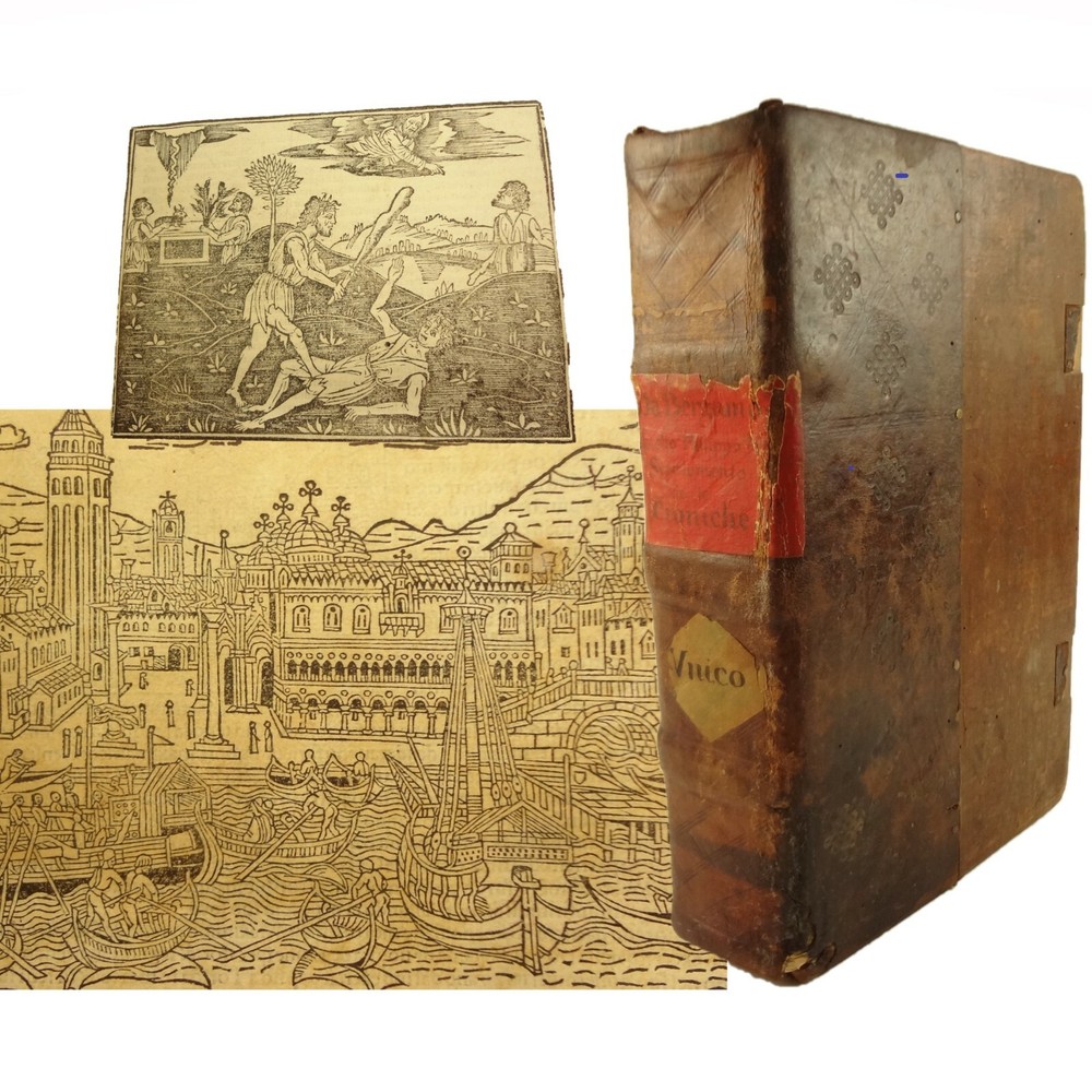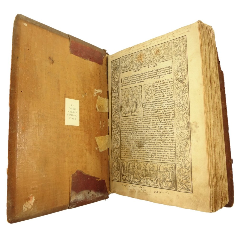 A beautiful book, filled with incunable, and post-incunable woodcuts, in a contemporary binding. The first history to describe Columbus' voyage to "India", but America (1st included in the 1503 edition). Over one hundred woodcuts with views of cities (including Rome, Venice, etc.), a handful of biblical scenes/portraits, and two very interesting ancient maps (in one woodcut). Jacobus Philippus Foresti first produced his Chronicle in 1483, as a supplement to those Chronicles already in print. It was reprinted frequently. The 1503 edition is credited with being the first book to give a lengthy description of Columbus' trip, the text of which is also found in this edition of 1520 (verso 342, recto 343). Some woodblock city-views were either recut to be nearly exact, or are still the incunable blocks, re-used. Regarding the maps, they are the woodcut with the two circles (globes). The left map is a "zonal" map, known as contemporary to Pythagoras (circa 500 BC). The right map is known as a T-O map - "In these examples to O represents the boundary of the world, the horizontal stroke of the T the meridian running from the Don to the Nile, and the perendicular axis (the T-O maps invariably being oriented with east at the top) the line of the Mediterranean. T-O maps appeared in manuscripts from the early Middle Ages, and the very first printed world map, from a version of the seventh-century AD writer Isidore of Seville's Etymologiae published in 1472, is of this kind." - Rodney Shirley I love the contemporary beveled wood binding, with some tooling in the leather spine. The 1520 edition is rare. I found one record of it selling in 1907 (Bibliotheca Brasiliense, item #384), and three of the world's libraries seem to have copies: Villanova University, University of London Research Library Services Warburg Institue, and the British Library St. Pancras. The St. Pancras copy is hosted digitally and can be viewed (digital store i.d. - "9006.i.10."). OCLC #25540094 and OCLC #1064227220. Provenance - A note on the 1st leaf says this copy was purchased in Venice in the 1880s. The ex libris of the Grolier Club member Nathan Comfort Starr is on the back of the front board. Physical Attributes - Measures approx. 34 x 22 x 7 cm, folio. Bevelled oak boards with leather spine. Clasp hardware on back board, nails and remnants of leather clasps at front. More brass nails at edges of spine leather. Interlocking design tooled in blind onto leather. Three raised bands to spine, compartments with diapering by double blind fillet, title on paper in one compartment. 103 in-line woodcut illustrations, some repeated; most are views of cities, a few are biblical, and one map. One large full-page woodcut of Adam and Eve's expulsion. Two other large woodcuts from the famous 1503 edition are included, but lack the borders to make them full-page (as in 1503): Cain/Abel, and Babylon (the Creation is missing). The first leaf has richly illustrated borders. Each of the sixteen books has a decorated initial at its start. 356 leaves, numbered. Missing introductory 1st quire that included the title page, table of contents and one woodcut (creation). Pagination starts at "1" and collates complete thereafter (see condition notes). Collation - A6, B to Z8, x8, y6 Leaves mis-numbered at 16,129, 198, 209, 251, 260, 279, and 287 Condition - See pictures. Because of the importance of this book, I will be very detailed. Please bear in mind, that it's in its contemporary binding, with wide margins, and completely functional in book form (it is not brittle). It is a delight to peruse. Binding is (likely) contemporary and shows the signs of 500 years. Remnants of leather straps. Some worm holes (not bad). Start of crack at bottom of front board. Some cracking at bottom of front joint. Top and bottom of spine good, with endbands present! Some remnants of a label on back board. About .5 cm. has cracked off from top left of rear board, for about four inches along fore-edge (barely noticeable). Start of crack at bottom of rear board too. Labels to spine have some loss. Pastedowns, if it had any, have been removed. Missing 1st quire of eight leaves. Title page was on the first missing leaf, with the "tabula" (table) starting on the verso, and concluding on the recto of the last leaf missing, the verso of which had a creation woodcut. Can be seen at the British Library's digital posting. This book starts at leaf "1", and is complete excepting the title, table of contents, and 1st woodcut (I collated, and checked against the BL copy). At bottom of inside of boards, and only on the page with the Adam and Eve expulsion (and facing), there is a trace of white which I believe is long dead mold. It may still be active, but I doubt it or it'd have spread, and would stink. I think it's long dead, probably from when it was in Venice (the moisture). There is a trace of moisture mark at bottom edge (again, Venice), but the book is entirely dry. Mark only touches text at ends, and about 10 leaves in the middle. At last 10 leaves it is heaviest/darkest at bottom. Damage to last leaf, bottom, clipping some of the colophon. On page 1, notes in margins, thumbing, stains, two worm holes, and faded with some lines filled in with gall ink. Some spots (fox, rust), toning, thumbing, page edge chip or small tear, etc. throughout. Many illustrations have toned... not sure why. Perhaps something to do with the ink and paper reacting to each other. Top corner chipped off leaf 21, no text affected. 6" tear from fore-edge 25, crude old repair. 3" tear bottom of 52. Ink smudge on 60. 2" fore-edge marginal tear on 63. 4" tear from bottom-edge 158. Ink spots at bottom of 269. Writing on verso of last leaf bleeds through last leaf (can be seen on last page of print). Marginal notes, in an old hand, on about a dozen pages. I used a "v" shaped cradle to not put undue burden on the binding, but when doing such the book still performs very well, doesn't feel fragile, and is very e