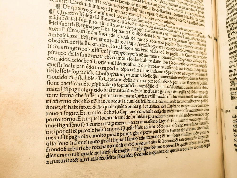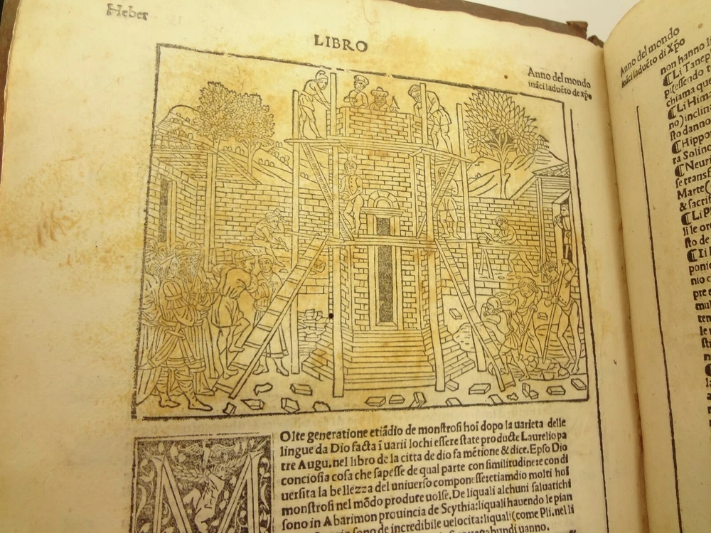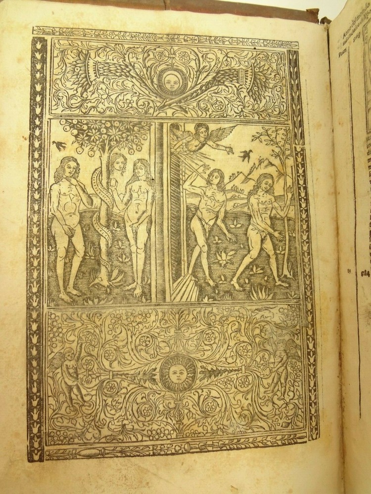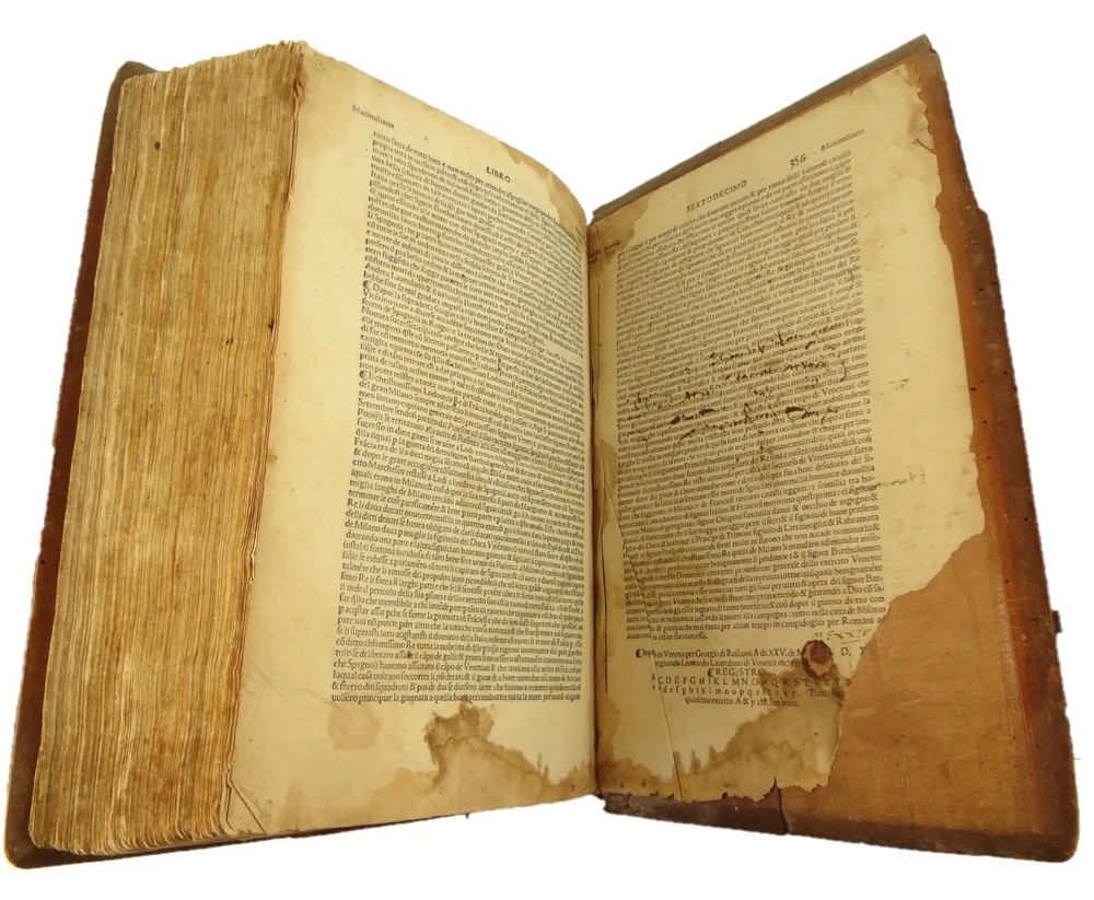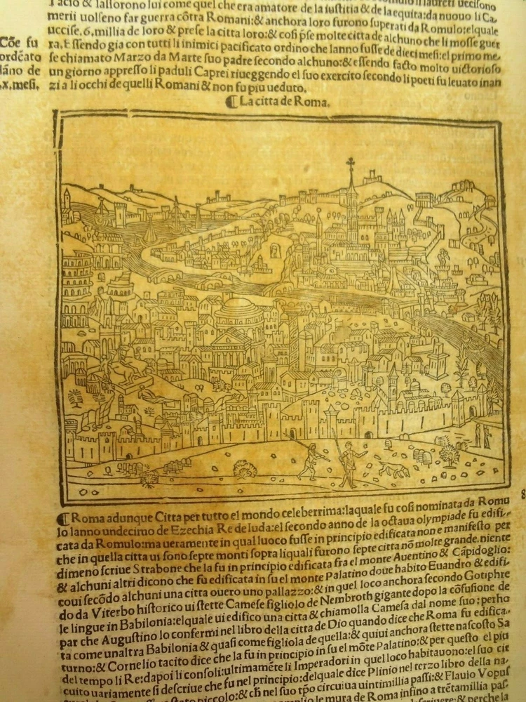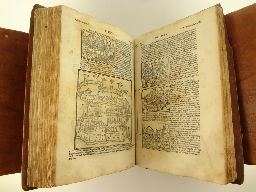 A beautiful book, filled with incunable, and post-incunable woodcuts, in a contemporary binding. The first history to describe Columbus' voyage to "India", but America (1st included in the 1503 edition). Over one hundred woodcuts with views of cities (including Rome, Venice, etc.), a handful of biblical scenes/portraits, and two very interesting ancient maps (in one woodcut). Jacobus Philippus Foresti first produced his Chronicle in 1483, as a supplement to those Chronicles already in print. It was reprinted frequently. The 1503 edition is credited with being the first book to give a lengthy description of Columbus' trip, the text of which is also found in this edition of 1520 (verso 342, recto 343). Some woodblock city-views were either recut to be nearly exact, or are still the incunable blocks, re-used. Regarding the maps, they are the woodcut with the two circles (globes). The left map is a "zonal" map, known as contemporary to Pythagoras (circa 500 BC). The right map is known as a T-O map - "In these examples to O represents the boundary of the world, the horizontal stroke of the T the meridian running from the Don to the Nile, and the perendicular axis (the T-O maps invariably being oriented with east at the top) the line of the Mediterranean. T-O maps appeared in manuscripts from the early Middle Ages, and the very first printed world map, from a version of the seventh-century AD writer Isidore of Seville's Etymologiae published in 1472, is of this kind." - Rodney Shirley I love the contemporary beveled wood binding, with some tooling in the leather spine. The 1520 edition is rare. I found one record of it selling in 1907 (Bibliotheca Brasiliense, item #384), and three of the world's libraries seem to have copies: Villanova University, University of London Research Library Services Warburg Institue, and the British Library St. Pancras. The St. Pancras copy is hosted digitally and can be viewed (digital store i.d. - "9006.i.10."). OCLC #25540094 and OCLC #1064227220. Provenance - A note on the 1st leaf says this copy was purchased in Venice in the 1880s. The ex libris of the Grolier Club member Nathan Comfort Starr is on the back of the front board. Physical Attributes - Measures approx. 34 x 22 x 7 cm, folio. Bevelled oak boards with leather spine. Clasp hardware on back board, nails and remnants of leather clasps at front. More brass nails at edges of spine leather. Interlocking design tooled in blind onto leather. Three raised bands to spine, compartments with diapering by double blind fillet, title on paper in one compartment. 103 in-line woodcut illustrations, some repeated; most are views of cities, a few are biblical, and one map. One large full-page woodcut of Adam and Eve's expulsion. Two other large woodcuts from the famous 1503 edition are included, but lack the borders to make them full-page (as in 1503): Cain/Abel, and Babylon (the Creation is missing). The first leaf has richly illustrated borders. Each of the sixteen books has a decorated initial at its start. 356 leaves, numbered. Missing introductory 1st quire that included the title page, table of contents and one woodcut (creation). Pagination starts at "1" and collates complete thereafter (see condition notes). Collation - A6, B to Z8, x8, y6 Leaves mis-numbered at 16,129, 198, 209, 251, 260, 279, and 287 Condition - See pictures. Because of the importance of this book, I will be very detailed. Please bear in mind, that it's in its contemporary binding, with wide margins, and completely functional in book form (it is not brittle). It is a delight to peruse. Binding is (likely) contemporary and shows the signs of 500 years. Remnants of leather straps. Some worm holes (not bad). Start of crack at bottom of front board. Some cracking at bottom of front joint. Top and bottom of spine good, with endbands present! Some remnants of a label on back board. About .5 cm. has cracked off from top left of rear board, for about four inches along fore-edge (barely noticeable). Start of crack at bottom of rear board too. Labels to spine have some loss. Pastedowns, if it had any, have been removed. Missing 1st quire of eight leaves. Title page was on the first missing leaf, with the "tabula" (table) starting on the verso, and concluding on the recto of the last leaf missing, the verso of which had a creation woodcut. Can be seen at the British Library's digital posting. This book starts at leaf "1", and is complete excepting the title, table of contents, and 1st woodcut (I collated, and checked against the BL copy). At bottom of inside of boards, and only on the page with the Adam and Eve expulsion (and facing), there is a trace of white which I believe is long dead mold. It may still be active, but I doubt it or it'd have spread, and would stink. I think it's long dead, probably from when it was in Venice (the moisture). There is a trace of moisture mark at bottom edge (again, Venice), but the book is entirely dry. Mark only touches text at ends, and about 10 leaves in the middle. At last 10 leaves it is heaviest/darkest at bottom. Damage to last leaf, bottom, clipping some of the colophon. On page 1, notes in margins, thumbing, stains, two worm holes, and faded with some lines filled in with gall ink. Some spots (fox, rust), toning, thumbing, page edge chip or small tear, etc. throughout. Many illustrations have toned... not sure why. Perhaps something to do with the ink and paper reacting to each other. Top corner chipped off leaf 21, no text affected. 6" tear from fore-edge 25, crude old repair. 3" tear bottom of 52. Ink smudge on 60. 2" fore-edge marginal tear on 63. 4" tear from bottom-edge 158. Ink spots at bottom of 269. Writing on verso of last leaf bleeds through last leaf (can be seen on last page of print). Marginal notes, in an old hand, on about a dozen pages. I used a "v" shaped cradle to not put undue burden on the binding, but when doing such the book still performs very well, doesn't feel fragile, and is very e