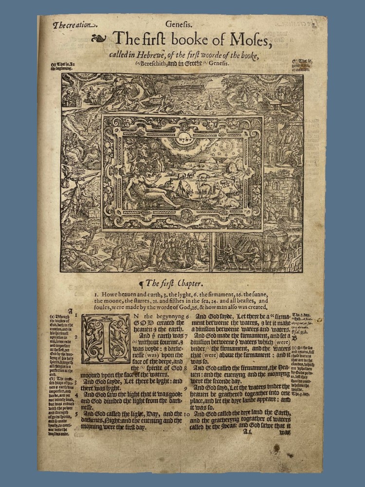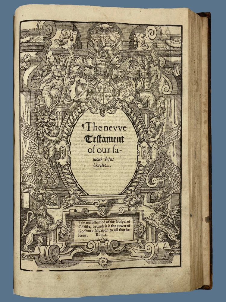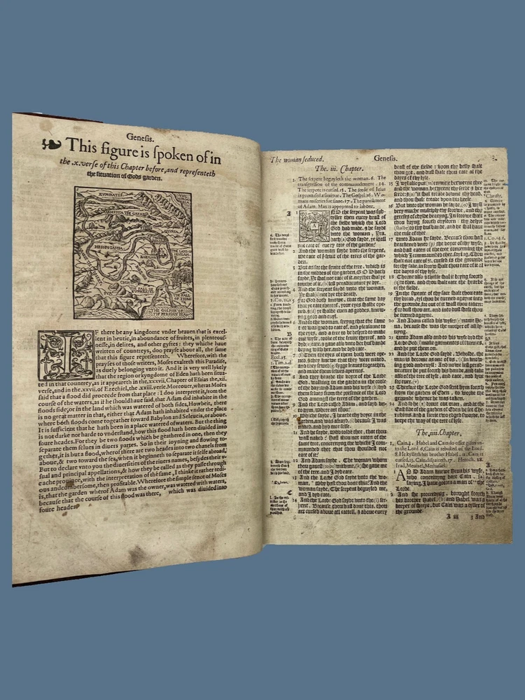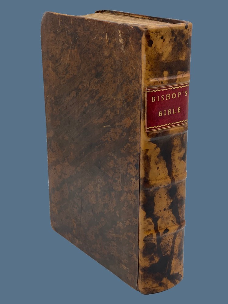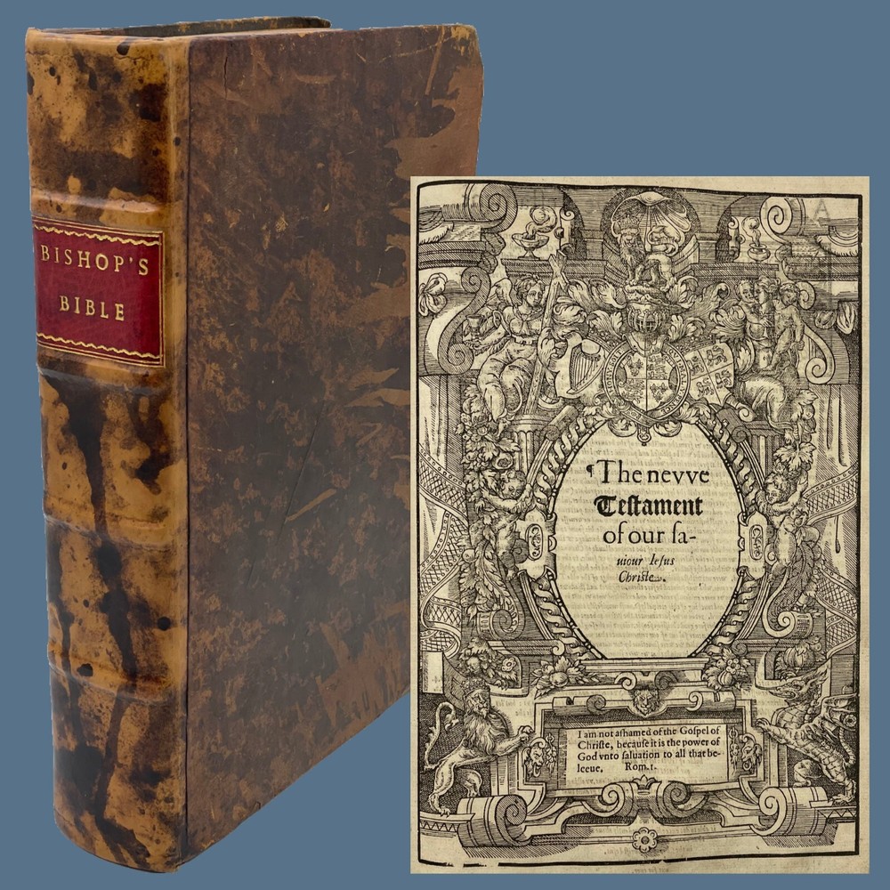 The Holy Byble, Conteynyng the Olde Testament and the Newe. Summary: London: Richard Jugge, 1574. Folio (13 x 9 in). The third folio edition of the Bishops’ Bible, with a fold-out map. Text in attractive black letter and a good number of woodcuts and four titles. Description: 26 out of 28 preliminary leaves present, with Calendar printed in red and black. Lacks general title but all four other title pages are present. Printed in smaller type than the 1572 folio, but still contains woodcuts as chapter summaries (Genesis, Exodus, Numbers, Matthew, Mark, Luke, John, etc.) and an additional full-page composite cut before Revelation, and a few maps. First chapter initials and decorated head and tailpieces throughout. Collation: A-M^8, N^6 (Gen-Deut); Aa-Ss^8, Tt^6 (Joshua-Job); Aaa-Sss^8, T^6, V^6 (Psalms-Mal); Aaaa-Mmmm^8, Nnnn^6 (Apocrypha); A-Q^8, R^6 (New Testament). Lacks general title and R4-R6 (last three leaves). With two page fold-out map of New Map of Places Mentioned in the New Testament bound at front, but lacks the two page fold-out maps in Exodus and Joshua. Binding: Rebacked in marbled calf with old marbled sheep covers laid on. Front cover with some surface loss. Spine with four raised bands and a red gilt-lined label with the words “Bishop’s Bible.” Plain endpapers. Condition: Generally a very good copy with marginal notes occasionally shaved; Occasional staining to the top and bottom margins (e.g. D3-D6, K6-K8); some browning; Aii (Matt 1) piece torn from inner column with loss of a few verses; B4 closed tear to outer edge just touching the text and through several notes; C1 long closed tear through most of the inner portion of the leaf without loss; G7 closed tear to bottom of inner column through 18 lines; M7 closed tear with loss to the first several lines of text to both columns; bookplate of Zion Research Library on front pastedown. Note: The third folio edition of the Bishops’ Bible. Printed in smaller type with 63 lines to the column. After the first folio, which contains over 120 woodcuts, the number of woodcuts in the Bishops’ Bible gradually decreases. The third folio still contains a good number of cuts, and the fold-out map at the beginning of this copy is quite nice. References: Herbert 137; STC 2109; ESTC S107032; Luborsky & Ingram 2109. Shipping Free domestic shipping via UPS 2nd Day Air. International shipping at cost. Returns We work hard to meet our ethical responsibility to describe our material accurately. All items are guaranteed as described and may be returned for any reason within 10 days of receipt. Please notify us before mailing a return. Books must be returned in the same condition to be eligible for a full refund. Buyer is responsible for securely packing, shipping, and insuring returned items. Terms and Conditions All photographs are of the actual item for sale. We are happy to provide additional photographs on request. We guarantee the authenticity of our items. All materials are original (meaning not facsimiles or reproductions) unless otherwise noted. We are members of the Independent Online Booksellers Association and uphold their Code of Ethics. Dungeness Books Books in all fields with an emphasis in antiquarian Bibles and theology. Located in Holland, MI.