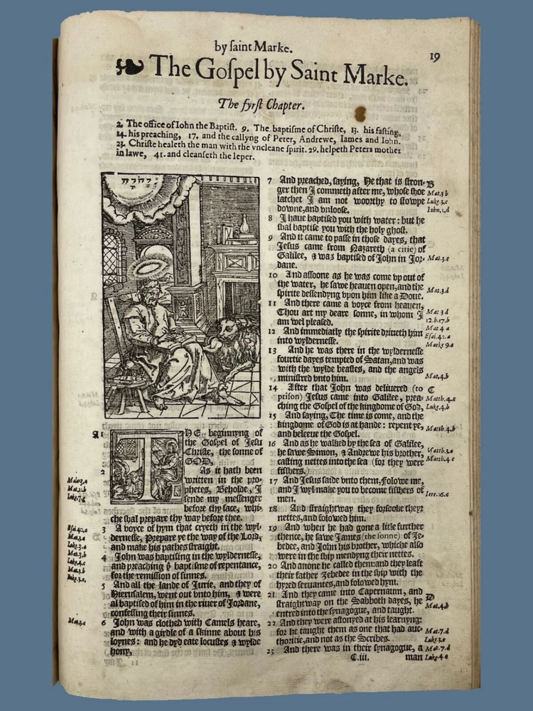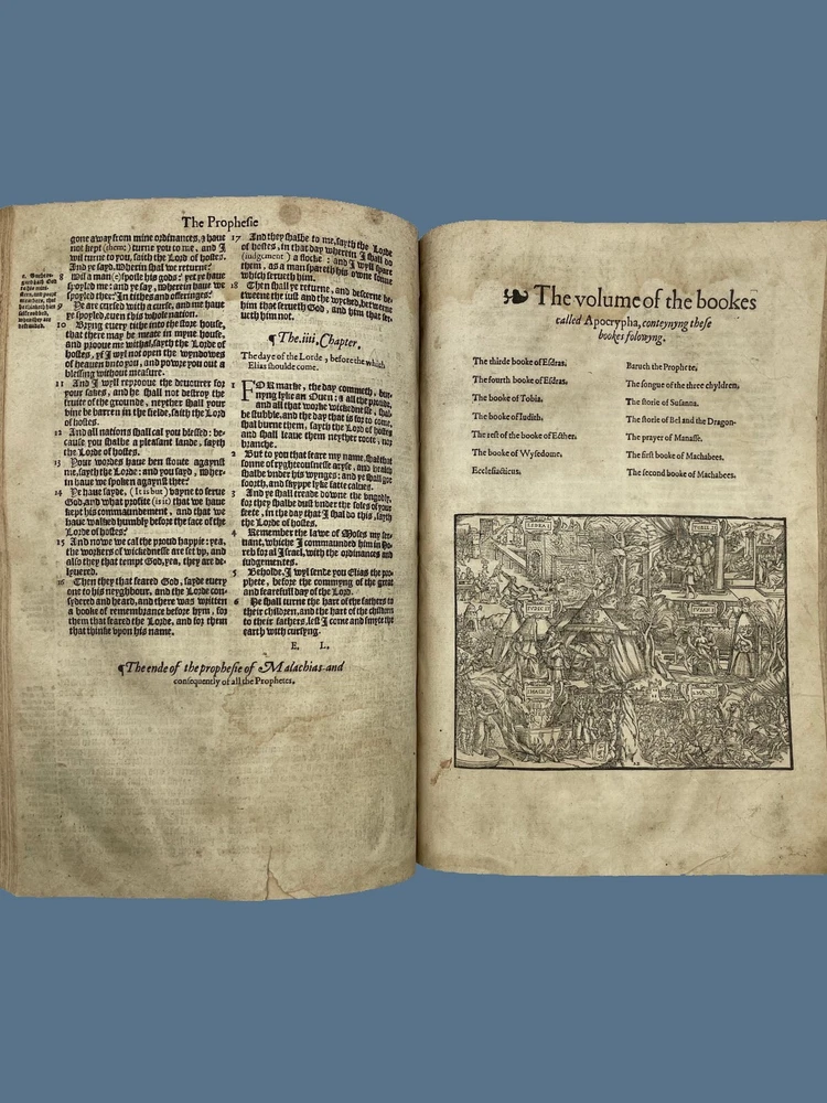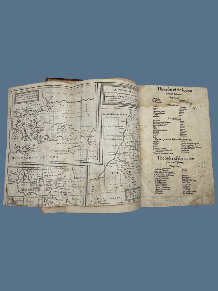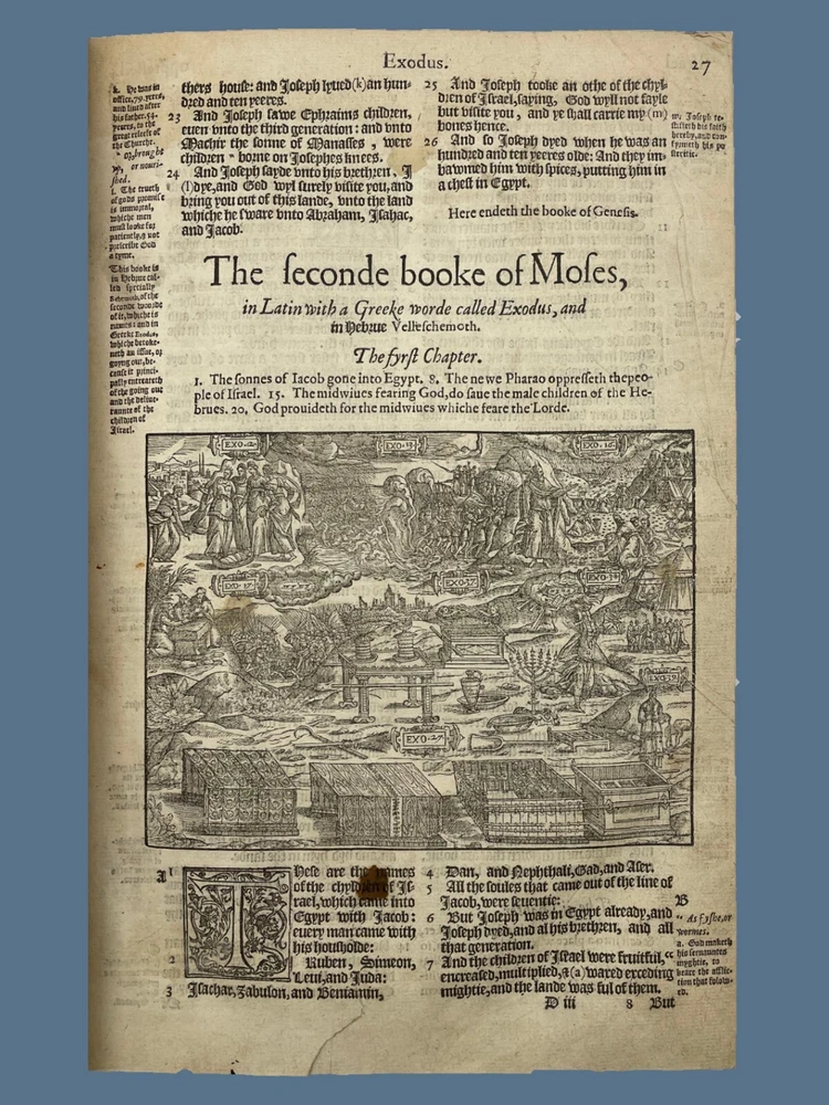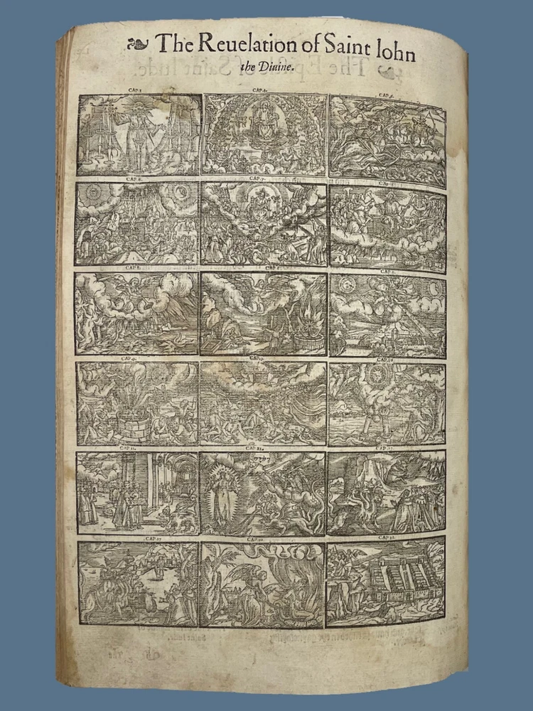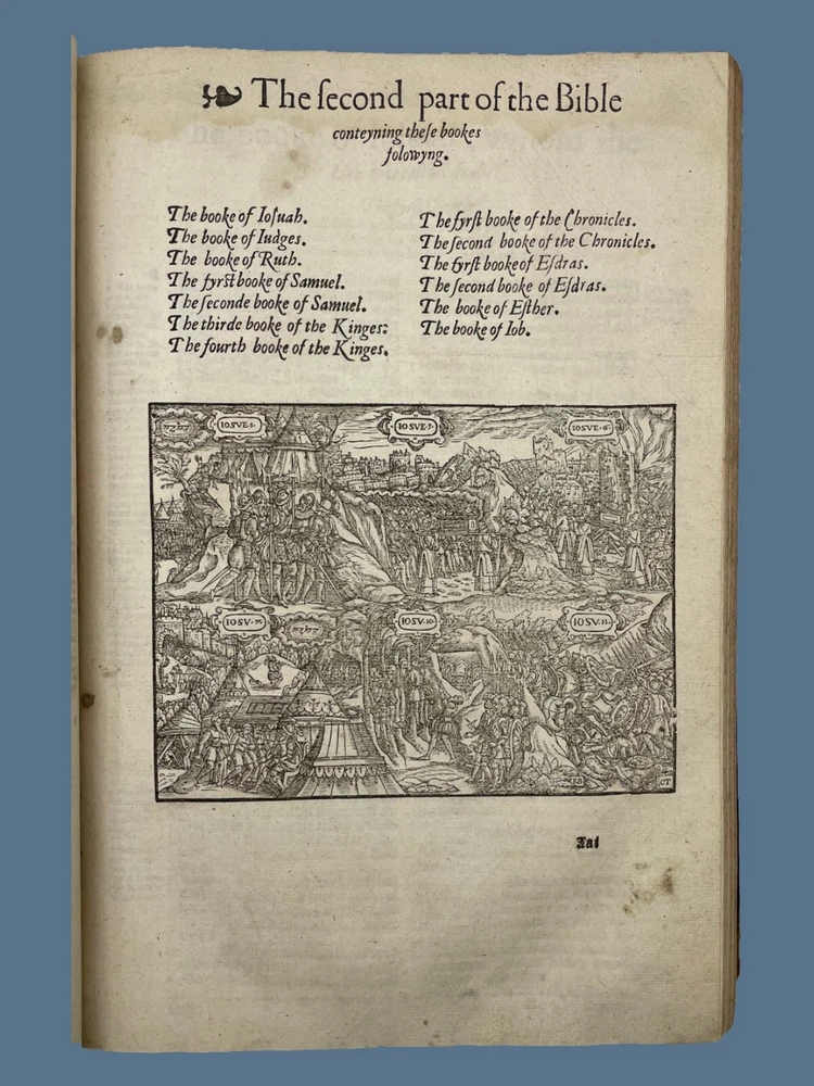 The Holy Byble, Conteynyng the Olde Testament and the Newe. Summary: London: Richard Jugge, 1574. Folio (13 x 9 in). The third folio edition of the Bishops’ Bible, with a fold-out map. Text in attractive black letter and a good number of woodcuts and four titles. Description: 26 out of 28 preliminary leaves present, with Calendar printed in red and black. Lacks general title but all four other title pages are present. Printed in smaller type than the 1572 folio, but still contains woodcuts as chapter summaries (Genesis, Exodus, Numbers, Matthew, Mark, Luke, John, etc.) and an additional full-page composite cut before Revelation, and a few maps. First chapter initials and decorated head and tailpieces throughout. Collation: A-M^8, N^6 (Gen-Deut); Aa-Ss^8, Tt^6 (Joshua-Job); Aaa-Sss^8, T^6, V^6 (Psalms-Mal); Aaaa-Mmmm^8, Nnnn^6 (Apocrypha); A-Q^8, R^6 (New Testament). Lacks general title and R4-R6 (last three leaves). With two page fold-out map of New Map of Places Mentioned in the New Testament bound at front, but lacks the two page fold-out maps in Exodus and Joshua. Binding: Rebacked in marbled calf with old marbled sheep covers laid on. Front cover with some surface loss. Spine with four raised bands and a red gilt-lined label with the words “Bishop’s Bible.” Plain endpapers. Condition: Generally a very good copy with marginal notes occasionally shaved; Occasional staining to the top and bottom margins (e.g. D3-D6, K6-K8); some browning; Aii (Matt 1) piece torn from inner column with loss of a few verses; B4 closed tear to outer edge just touching the text and through several notes; C1 long closed tear through most of the inner portion of the leaf without loss; G7 closed tear to bottom of inner column through 18 lines; M7 closed tear with loss to the first several lines of text to both columns; bookplate of Zion Research Library on front pastedown. Note: The third folio edition of the Bishops’ Bible. Printed in smaller type with 63 lines to the column. After the first folio, which contains over 120 woodcuts, the number of woodcuts in the Bishops’ Bible gradually decreases. The third folio still contains a good number of cuts, and the fold-out map at the beginning of this copy is quite nice. References: Herbert 137; STC 2109; ESTC S107032; Luborsky & Ingram 2109. Shipping Free domestic shipping via UPS 2nd Day Air. International shipping at cost. Returns We work hard to meet our ethical responsibility to describe our material accurately. All items are guaranteed as described and may be returned for any reason within 10 days of receipt. Please notify us before mailing a return. Books must be returned in the same condition to be eligible for a full refund. Buyer is responsible for securely packing, shipping, and insuring returned items. Terms and Conditions All photographs are of the actual item for sale. We are happy to provide additional photographs on request. We guarantee the authenticity of our items. All materials are original (meaning not facsimiles or reproductions) unless otherwise noted. We are members of the Independent Online Booksellers Association and uphold their Code of Ethics. Dungeness Books Books in all fields with an emphasis in antiquarian Bibles and theology. Located in Holland, MI.
