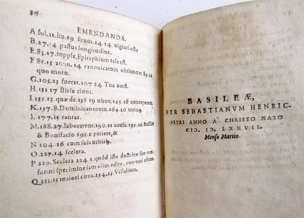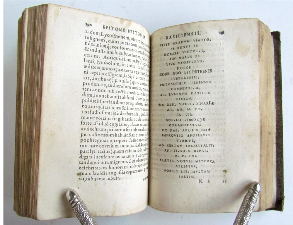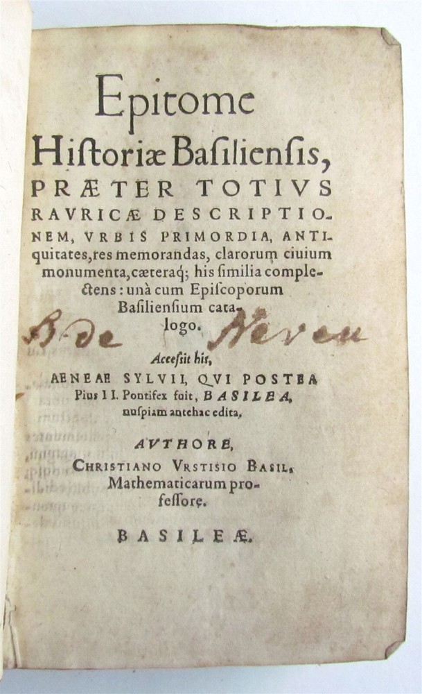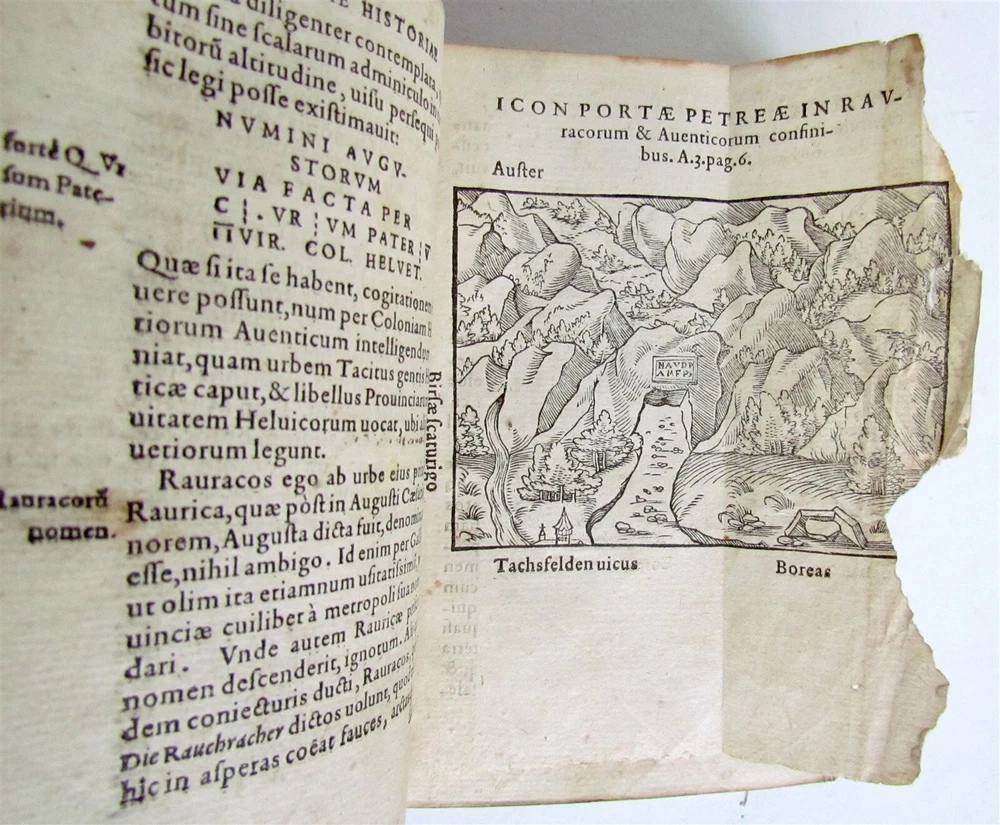 Epitome historiae Basiliensis, praeter totius Rauricae descriptionem, urbis primordia, antiquitates, res memorandas... complectens. 2 parts in 1 vol. Basel, Henricpetri ; 1577 Early city history of city of Basel. The woodcuts with a map of Basel and "Icon portae Petreae in Ravracorum & Auenticorum confinibus" (with marginal defects) printer's mark at the colophon 12 lvs, 308, 30 pages, 1 leaf 18th century binding with leather spine Good condition, minor wear First edition, rare. Size 4 by 6 1/4" Text in Latin ========================= Powered by SixBit's eCommerce Solution