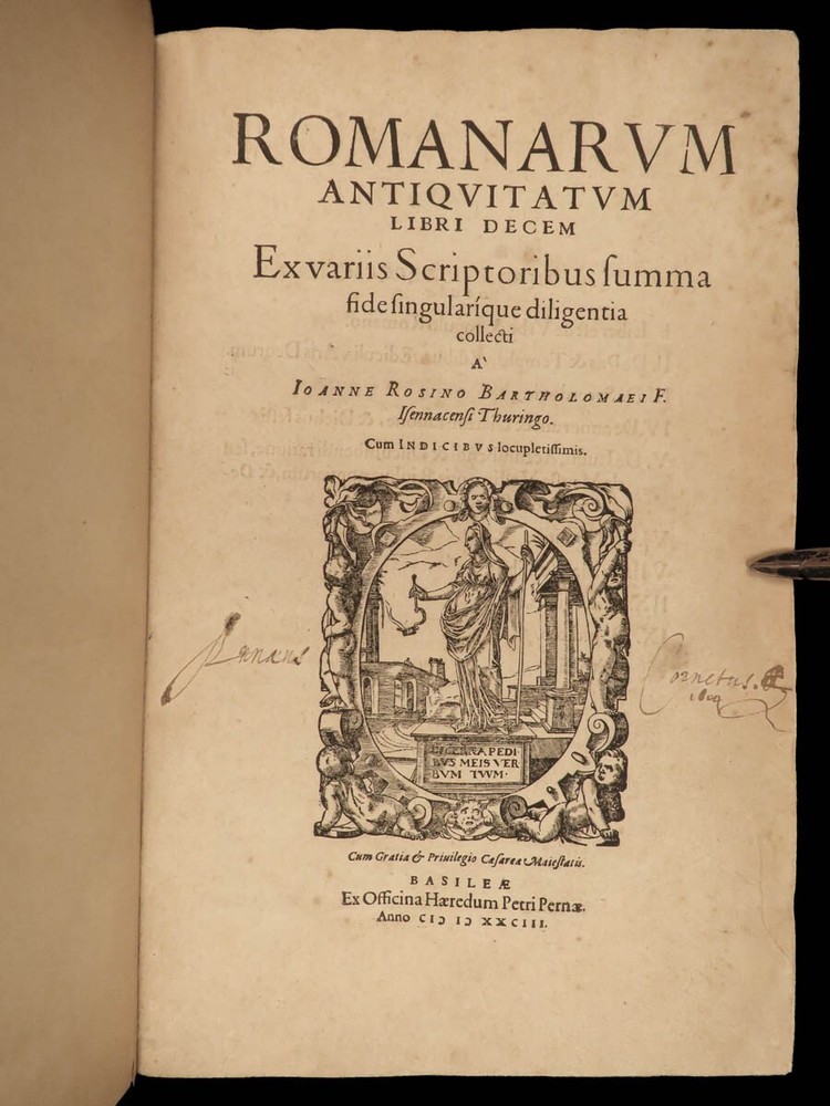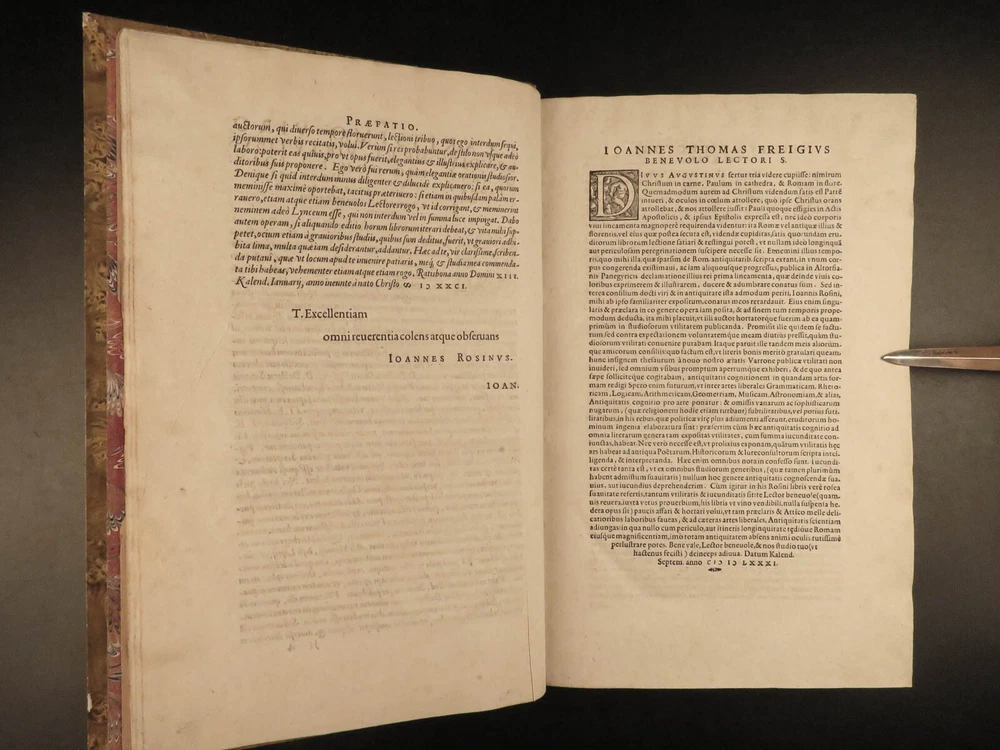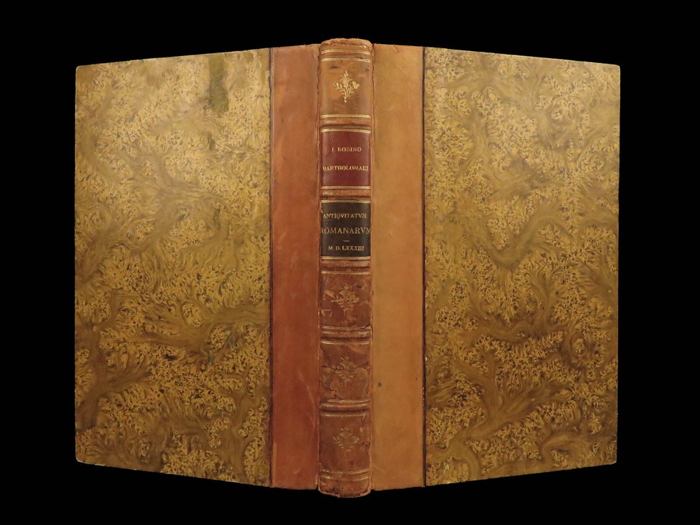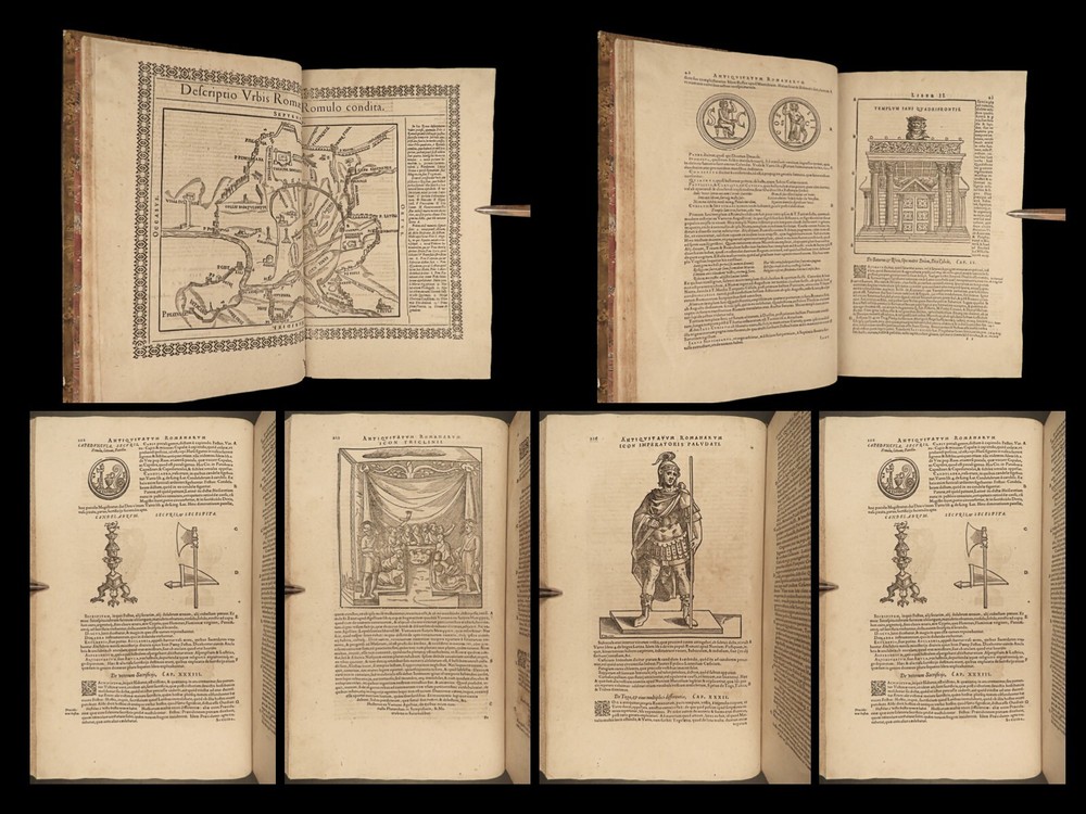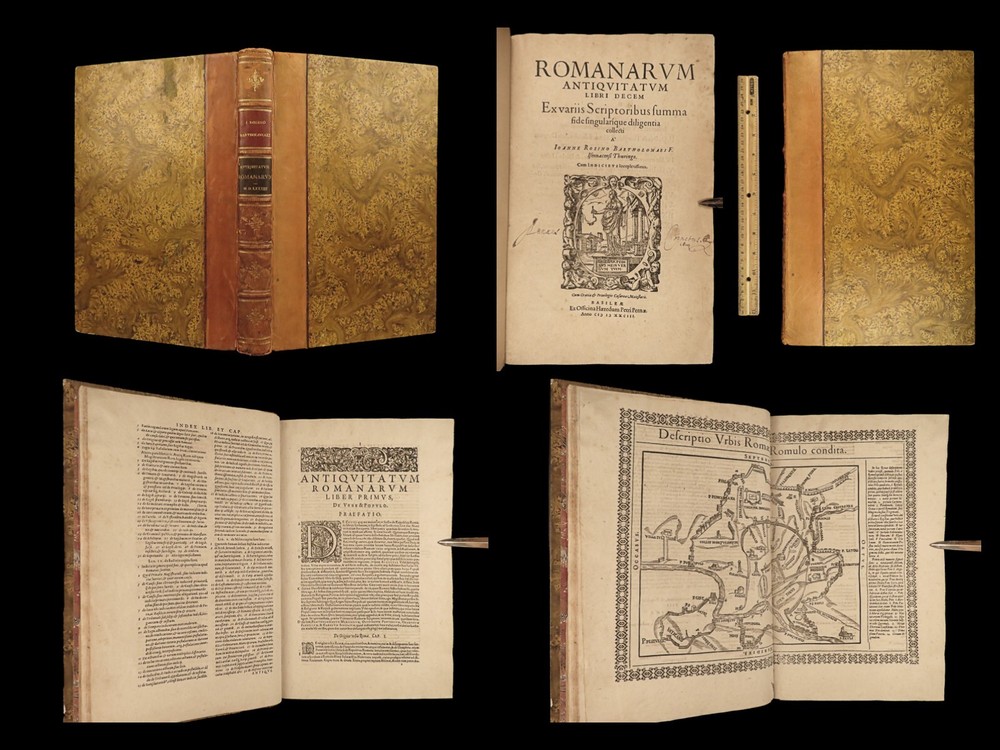 1583 Rosinus Roman Antiquities ROME MAP Constantine Julius Caesar Plato Pliny Johannes Rosinus’s “ Antiquitatum Romanarum ” was an extensive historical work on Roman antiquities. This impressive 1583 edition includes illustrations that depict iconic Roman monuments, architecture, coins and medals, and a map. Other notable descriptions include life of Albertus Magnus, works of Aldus Manutius , Anacharsis, Aristotle, Charles V, Gregorian Codex, Popes, Constantine, Chrysologus, Cicero, Julius and Augustus Caesar, Plato, Pliny the Younger, Socrates, Valerius Maximus, Virgil, Thomas More , Thucydides, and many more . Item number: #22954 Price: $1500 ROSINUS, Johannes Romanarum antiquitatum, libri decem : ex variis scriptoribus summa, fide singularique diligentia Basileae : Ex Officina Haeredum Petri Pernae [per Konrad von Waldkirch], 1583. Details : · Collation: Complete with all pages o [24], 491, [65] o 39 woodcut engravings throughout, plus numerous illustrated initials · References: USTC 691415 · Language: Latin · Binding: Leather; tight and secure · Size : ~13in X 8.5in (33cm x 22cm) Our Guarantee: Very Fast. Very Safe. Free Shipping Worldwide. Customer satisfaction is our priority! Notify us with 7 days of receiving, and we will offer a full refund without reservation! 22954