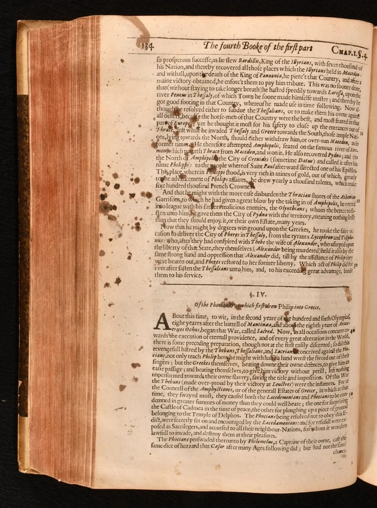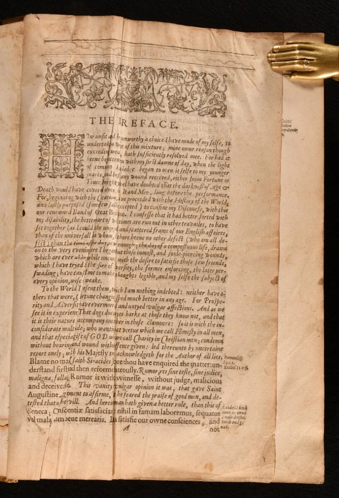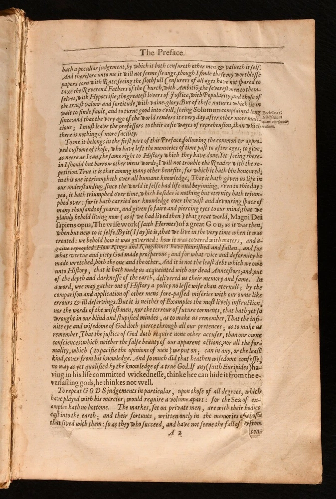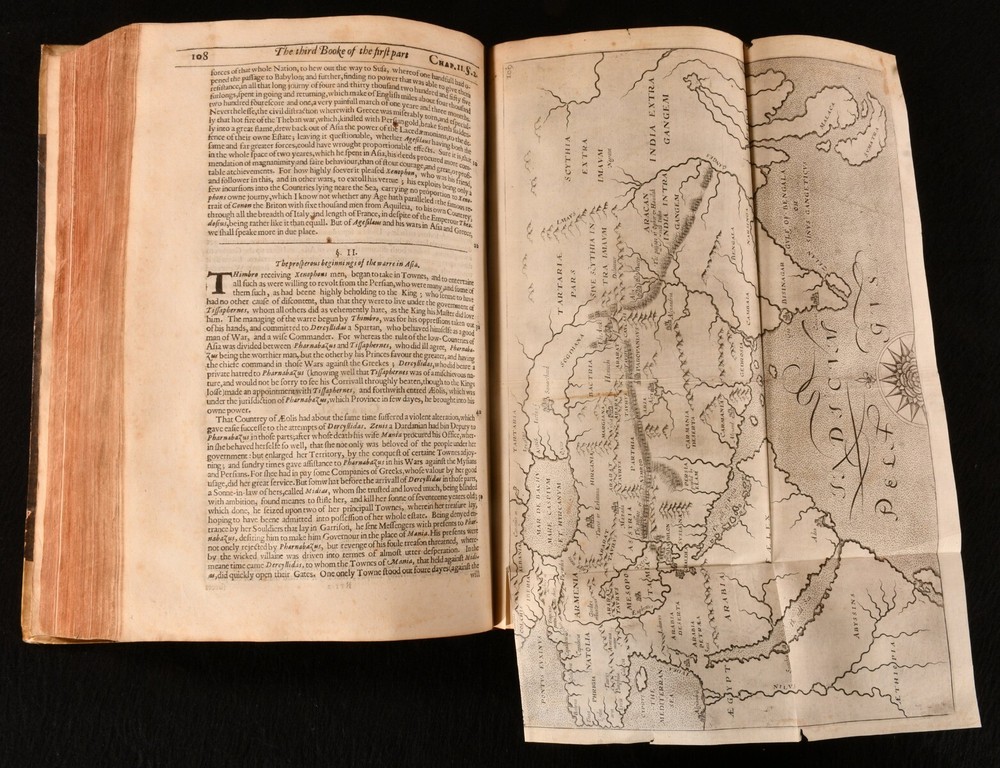 Click here to see our other books! US Buyers Please Note - The new tariffs do not affect books! The Historie of the World, In Five Bookes. 1 Intreating of the Beginning and first Ages of the same, from the Creation unto Abraham. 2 Of the Times from the Birth of Abraham, to the destruction of the Temple of Saloman. 3 From the destruction of Jerusalem, to the time of Philip of Macedon. 4 From the Reigne of Philip of Macedon, to the establishing of that Kingdome, in the Race of Antigonus. 5 From the Settled rule of Alexanders Successors in the East, untill the Romans (prevailing over all) made Conquest of Asia and Macedon. Sir Walter Raleigh 1634 Walter Burre; G. Lathum; R. Young : London 13.5" by 8.5" [66], 1-555, 1-669, 55pp. SUMMARY A comprehensive seventeenth-century work detailing the history of the world, by Sir Walter Raleigh. Folding Maps,Illustrated,Leather Binding,Rebound,Scarce Overall Condition: Good This book weighs 5 KG when packed UK Postage: £ 4.49 US Postage: £ 42.99 EU Postage : £ 27.99 European Postage: £ 45.99 Asia Postage: £ 74.99 Worldwide Postage: £ 129.99 DESCRIPTION The scarce fifth edition. The first edition was published in 1614. Rebound in half vellum. Endpapers renewed and blanks discarded. With an engraved, 'Minde of the Front', poem to the front of the book, a beautiful engraved title page dated 1614, a portrait illustration to the title page and six folding maps. Lacking the first map, on page 56, and the fourth map on page 218. Minde of the Front leaf closely trimmed and laid down. Title page laid down. Final leaf laid down. The occasional archival repair throughout. Sir Walter Raleigh's most important and influential work. Written during his imprisonment in the Tower of London. It was originally intended to be a multi-volume set which would help educate Henry, Prince of Wales, but following the Prince's death in 1612, Raleigh had to bring the project to completion. This work details the history of the world, with a strong foundation in the Bible. Other topics listed include Ancient Greece, Alexander the Great, the Punic wars and the Macedonian Wars. Sir Walter Raleigh was an English statesman, soldier, writer and explorer from the Elizabethan era. He is best known for his leading involvement in the colonisation of North America, as well as for his praised defence against the Spanish Armada. With a chronological table of twenty-six pages to the rear of the book, followed by twenty-six pages of alphabetical tables. With an ink inscription listing the plates to the front paste-down, and another inscription to the title page. ESTC CItation No. S116304 CONDITION Rebound in half vellum. Externally, a trifle rubbed with rubbing to the extremities and marks to the boards, heavier to the rear board. Spine is darkened. Rear hinge strained but firm. Ink inscription to the front paste-down and small ink mark to the reverse of the front free endpaper. Age-toning and handling marks to the paste-downs and free endpapers. Light spotting to the rear paste-down and free endpaper. Internally, lacking two folding maps, binding slightly strained but still very firm. Age-toning throughout. Offsetting and spotting to the leafs. Handling marks and scattered spots throughout. Light offsetting towards the front of the book. The occasional closed tear or chipping throughout. Tear of about 2.5 inches to A2 of the preface. Large closed tear of about 8 inches to page 63 of the first paging. Ink marks to the title page, with the occasional ink mark throughout. Creasing to the first page of the preface. Ink splatters between pages 130 to 144 of the second paging. Age-toning, spotting and the occasional ink mark to the folding maps. Overall Condition: Good GLOSSARY OF TERMS Overall Condition (Dustwrapper condition rating is shown after that for the book itself, where a dustwrapper is present) Fine - Very well preserved copy showing very little wear Very Good Indeed - Only one or two minor faults, really a very attractive copy Very Good - Quite a wide term meaning no major faults but probably several smaller ones often expected given the age of the book, but still a respectable copy Good - Meaning not very good. Some more serious faults as will be described in the condition report under 'condition' Good Only - Meaning one or more faults that could really do with repair Fair - As with good only above but with other faults leaving a compromised copy even after repair Poor - Really bad and possibly seriously incomplete. We only sell books in this condition where their rarity or value makes them attractive none the less. Major defects will be described. GUARANTEE We offer a full money back guarantee on our descriptions. Please ask for details and conditions. We prefer PAYPAL. If you pay via PAYPAL we will post the item off the same or the next working day with the postage you have selected. Please note we cannot accept USD cheques