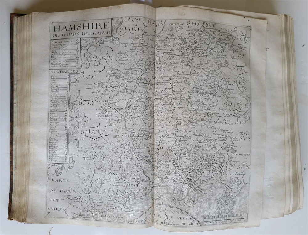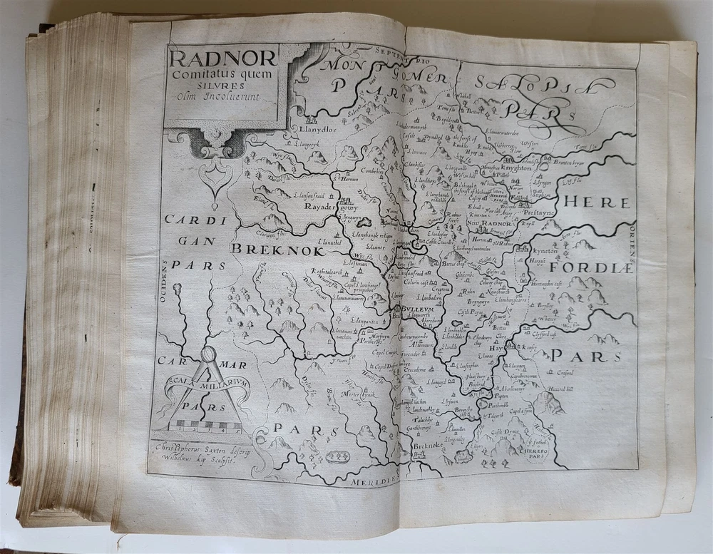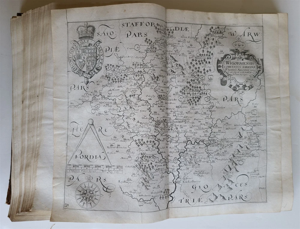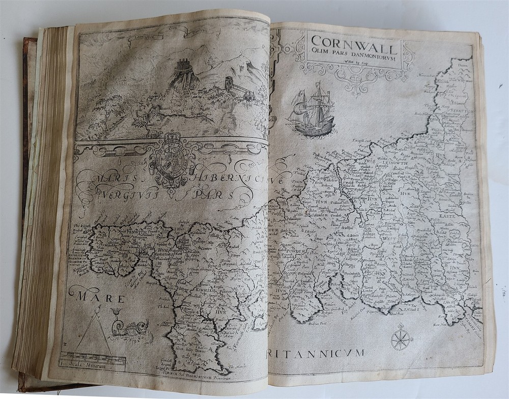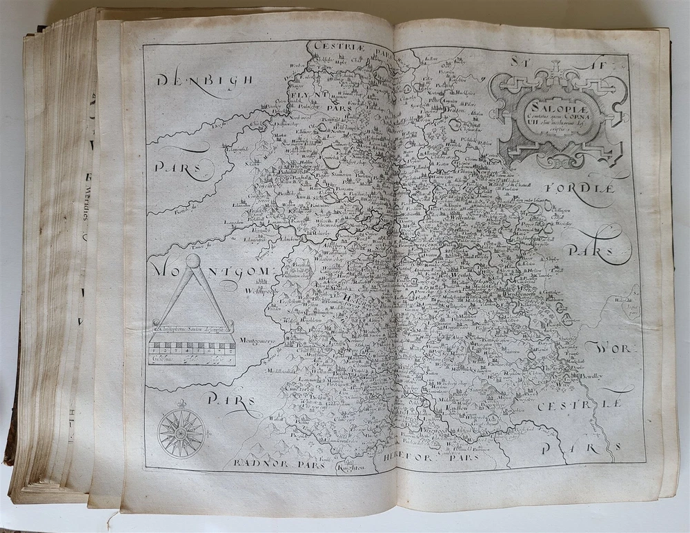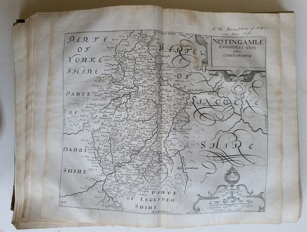 Camden, William Britain, or A chorographicall description of the most flourishing kingdomes, England, Scotland, and Ireland, and the ilands adjoyning, out of the depth of antiquitie beautified vvith mappes of the severall shires of England: vvritten first in Latine by William Camden Clarenceux K. of A. Translated newly into English by Phile´mon Holland Doctour in Physick: finally, revised, amended, and enlarged with sundry additions by the said author. London, Printed by F. K[ingston] R. Y[oung] and I. L[egatt] for Ioyce Norton, and Richard Whitaker; 1637 Second edition. 48 (of 57) engraved maps; 8 plates of Roman and Britons coins, engravings and woodcuts within text. Folio: 9 by 13" Original calf; lacking 9 maps, preliminary leaves, additional engraved title and final 9 leaves of index, Middlesex map skilfully laid down Front cover detached (but present) Front endpaper with period manuscript Index ====================== This is the second edition of Camden's Britannia with English text, translated from Latin by Philemon Holland. The majority of the maps are based on Christopher Saxton's monumental survey of England and Wales. Each map is finely engraved with handsome embellishments, such as elaborate title cartouches, large compass roses, and decorative distance scales. All of the maps are double-page Text in English ================================ Powered by SixBit's eCommerce Solution