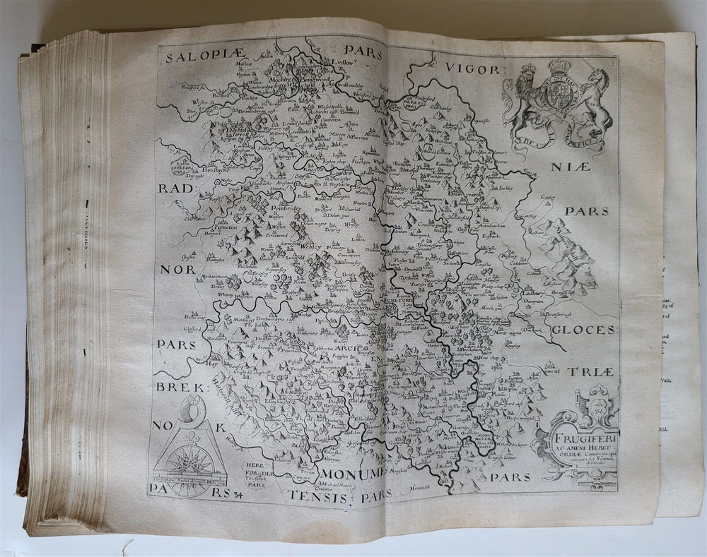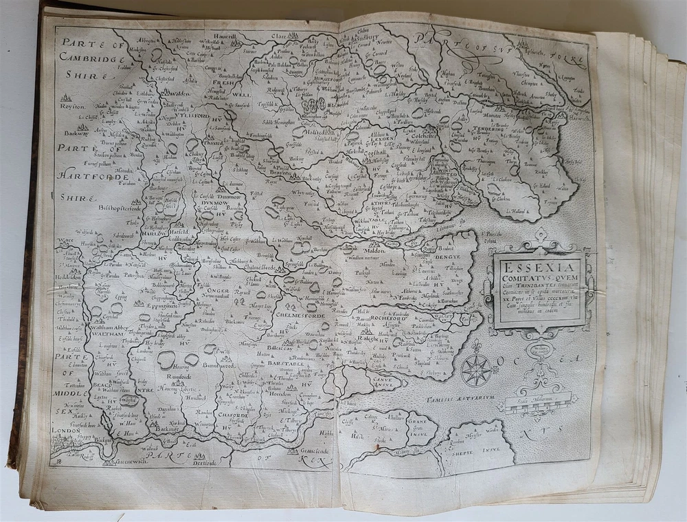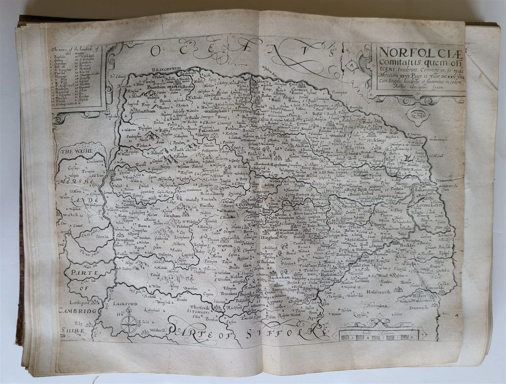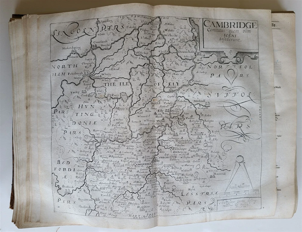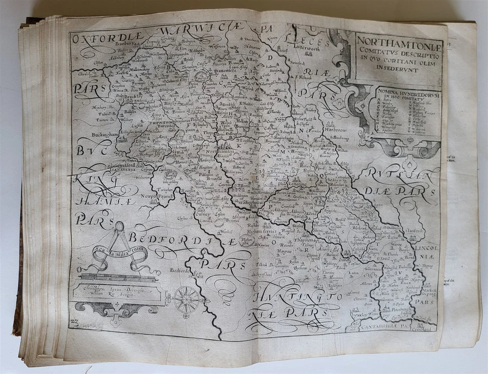 Camden, William Britain, or A chorographicall description of the most flourishing kingdomes, England, Scotland, and Ireland, and the ilands adjoyning, out of the depth of antiquitie beautified vvith mappes of the severall shires of England: vvritten first in Latine by William Camden Clarenceux K. of A. Translated newly into English by Phile´mon Holland Doctour in Physick: finally, revised, amended, and enlarged with sundry additions by the said author. London, Printed by F. K[ingston] R. Y[oung] and I. L[egatt] for Ioyce Norton, and Richard Whitaker; 1637 Second edition. 48 (of 57) engraved maps; 8 plates of Roman and Britons coins, engravings and woodcuts within text. Folio: 9 by 13" Original calf; lacking 9 maps, preliminary leaves, additional engraved title and final 9 leaves of index, Middlesex map skilfully laid down Front cover detached (but present) Front endpaper with period manuscript Index ====================== This is the second edition of Camden's Britannia with English text, translated from Latin by Philemon Holland. The majority of the maps are based on Christopher Saxton's monumental survey of England and Wales. Each map is finely engraved with handsome embellishments, such as elaborate title cartouches, large compass roses, and decorative distance scales. All of the maps are double-page Text in English ================================ Powered by SixBit's eCommerce Solution