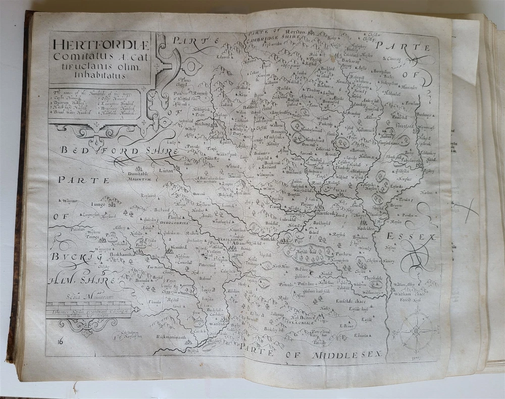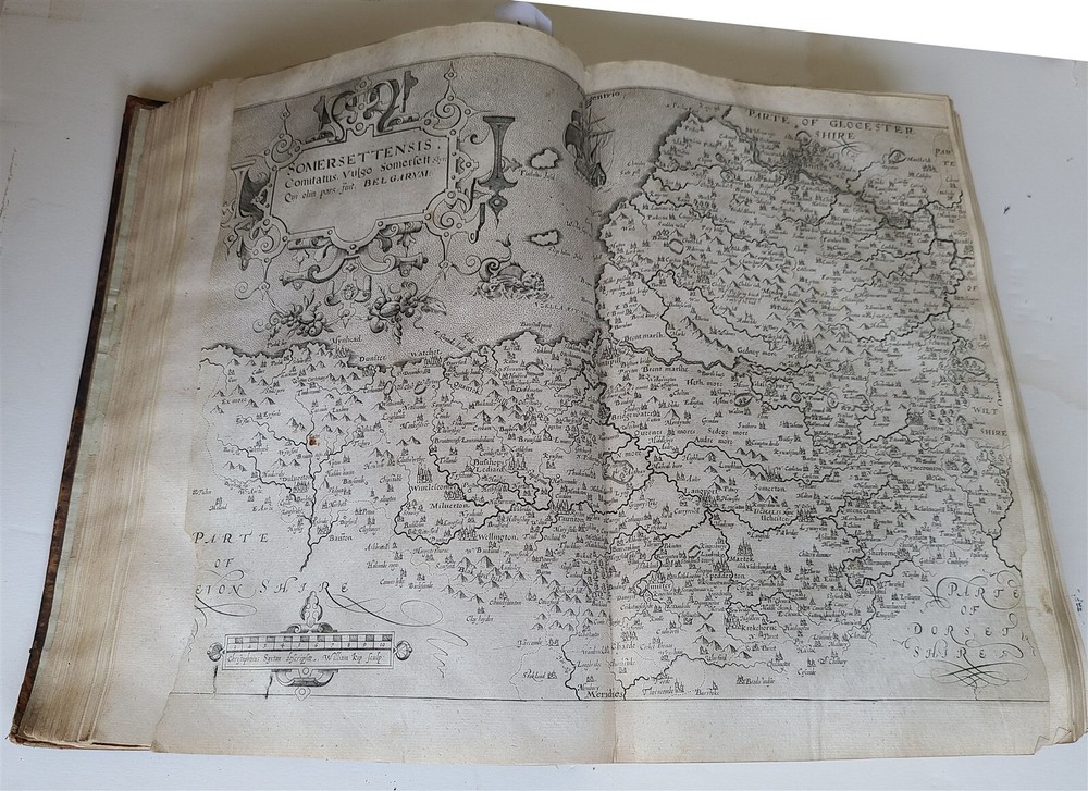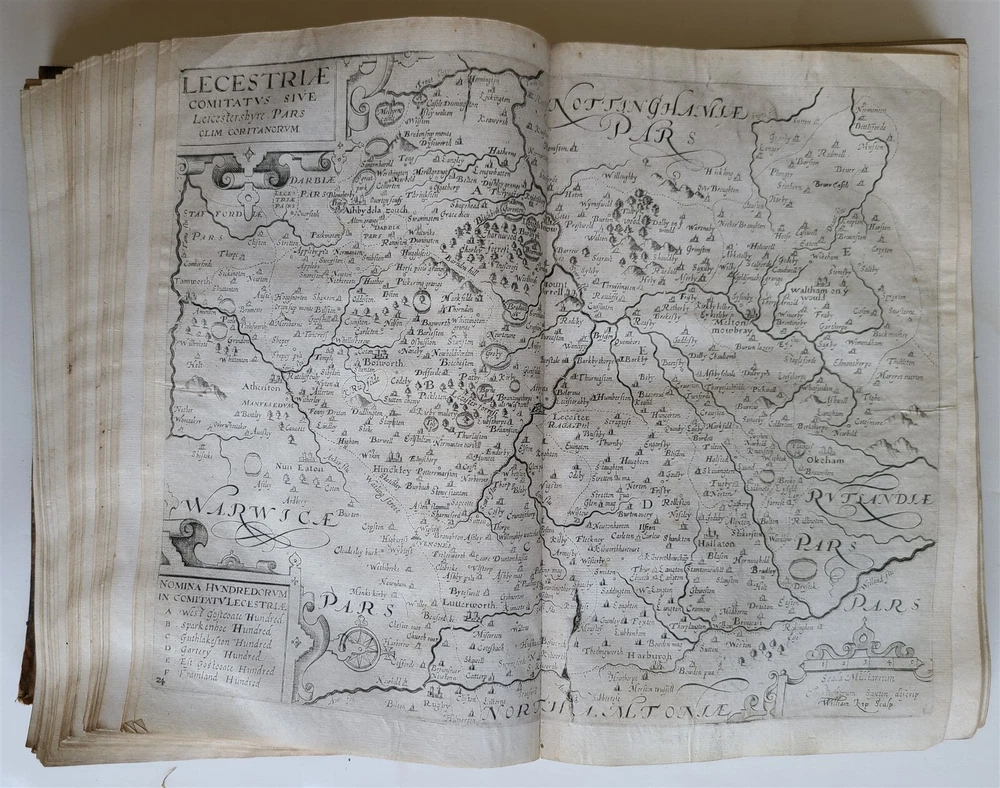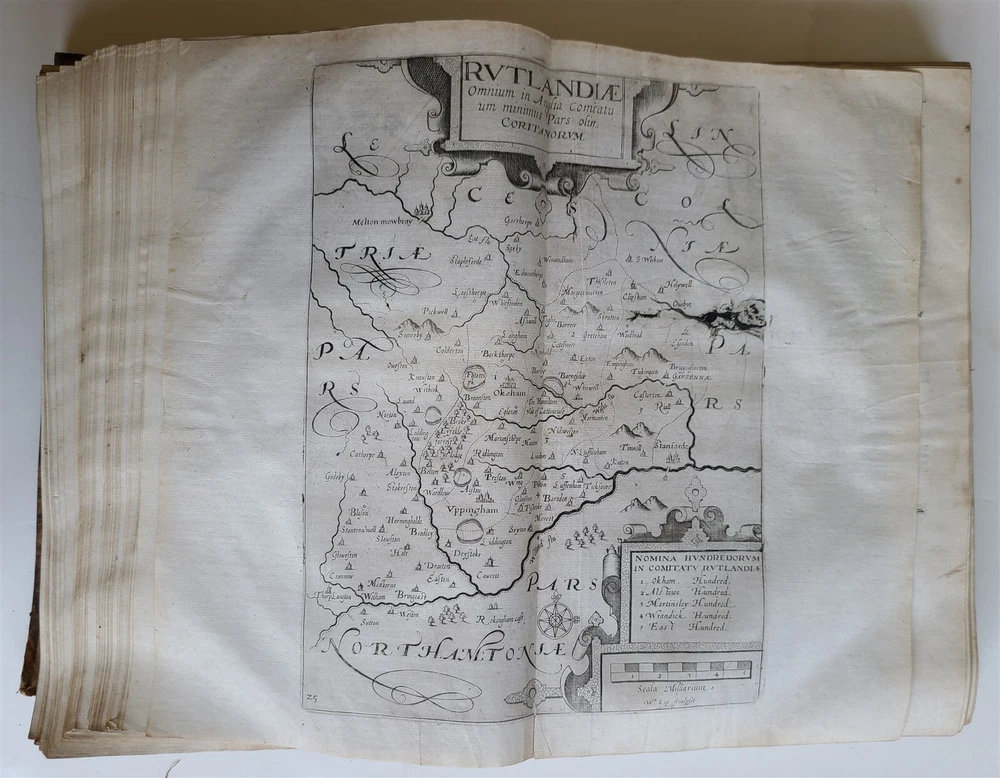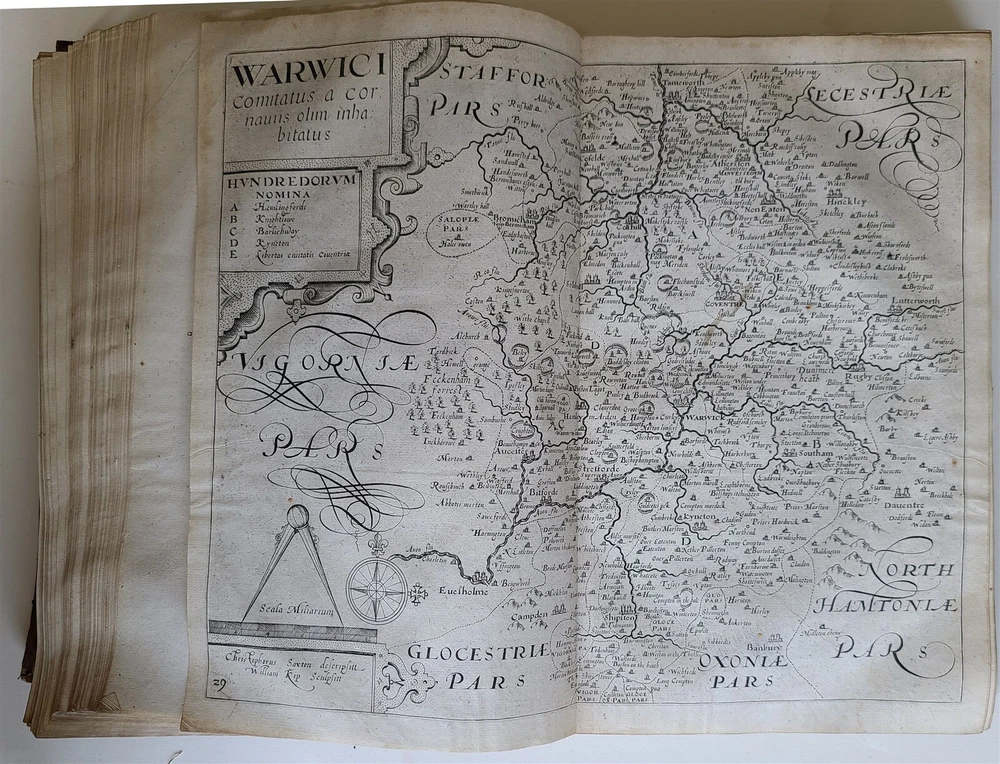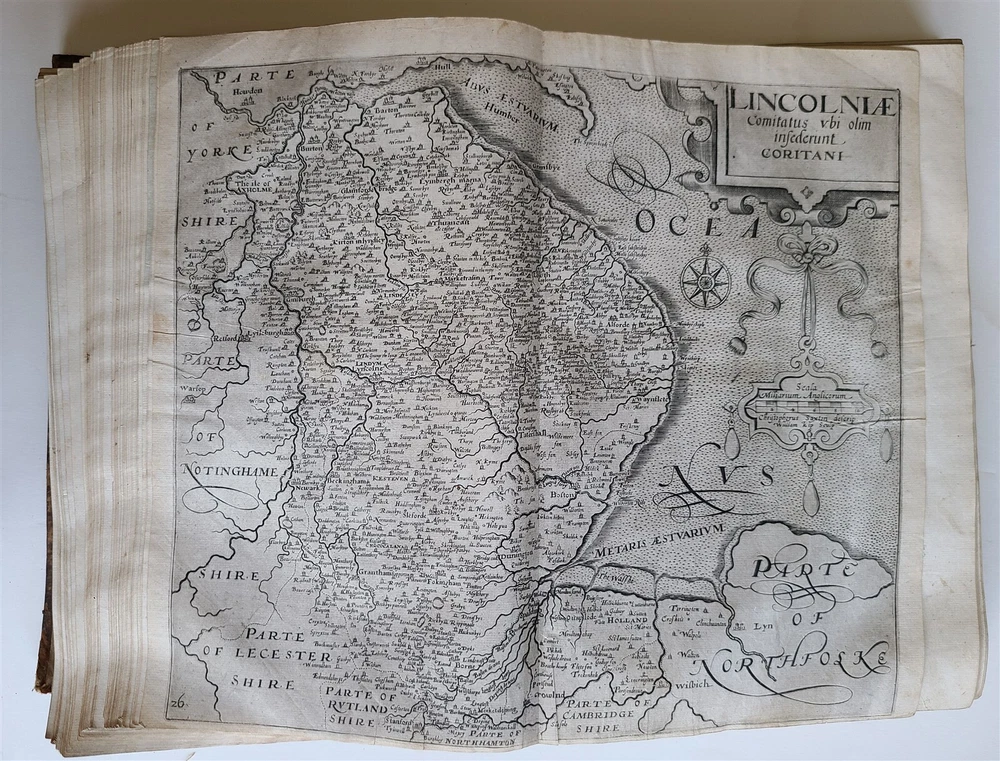 Camden, William Britain, or A chorographicall description of the most flourishing kingdomes, England, Scotland, and Ireland, and the ilands adjoyning, out of the depth of antiquitie beautified vvith mappes of the severall shires of England: vvritten first in Latine by William Camden Clarenceux K. of A. Translated newly into English by Phile´mon Holland Doctour in Physick: finally, revised, amended, and enlarged with sundry additions by the said author. London, Printed by F. K[ingston] R. Y[oung] and I. L[egatt] for Ioyce Norton, and Richard Whitaker; 1637 Second edition. 48 (of 57) engraved maps; 8 plates of Roman and Britons coins, engravings and woodcuts within text. Folio: 9 by 13" Original calf; lacking 9 maps, preliminary leaves, additional engraved title and final 9 leaves of index, Middlesex map skilfully laid down Front cover detached (but present) Front endpaper with period manuscript Index ====================== This is the second edition of Camden's Britannia with English text, translated from Latin by Philemon Holland. The majority of the maps are based on Christopher Saxton's monumental survey of England and Wales. Each map is finely engraved with handsome embellishments, such as elaborate title cartouches, large compass roses, and decorative distance scales. All of the maps are double-page Text in English ================================ Powered by SixBit's eCommerce Solution