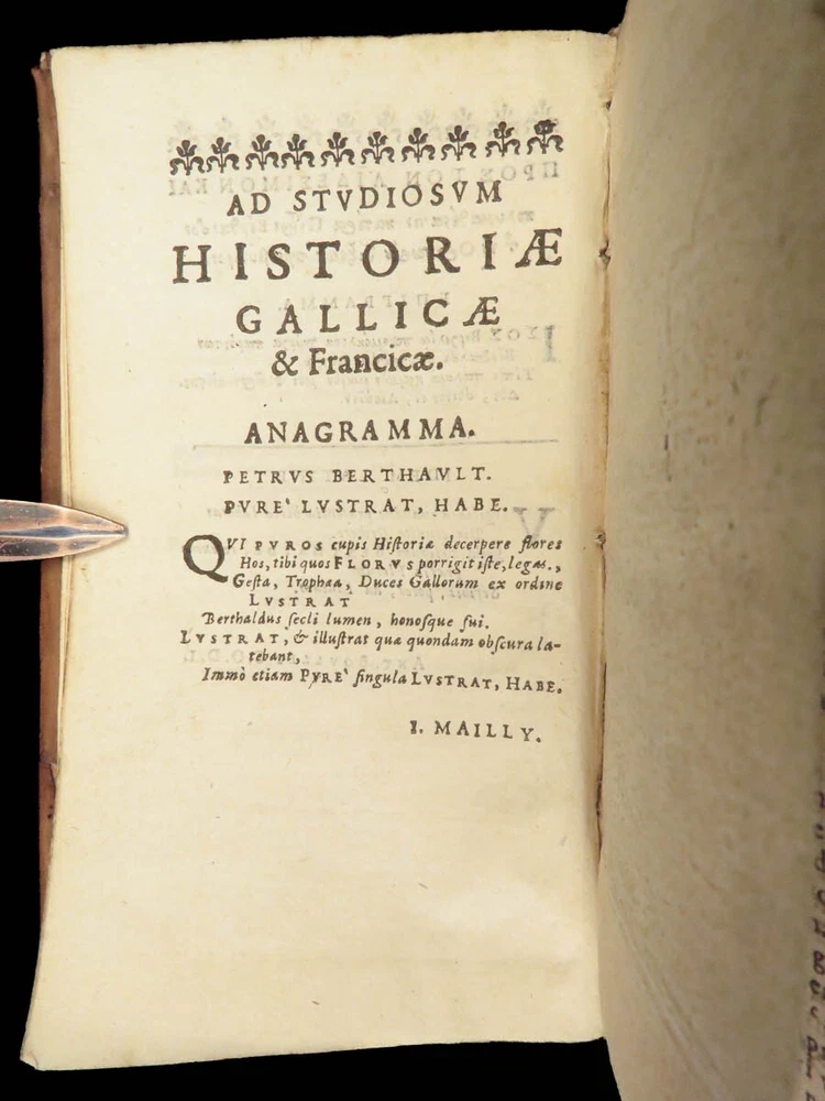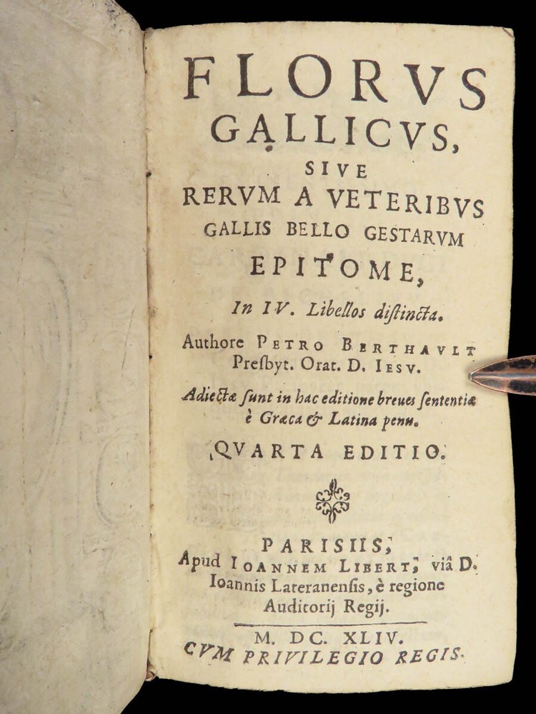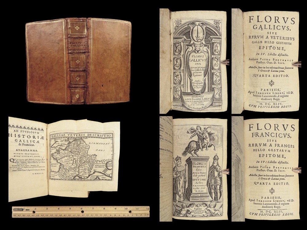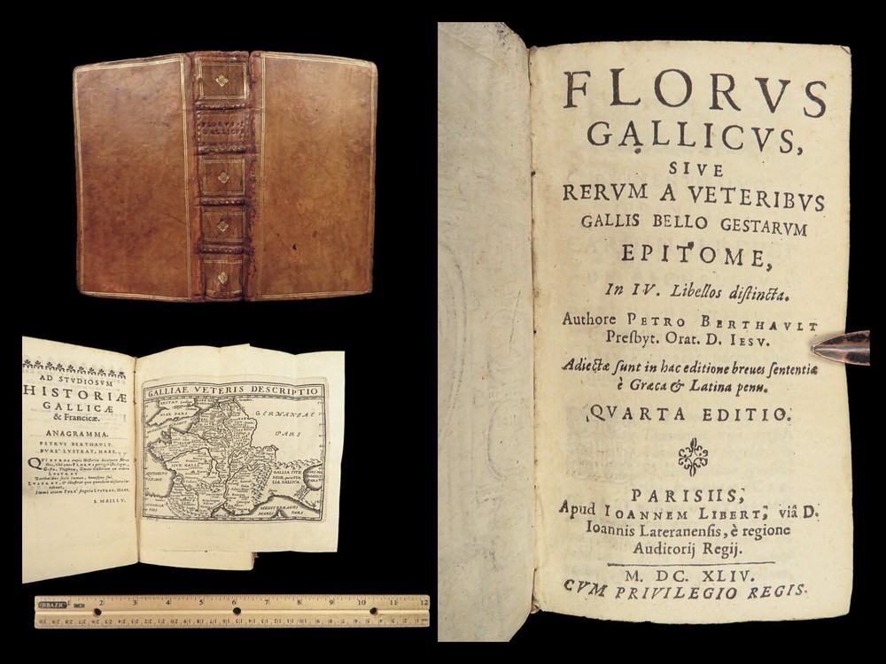 1645 FRANCE Florus Gallicus Pierre Berthault Gaul Franks Saxony ROME Map 2in1 Pierre Berthault’s “ Florus Gallicus ” is a rare, 17 th -century history of France from the earliest of times through the first part of the 1600s. This work covers seemingly every aspect of French history from the early Franks, Gaul, and into the rise of the French Monarchy. It is worth noting that this work features a folding map of France . Item number: #27564 Price: $499 BERTHAULT, Pierre Florus gallicus, sive, Rerum a veteribus Gallis bello gestarum epitome, in IV Parisiis: Apud Ioannem Libert, viâ D. Ioannis Lateranensis, 1645. Details : · Collation: Complete with all pages; 2 parts in 1 o Florus Gallicus – [32], 194 (i.e., 196), 48, [24] o Florus Francicus – [24], 336, 59, [37] o Each part with additional engraved title page · Language: Latin · Binding: Leather; tight and secure · Size: ~5.75in X 3.25in (14.5cm x 8.5cm) Our Guarantee: Very Fast. Very Safe. Free Shipping Worldwide. Customer satisfaction is our priority! Notify us with 7 days of receiving, and we will offer a full refund without reservation!