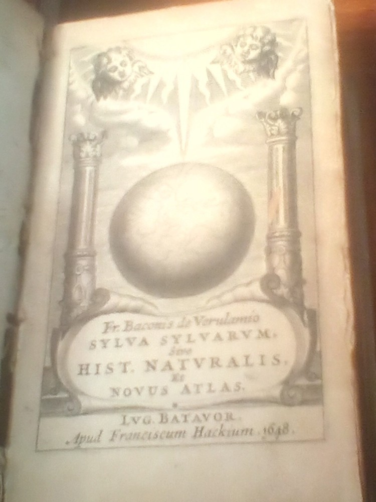 Book from National Library of Naples Pre lineman Works, Utopia. LVG Batavor Translation of Sylva sylvarum: or A naturall historie Engraved t.-p.; first part has separate printed t.-p.: Sylva sylvarum, sive Historia naturalis, in decem centurias distributa, anglicè olim conscripta a Francisco Bacono ... nunc Latio transscripta à Iacobo Grutero, P.F. .. Second part has separate t.-p.: Novus atlas, opus imperfectum, latine conscriptum ab illustri viro Francisco Bacone de Verulamio, &c. cum præfatione W. Ravvley Size 3 inch by 5
