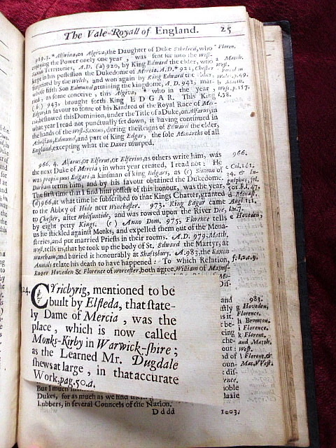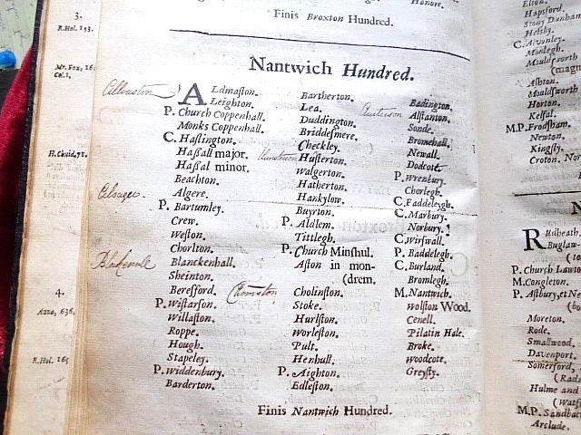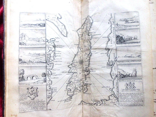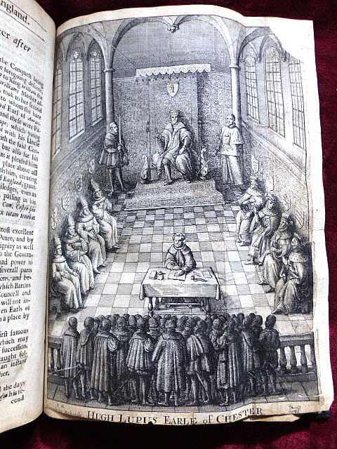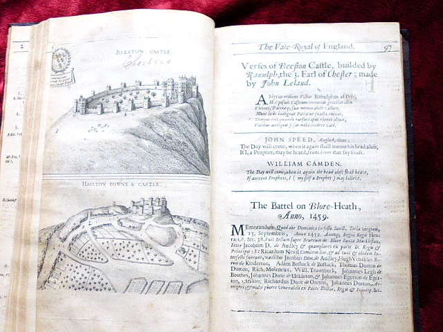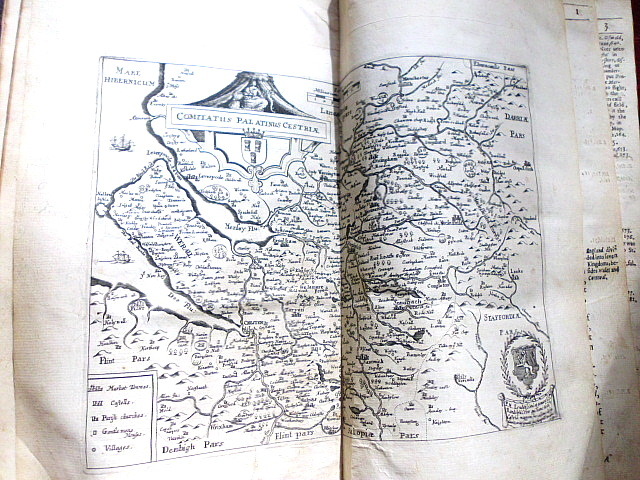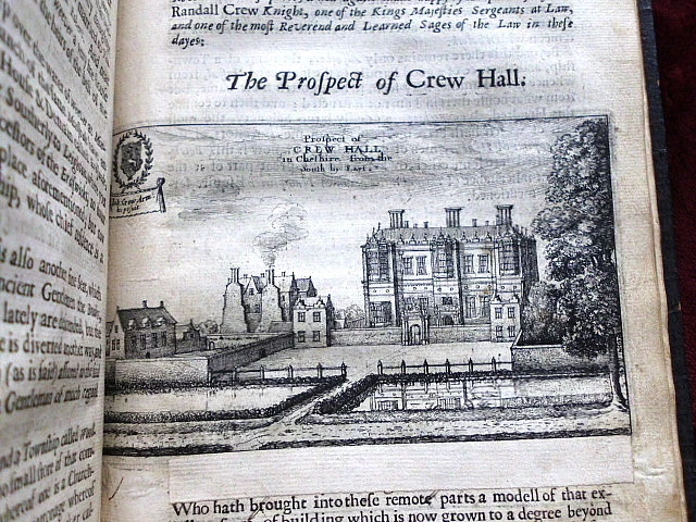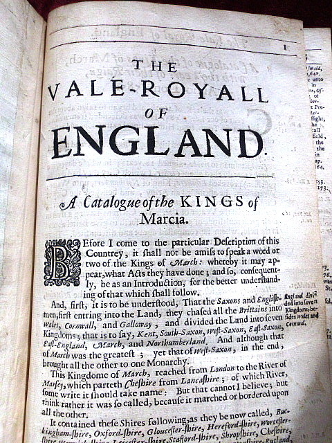 The Vale-Royal of England or, The County Palatine of Chester Illustrated. Wherein is contained a Geographical and Historical Description of that Famous County, with all its Hundreds and Seats of the Nobility, Gentry and Freeholders From 1656, the history and antiquities of the county of Chester in northwestern England, edited and introduced by Daniel King, with material by William Smith, William Webb, and Samuel Lee. Illustrations are by King and Wenceslaus Hollar. This text features a double-page map of the county, three textual illustrations, and two plates. Other copies of this book also include eleven plates with illustrations of coats of arms, but these seem never to have been included in this copy. One of the plate illustrations in this copy, a handsome depiction of the court of Hugh Lupus, Earle of Chester, does not appear in any other copy that I've located online. Also, interestingly, two original errata slips remain present. Additionally, at the end of this volume is A Short Treatise on the Isle of Man by James Chaloner, who was to become governor of the island. This 29-page treatise is illustrated with a coat of arms plate and a double-page map. Condition: The book was rebound in the early 1800s with new endpapers, flyleaves, and title page; the original title page is missing, so that the 1656 text opens on the dedication page. This page shows signs of repair. The covers have wear and some water damage, as seen in the photos; the water staining has almost no effect on the text. There are ownership marks on the front endpaper, dated 1836 and 1932; also some notes by both of these owners on the front and rear flyleaves. The text has scattered soiling and occasional notes in an ancient hand. Both maps have neat paper tape repairs on the reverse. The binding is still holding well but shows cracking in a couple places. On the whole a good copy, considering the book's great age. An extremely rare collector's item in any condition, seldom listing for under $3,000.00 Measures 7" X 11", about 450 pages in all. Ships promptly & securely.