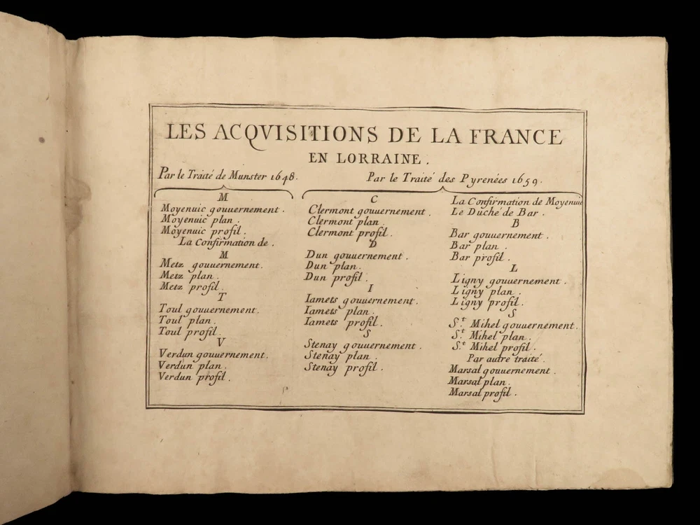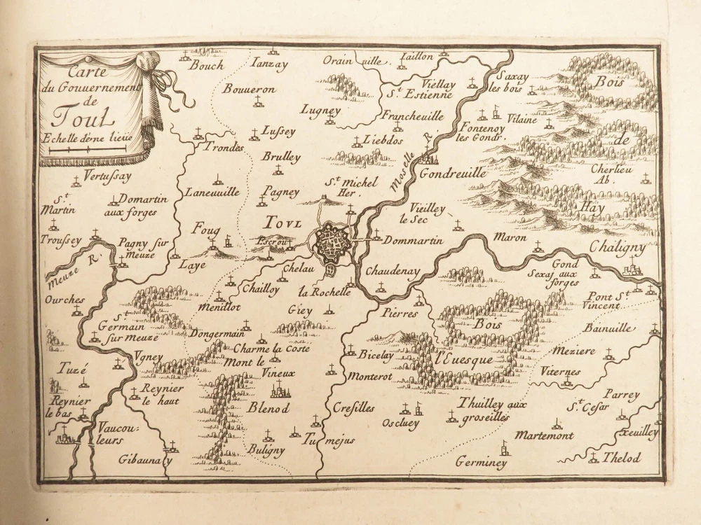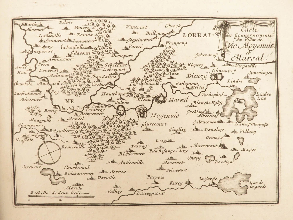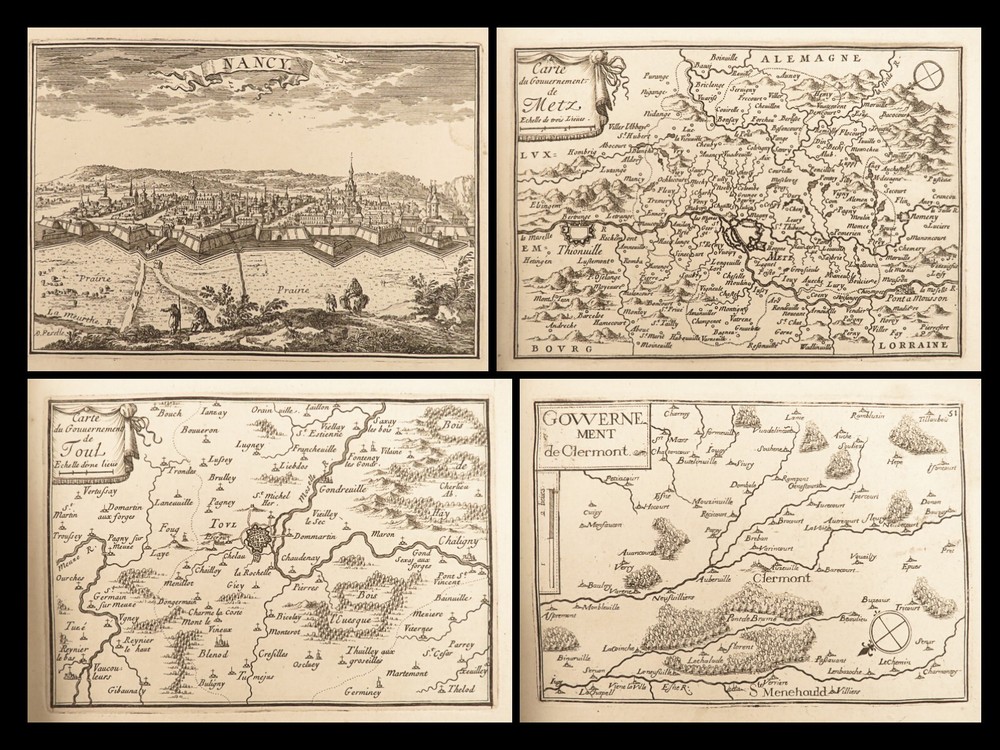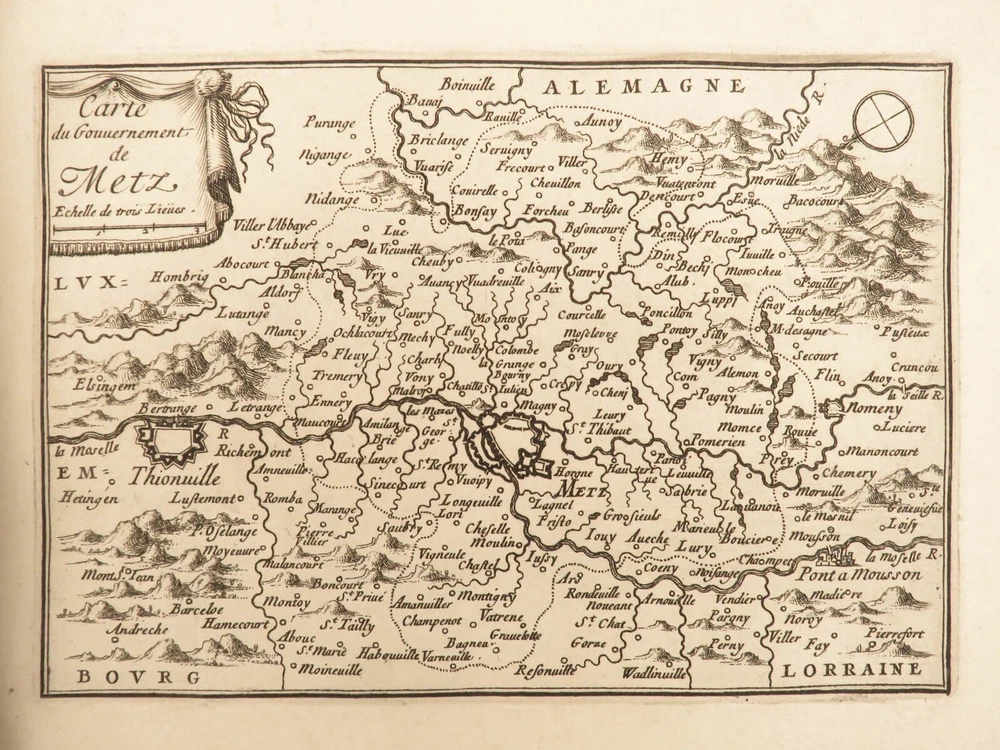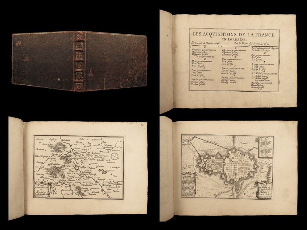 1660 ATLAS 1 ed 44 MAPS of Lorraine France Nancy Treaty of Munster & Pyrenees A rare 17 th -century edition collection of engravings of French city views from environs based on the towns involved in the Treaty of Munster of 1648 and the Treaty of Pyrenees of 1659. This work contains views and maps of the following cities: · Stenay · Dun, Ariege · Clermont · Bar · Ligny · St Mihel · Marsal · Moyenvic · Metz · Toul / Nancy · Verdun Item number: #23153 Price: $1500 DUVAL, Pierre [cartog.] Les acquisitions de la France en Lorraine, Munster 1648, des Pyrenees 1659. [Paris: 1660]. 1 st edition Details : · Collation: Complete with all pages o 44 hand-numbered plates · Provenance: o Armorial bookplate – David Bosanquet, 1739 o Handwritten – Geog. Gerxe o Handwritten – Richard Bosanquet · Language: French · Binding: Leather; tight and secure · Size: ~6.5in X 8.75in (16.5cm x 22cm) · VERY rare and desirable Our Guarantee: Very Fast. Very Safe. Free Shipping Worldwide. Customer satisfaction is our priority! Notify us with 7 days of receiving, and we will offer a full refund without reservation! 23153