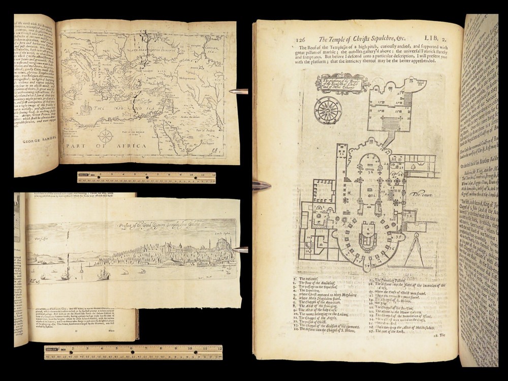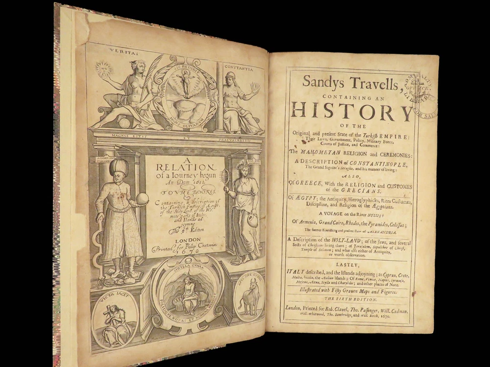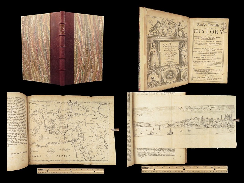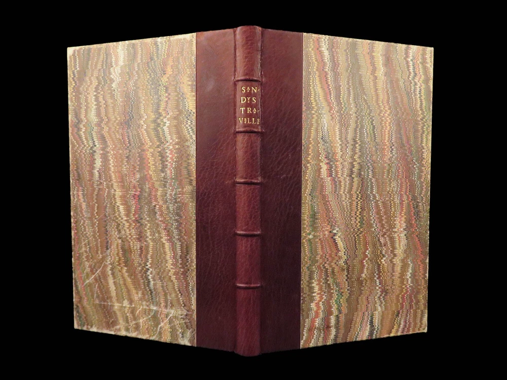 1670 Travels of George Sandys Turkey Constantinople Holy Land MAPS Cyprus Malta George Sandys was a 16 th - and early 17 th -century traveler who spent time in Italy, Turkey, and Palestine. “Sandys travelled to the Levant in 1610, spending a year in Turkey, Palestine and Egypt. His observations first appeared in 1615 and his text was soon regarded as a special authority on the Levant. Sandys was also interested in colonial promotion and was one of the undertakers of the third charter of the Virginia company in 1611.” (Blackmer 297) This work also describes the islands of Cyprus, Crete, Malta, Sicily, and the Aeolians; as well as Rome, Naples, Venice, Syracuse, and a good description of Jews in Jerusalem According to the STC, these travels were, “written a pleasant style, and are distinguished by erudition, sagacity and love of truth.” Item number: #27521 Price: $1950 SAYNDYS, George Sandys travels: containing an history of the original and present state of the Turkish Empire: their laws, government, policy, military force, courts of justice, and commerce London: Printed for Rob. Clavel, Tho. Passinger, et al., 1670. Details : · Collation: Complete with all pages o [4], 240 o Illustrated throughout § 2 folding engraved plates § 46 in-text engravings § Engraved frontispiece · References: Wing S 679; Lowndes 2189; STC 21726 · Language: English · Binding: Leather; tight and secure · Size: ~12in X 7.5in (30cm x 19cm) · VERY RARE, valuable, and desirable Our Guarantee: Very Fast. Very Safe. Free Shipping Worldwide. Customer satisfaction is our priority! Notify us with 7 days of receiving, and we will offer a full refund without reservation!