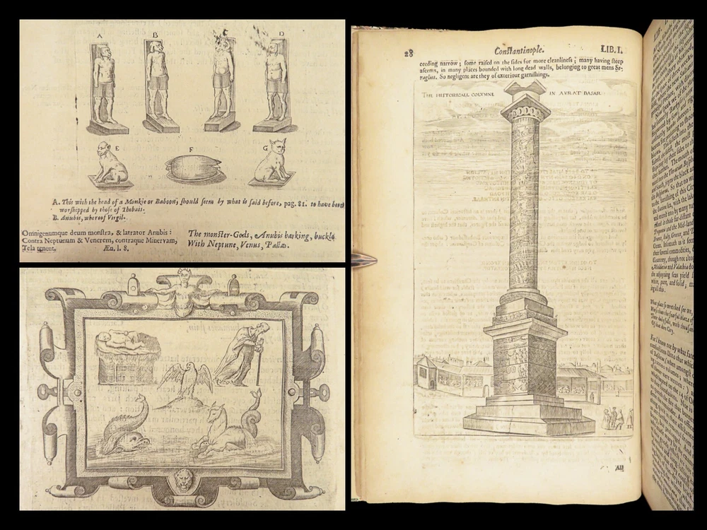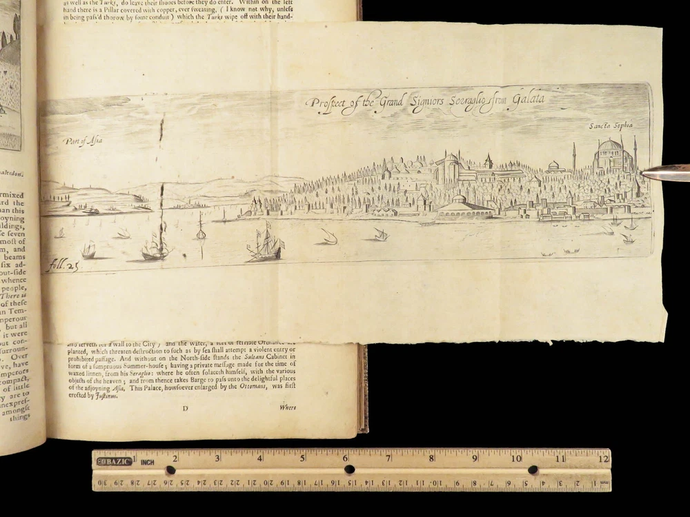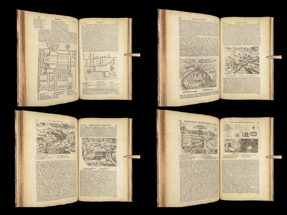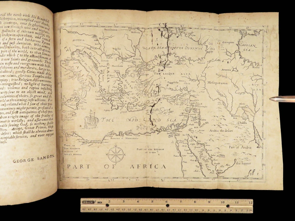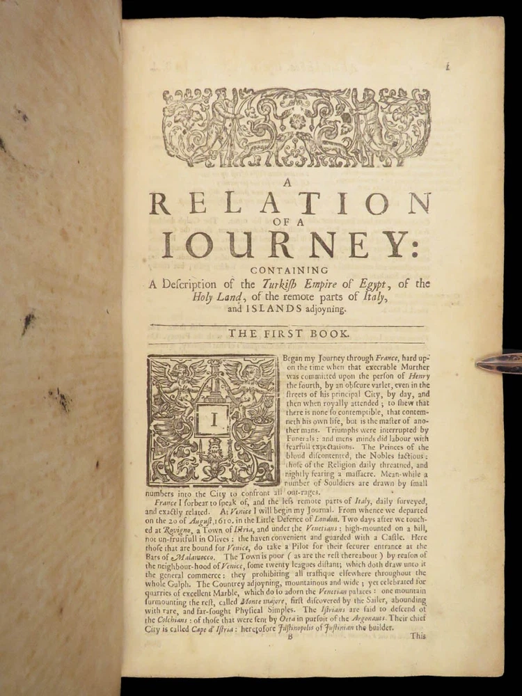 1670 Travels of George Sandys Turkey Constantinople Holy Land MAPS Cyprus Malta George Sandys was a 16 th - and early 17 th -century traveler who spent time in Italy, Turkey, and Palestine. “Sandys travelled to the Levant in 1610, spending a year in Turkey, Palestine and Egypt. His observations first appeared in 1615 and his text was soon regarded as a special authority on the Levant. Sandys was also interested in colonial promotion and was one of the undertakers of the third charter of the Virginia company in 1611.” (Blackmer 297) This work also describes the islands of Cyprus, Crete, Malta, Sicily, and the Aeolians; as well as Rome, Naples, Venice, Syracuse, and a good description of Jews in Jerusalem According to the STC, these travels were, “written a pleasant style, and are distinguished by erudition, sagacity and love of truth.” Item number: #27521 Price: $1950 SAYNDYS, George Sandys travels: containing an history of the original and present state of the Turkish Empire: their laws, government, policy, military force, courts of justice, and commerce London: Printed for Rob. Clavel, Tho. Passinger, et al., 1670. Details : · Collation: Complete with all pages o [4], 240 o Illustrated throughout § 2 folding engraved plates § 46 in-text engravings § Engraved frontispiece · References: Wing S 679; Lowndes 2189; STC 21726 · Language: English · Binding: Leather; tight and secure · Size: ~12in X 7.5in (30cm x 19cm) · VERY RARE, valuable, and desirable Our Guarantee: Very Fast. Very Safe. Free Shipping Worldwide. Customer satisfaction is our priority! Notify us with 7 days of receiving, and we will offer a full refund without reservation!