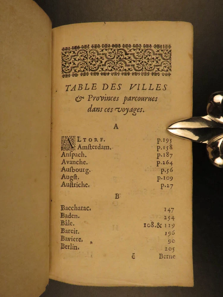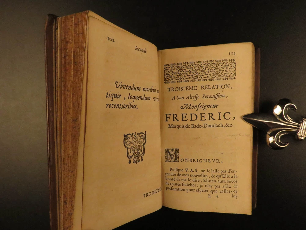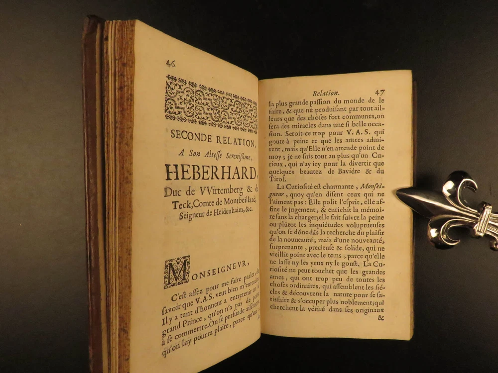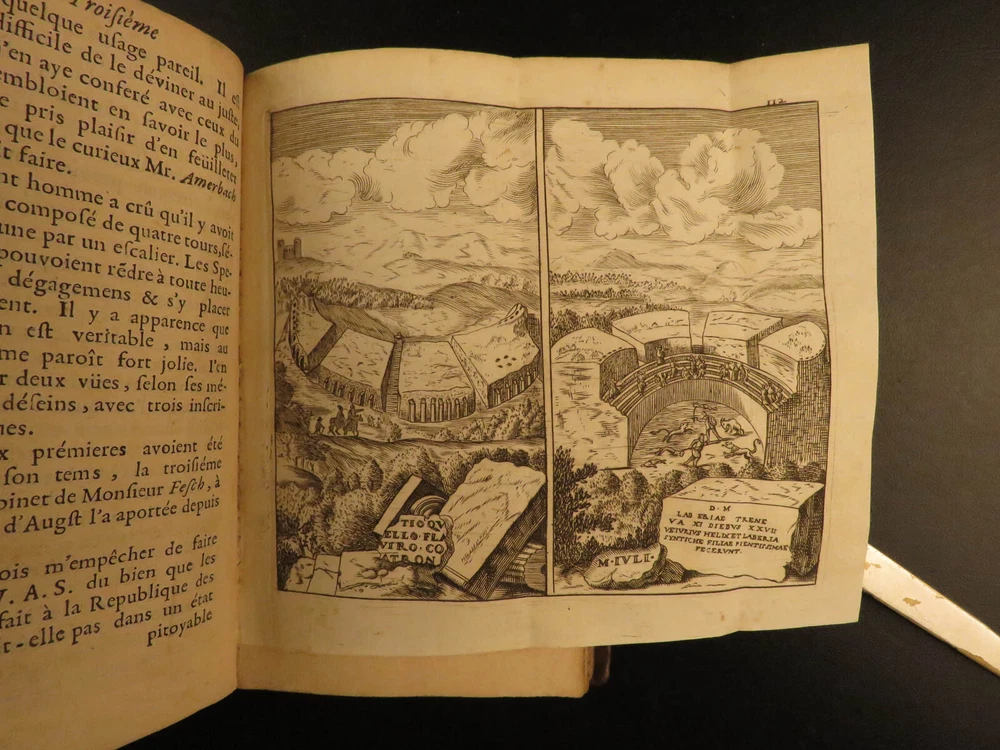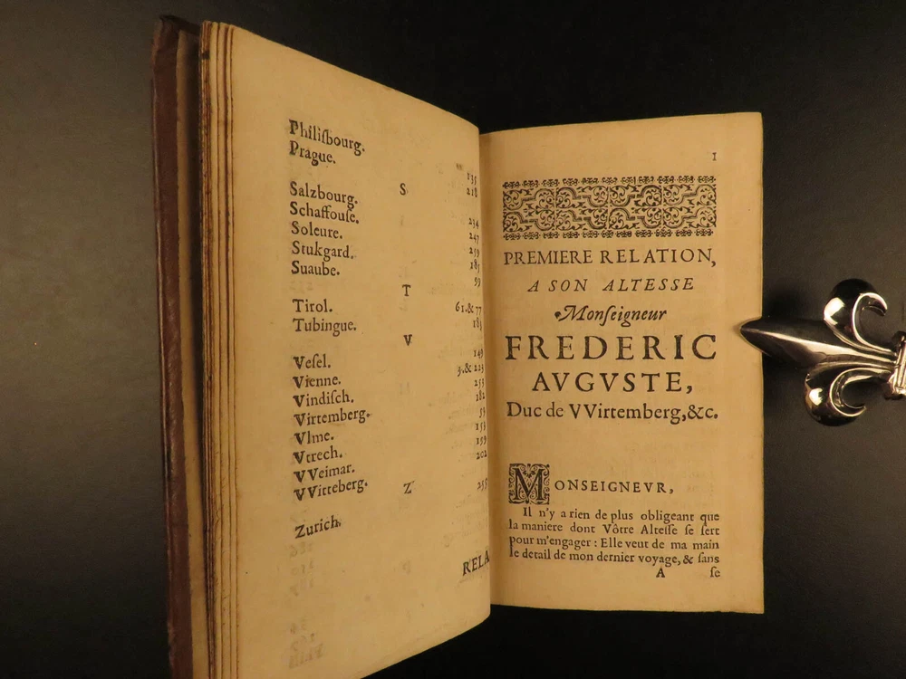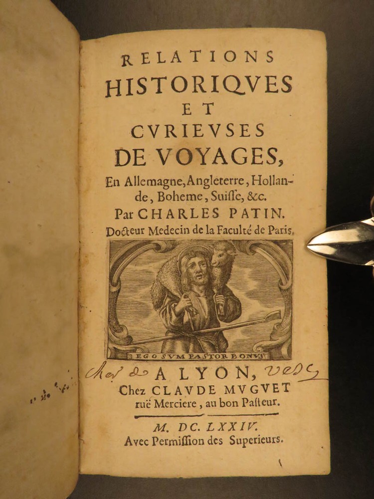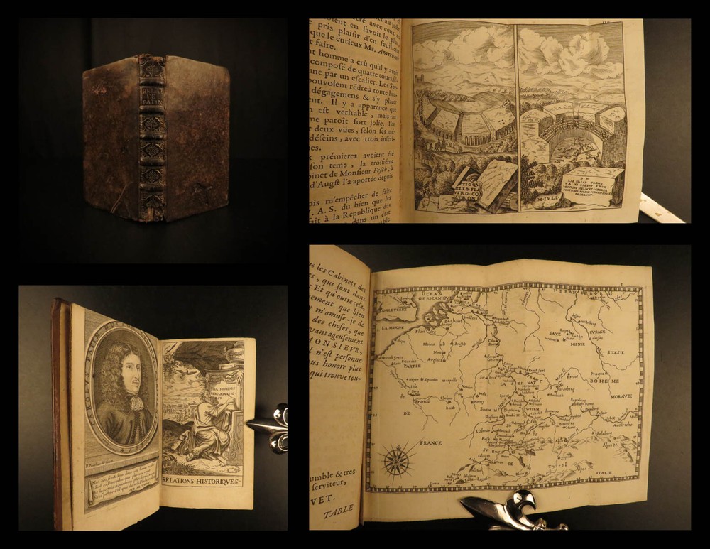 1674 1 ed Patin Voyages Curiosities Europe Cities Vienna Salzburg Prague MAP Charles Patin’s “ Relations Historiques et Curieuses de Voyages ” is a rare 17 th -century history of European cities, filled with descriptions of towns, monuments, and various curiosities from England, Germany, Holland, Switzerland, and Austria. Notable cities covered in this work include Vienna, Salzburg, Zurich, Prague, Munich, Leiden, Geneva, and many others. This rare and desirable 1674 first edition is illustrated with folding engravings, along with a folding map of North-Central Europe. Item number: #13836 Price: $599 PATIN, Charles Relations historiques et curieuses de voyages en Allemagne, Angleterre, Hollande, Bohême, Suisse, etc Lyon : C. Muguet, 1674. 1 st edition Details : · Collation: Complete with all pages o [12], 273, [1] o 10 engravings · Language: French · Binding: Leather; tight & secure · Size : ~5.75in X 3.5in (14.5cm x 8.5cm) Our Guarantee: Very Fast. Very Safe. Free Shipping Worldwide. Customer satisfaction is our priority! Notify us with 7 days of receiving, and we will offer a full refund without reservation! 13836