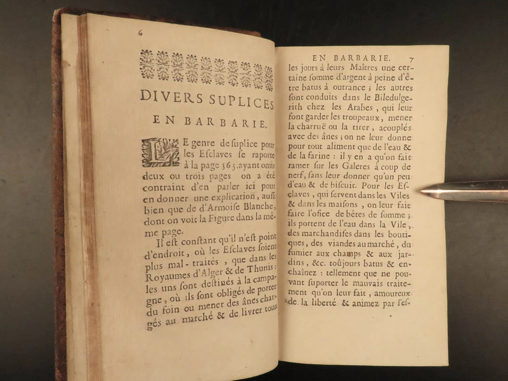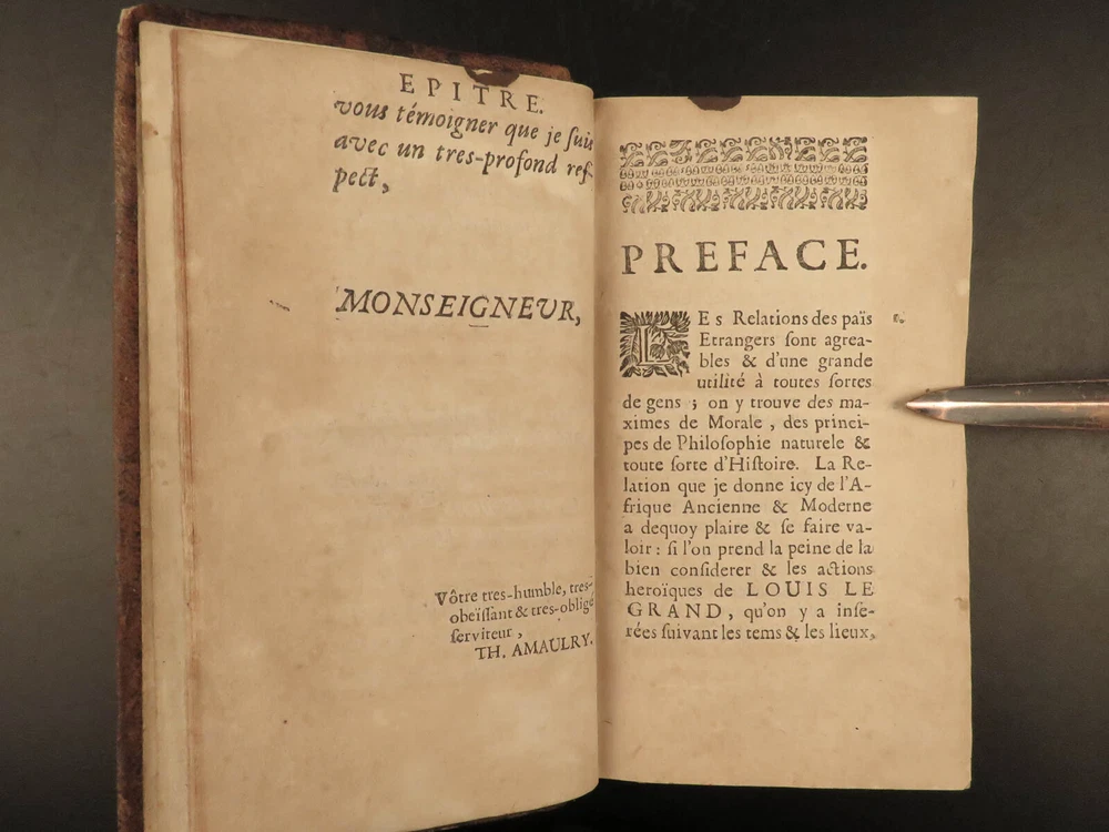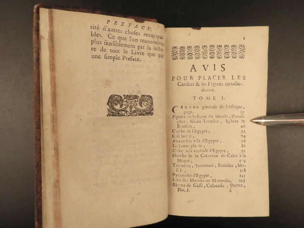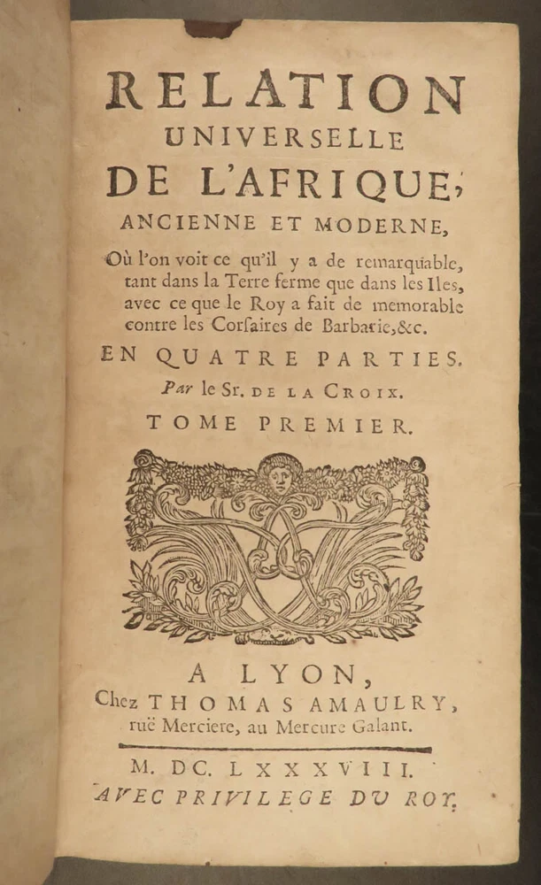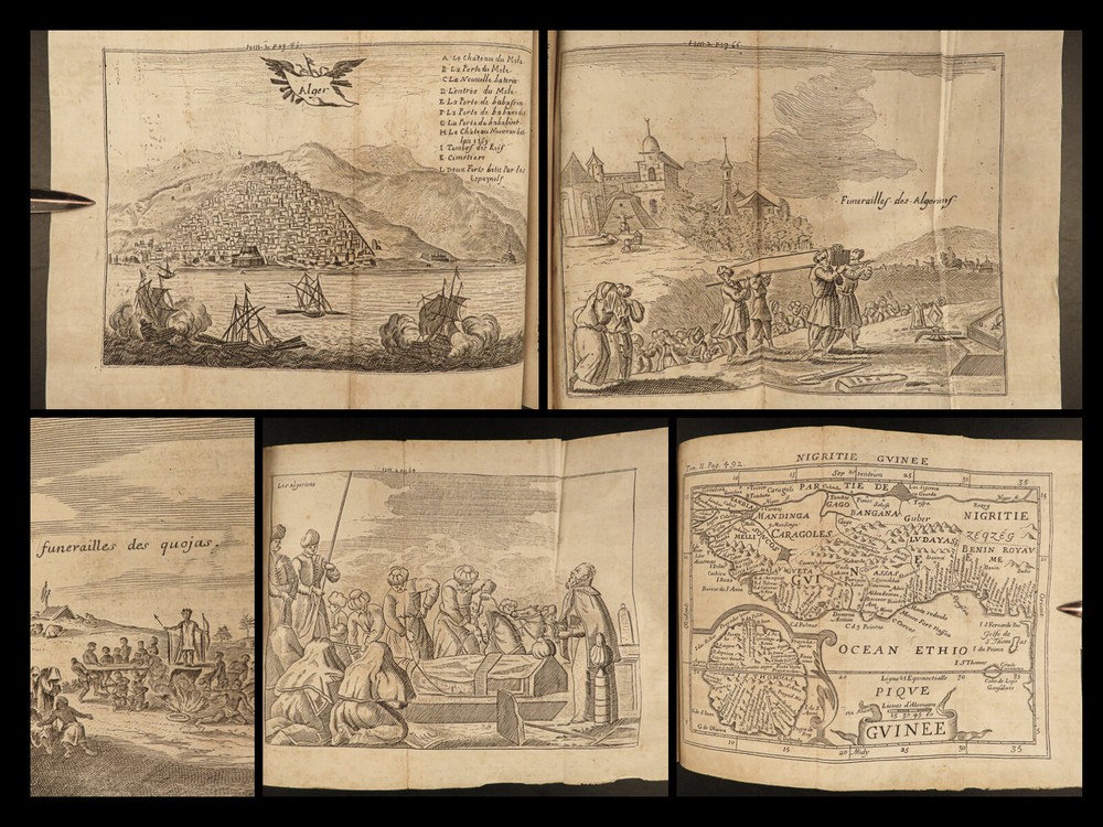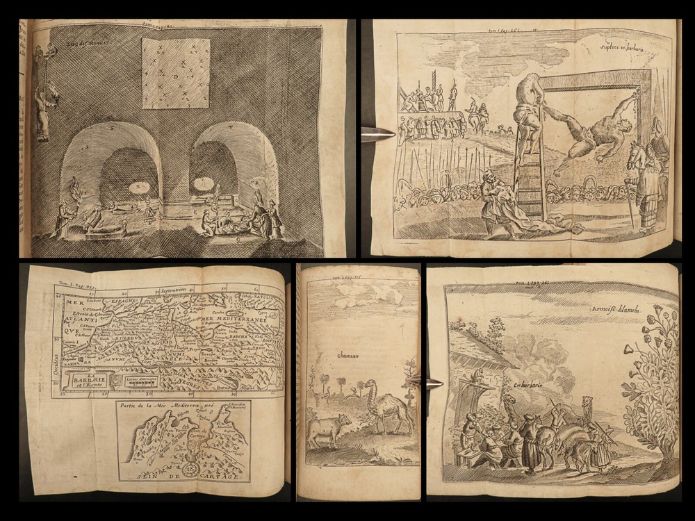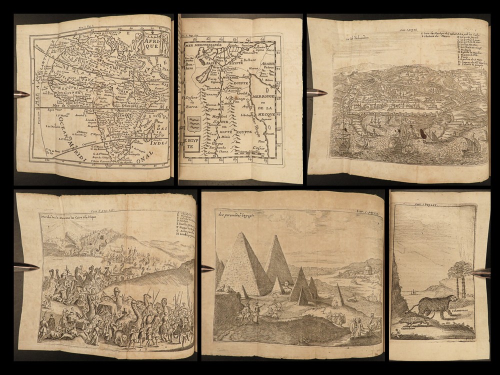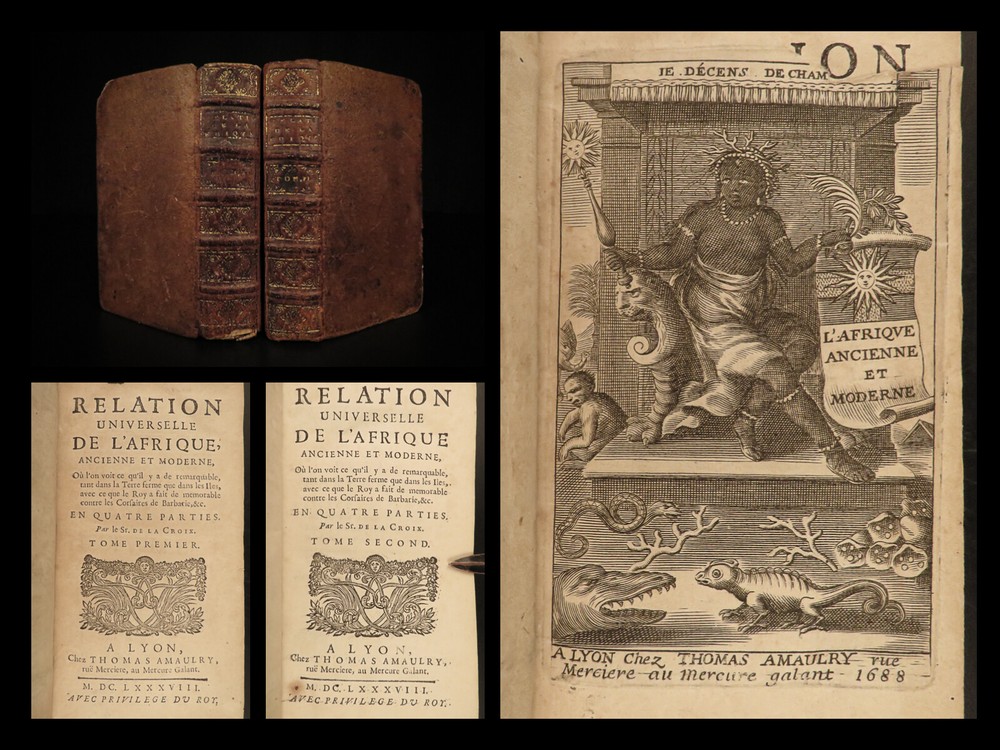 1688 AFRICA 1 ed History EGYPT Mummies Pyramids Illustrated Tunisia MAPS LaCroix Pherotee La Croix’s “ Universal Relation of Africa ” is a famous 17 th -century history of Africa. La Croix was a professor of geography in Lyon whose work on Africa became a lasting authority of African geography and history. However, much of La Croix’s “Afrique” was heavily inspired by Dutch author Olfert Dapper’s “ Description of Africa ”. Even still, La Croix’s work is notable for the exquisite full-page and folding engravings as well as descriptions of some of the greatest mysteries of Africa including a section on Egyptian pyramids, the Sphinx, and mummies ! Other topics include voyages to the Barbary coast, Tunisia, Algiers, and Morocco. Item number: #20169 Price: $1950 LA CROIX, Pherotee de Relation universelle de l'Afrique, ancienne et modern A Lyon, chez Thomas Amaulry, 1688. First edition. Details : · Collation: Complete with all pages; o Vol. I – [18], 12, 536, [16] o Vol. II – [2], 576, [20] o 43 illustrations in two tomes · Language: French · Binding: Leather; tight and secure · Size : ~6.5in X 3.75in (16.5cm x 10cm ) · Exceedingly rare and desirable Our Guarantee: Very Fast. Very Safe. Free Shipping Worldwide. Customer satisfaction is our priority! Notify us with 7 days of receiving, and we will offer a full refund without reservation! 20169