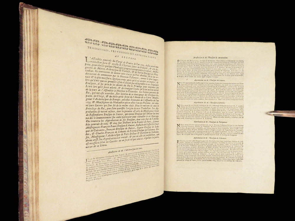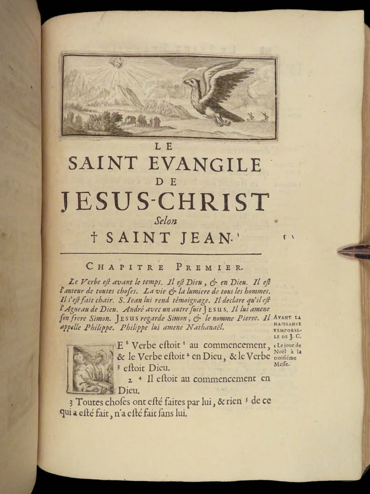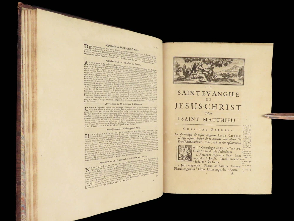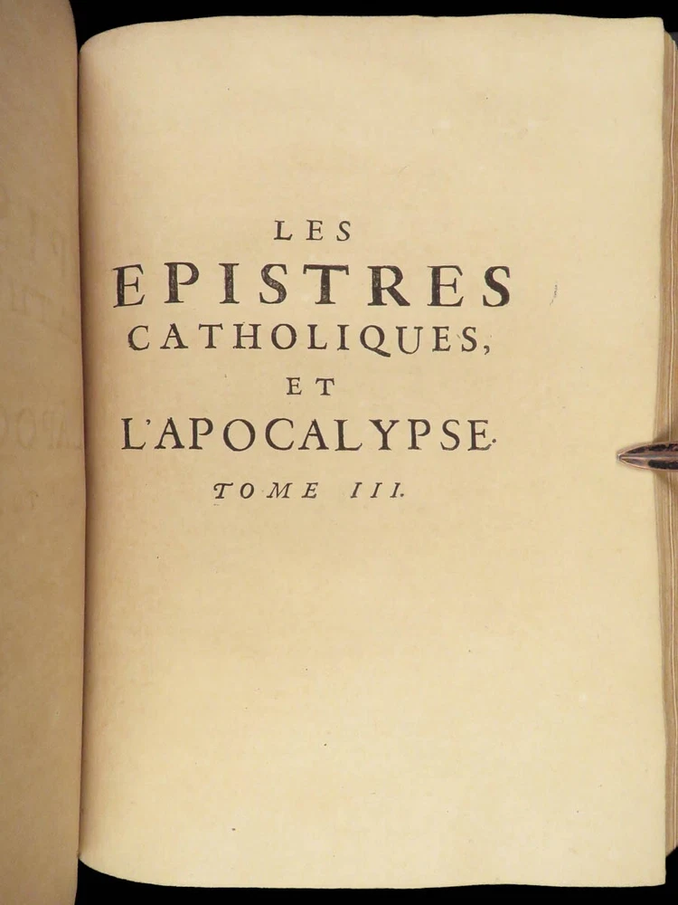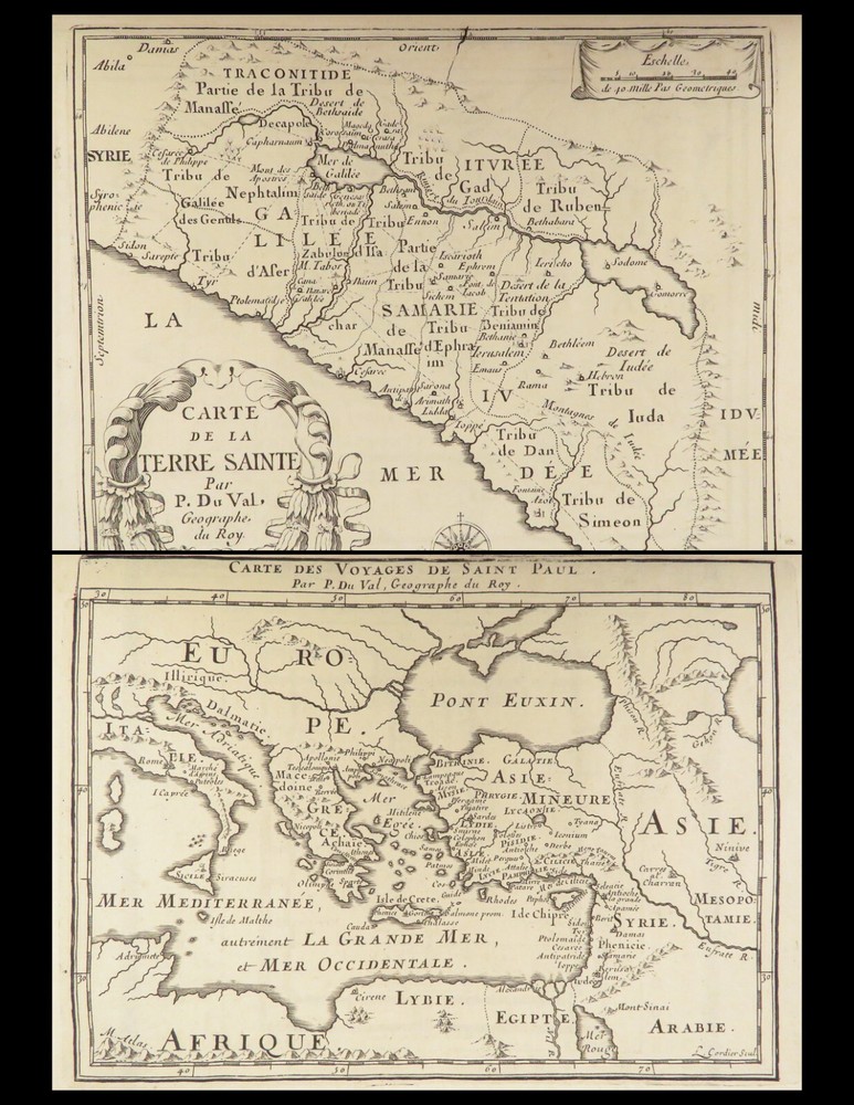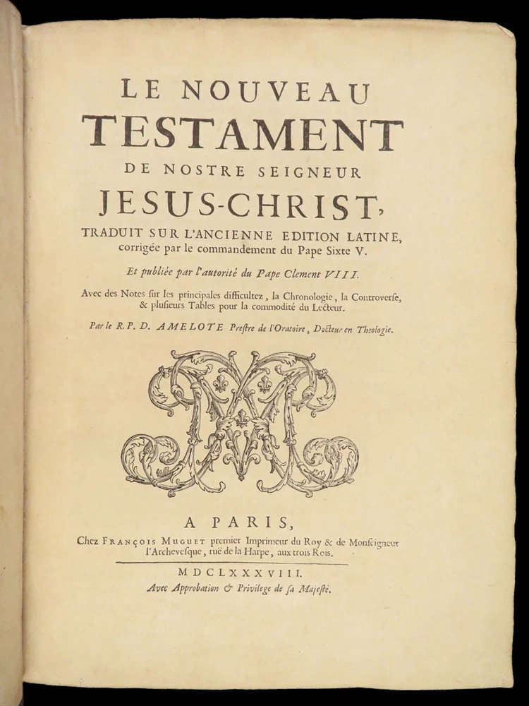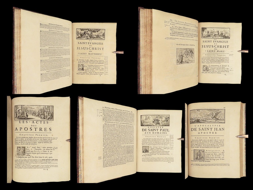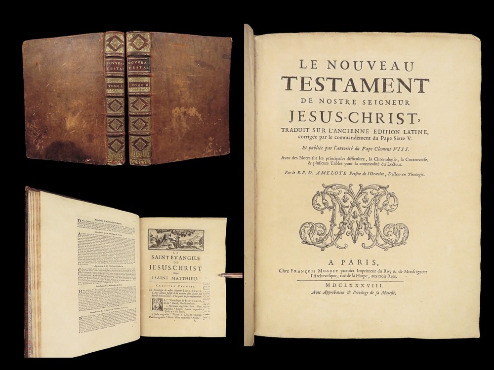 1688 BIBLE Illustrated MAPS 2v SET Denis Amelote French NT Catholic Church Known for his treatises and essays on church history and important church figures, Denis Amelote was a 17 th -century Biblical scholar. His translation of the New Testament has maintained popularity even into the 20 th -century, mostly because of his commentary and referencing Greek manuscripts. This 1688 edition was published in Paris by Francois Muguet and published by the authority of the Catholic Church and Pope Clement VIII. As expected, it features the New Testament books of the Letters of the Apostle Paul along with the canonical epistles and Revelation. Item number: #27812 Price: $750 New Testament Bible Le Nouveau Testament de nostre Seigneur Jesus-Christ. Traduit sur l'ancienne édition latine A Paris, Chez François Muguet, 1688. Details : · Collation: Complete with all pages; 3 volumes in 2 tomes o Tome I § Vol. I – [28], 567, [1] o Tome II § Vol. II – [8], 454, [2] § Vol. III – [8], 314 § 4 engraved plates at end · Language: French · Binding: Leather; tight and secure · Size: ~10.25in X 8in (26cm x 20.5cm) Our Guarantee: Very Fast. Very Safe. Free Shipping Worldwide. Customer satisfaction is our priority! Notify us with 7 days of receiving, and we will offer a full refund without reservation!
