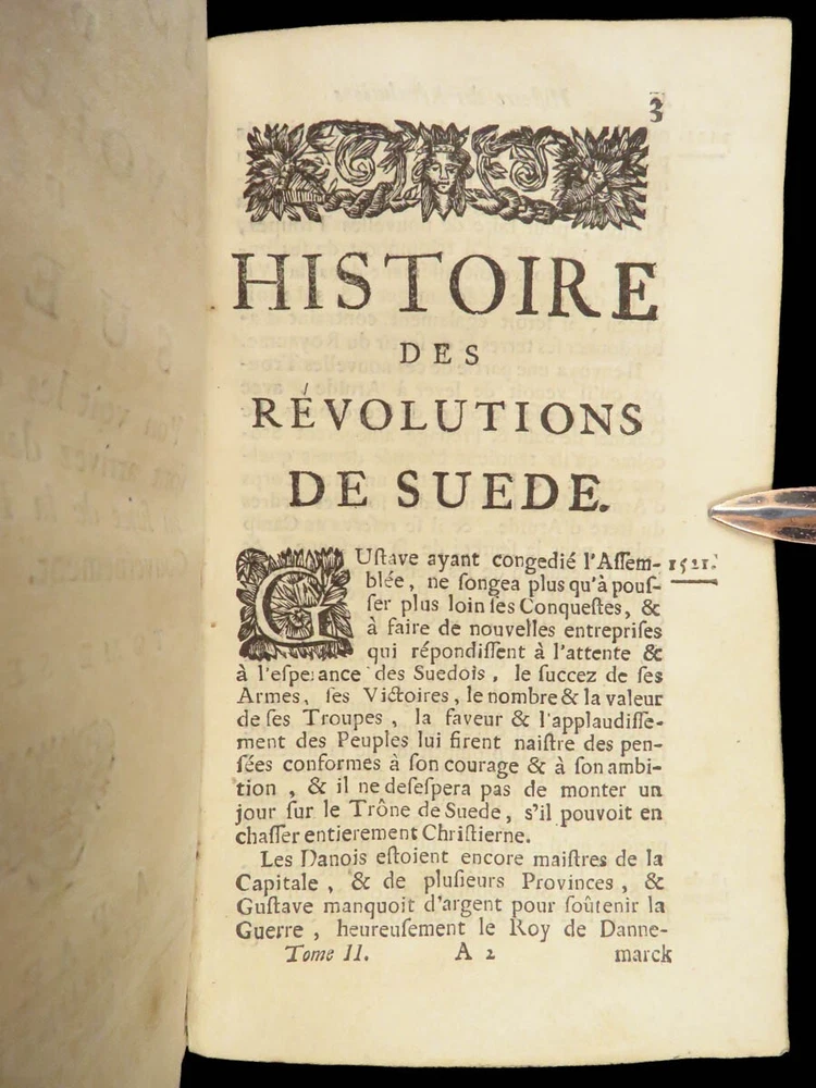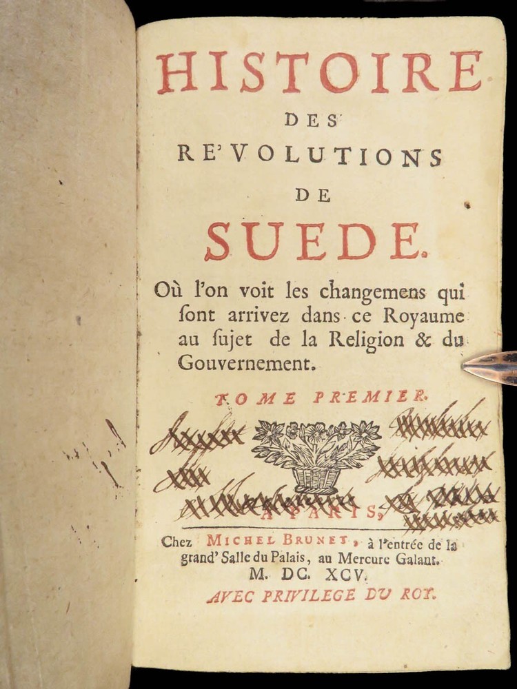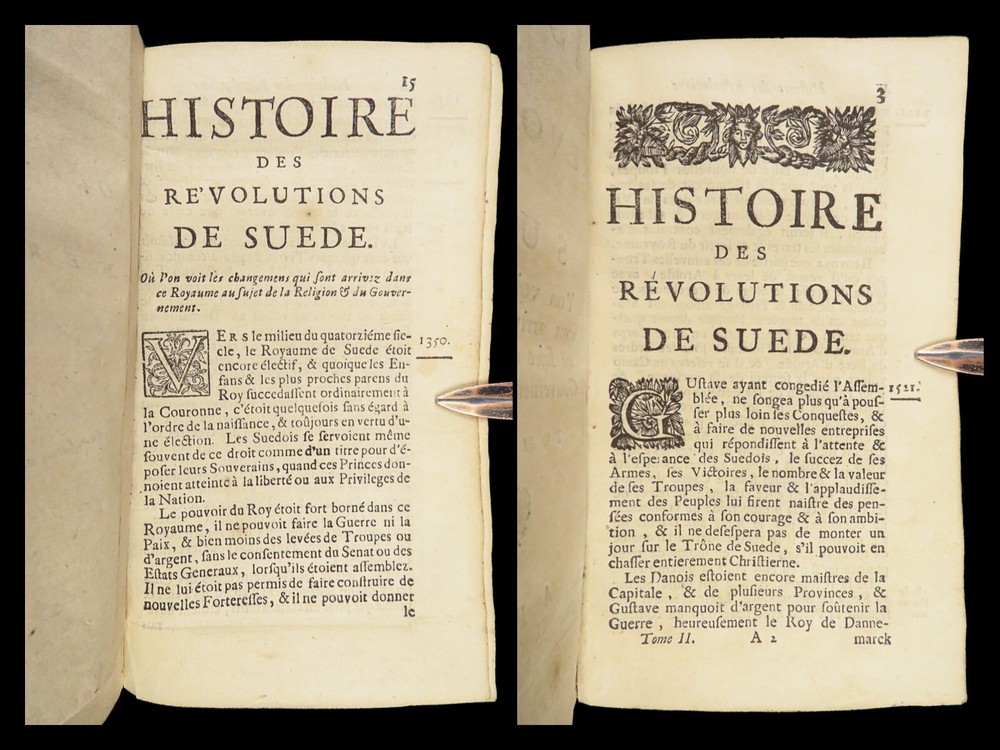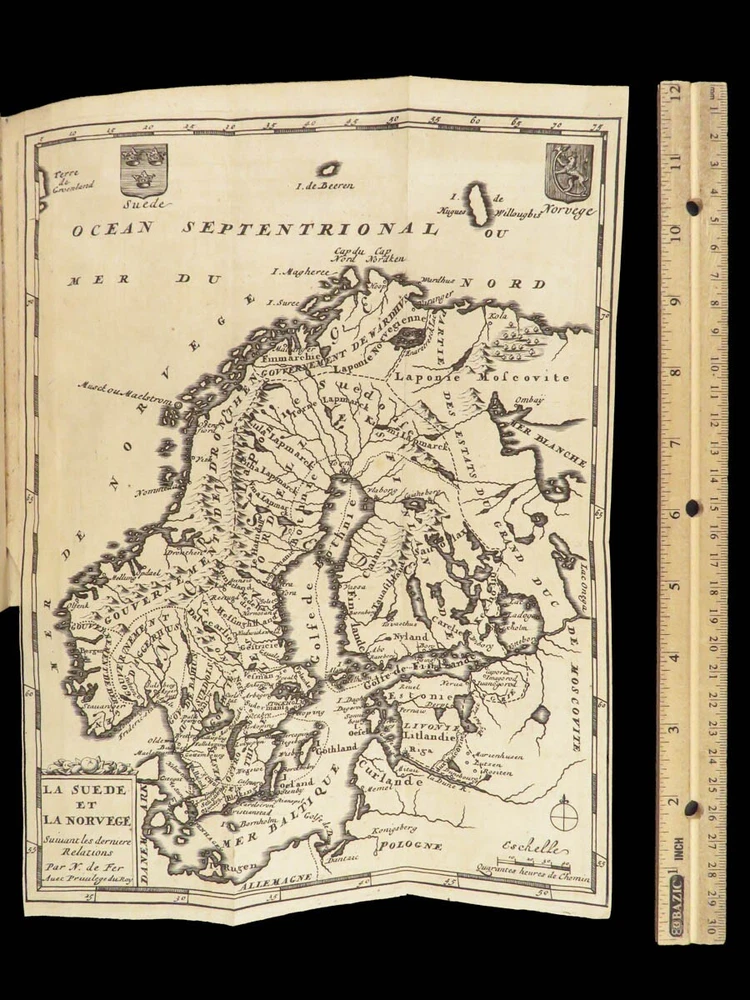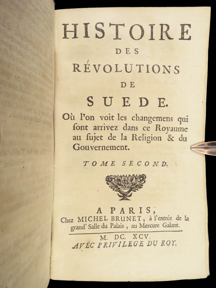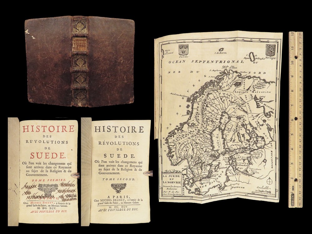 1695 History of SWEDEN 1 ed Swedish WARS Vertot Denmark Scandinavia MAP Russia ‘The History of the Revolution in Sweden’ by Vertot is one of the best accounts of the Swedish Empire , outlining parts of the Middle Ages through the rise of Charles XI. Vertot discusses Swedish wars against Denmark and Russia, the Swedish crown, the effects of the Protestant Revolution in Sweden, as well as the growth of the Swedish Empire over that time. Item number: #28004 Price: $750 VERTOT, Abbe Histoire des revolutions de Suede. Paris: Michel Brunet, 1695. First edition. Details : · Collation: Complete with all pages; 2 volumes in 1 o Vol. I – [14] 15-182, [38] § Includes folding map o Vol. II – [2], 3-171, [27] · Language: French · Binding: Leather; tight and secure · Size: ~6.25in X 4in (16cm x 10cm) Our Guarantee: Very Fast. Very Safe. Free Shipping Worldwide. Customer satisfaction is our priority! Notify us with 7 days of receiving, and we will offer a full refund without reservation!