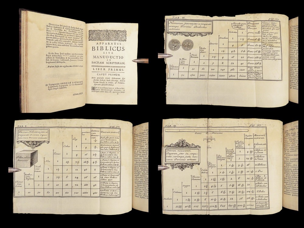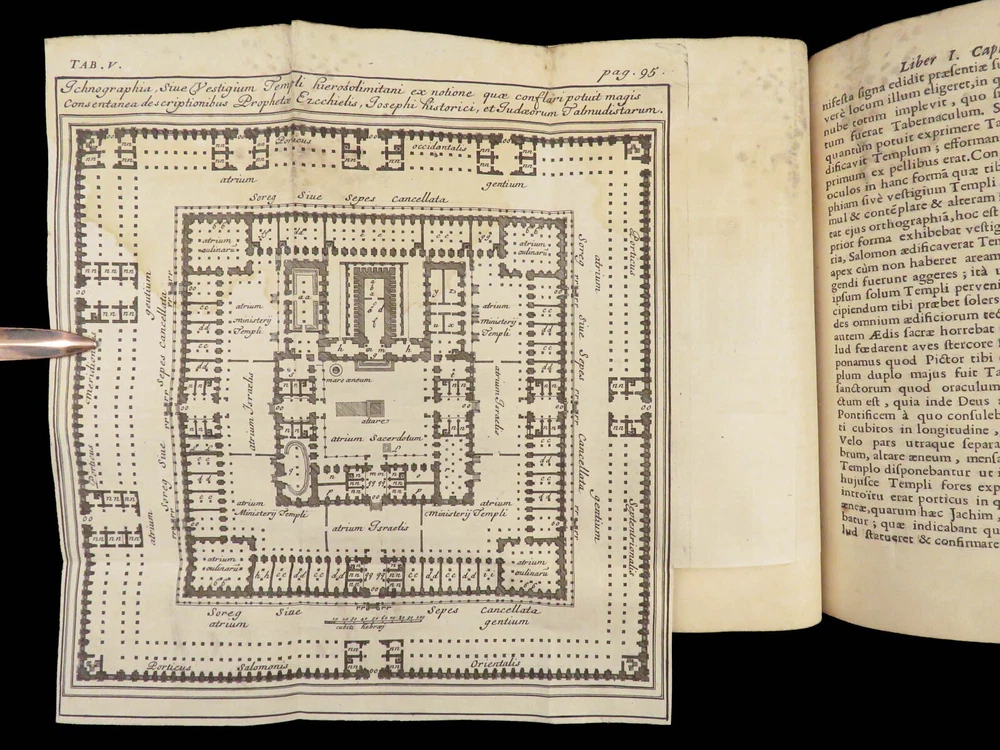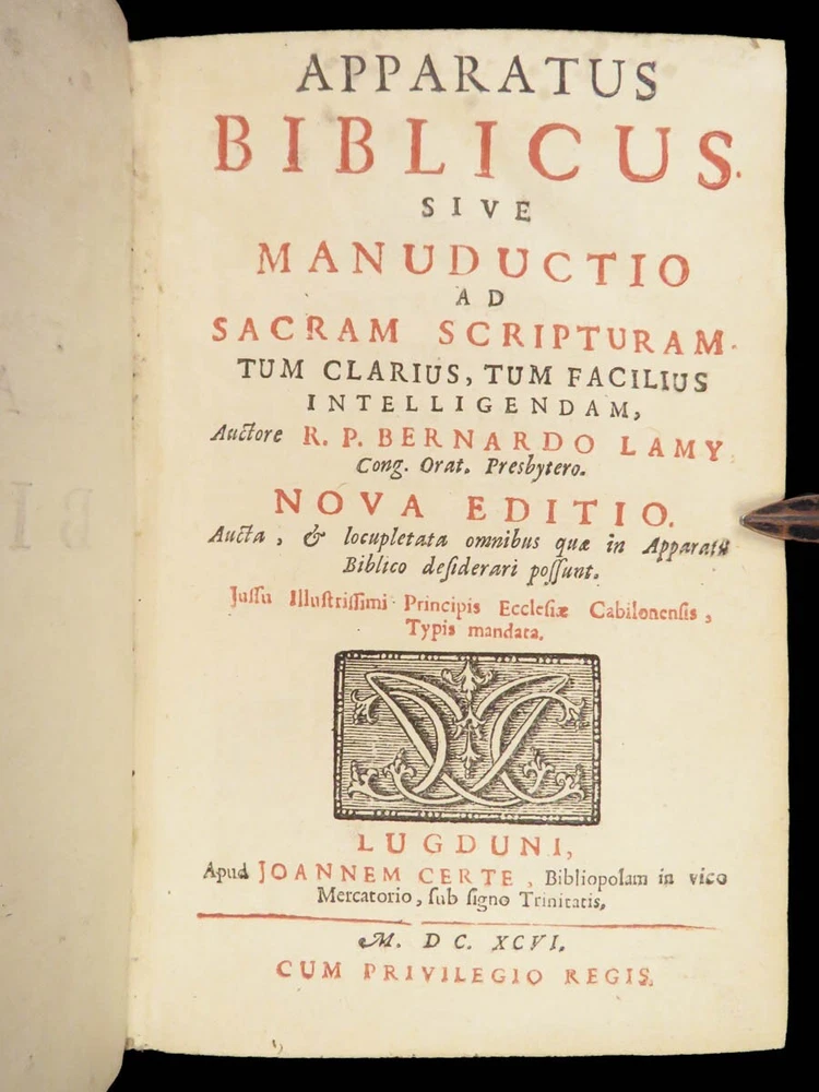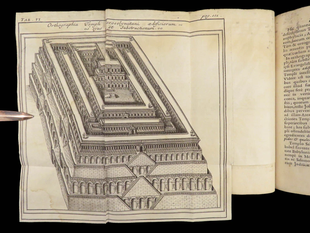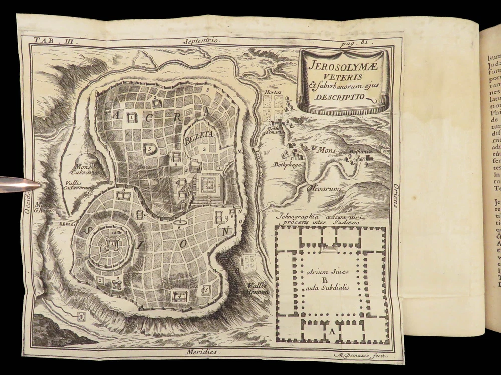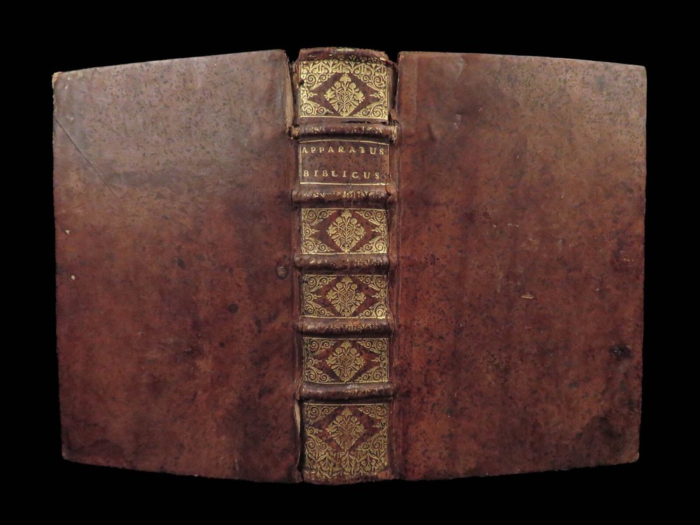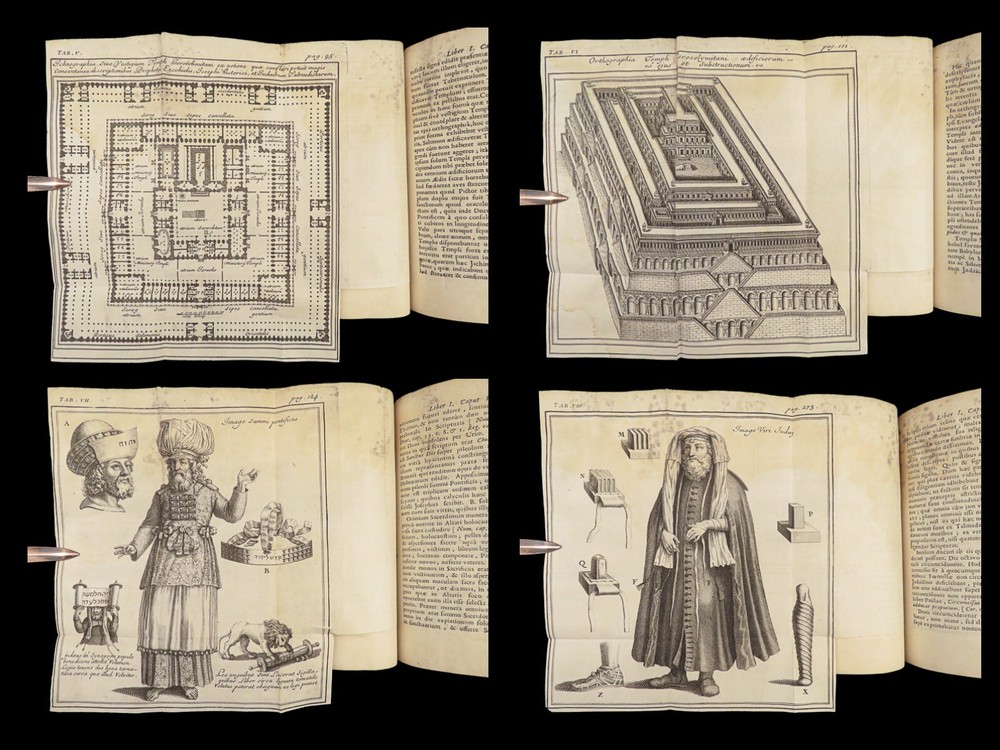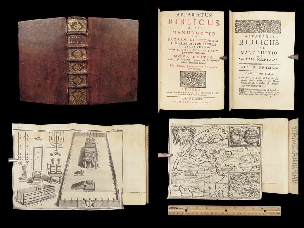 1696 BIBLE Holy Land MAPS Jewish Temple ART Lamy Jerusalem Israel Judaica Jews Bernard Lamy was a 17 th -century French theologian and mathematician who published treatises on biblical studies and mathematics. ‘ Introduction to Holy Scriptures’ which was originally titled ‘ Apparatus ad Biblia Sacra .’ This work was written to discuss the validity of the Books of Tobias and Judith, which were not included in the biblical canon by the Council of Trent. Lamy also discusses the history of the Hebrew people, the Jewish temple and tabernacle, the Holy Land itself, and the Jewish culture and customs mentioned in the Bible. Item number: #27054 Price: $750 LAMY, Bernard Apparatus biblicus sive Manuductio ad Sacram Scripturam... intelligendam Lugduni: apud J. Certe, 1696. First edition. Details : · Collation: Complete with all pages o [30], 586 (i.e., 592), [72] o 11 engraved folding plates · Language: Latin · Binding: Leather; tight and secure · Size : ~7.5in X 5.25in (19cm x 13cm) Our Guarantee: Very Fast. Very Safe. Free Shipping Worldwide. Customer satisfaction is our priority! Notify us with 7 days of receiving, and we will offer a full refund without reservation!