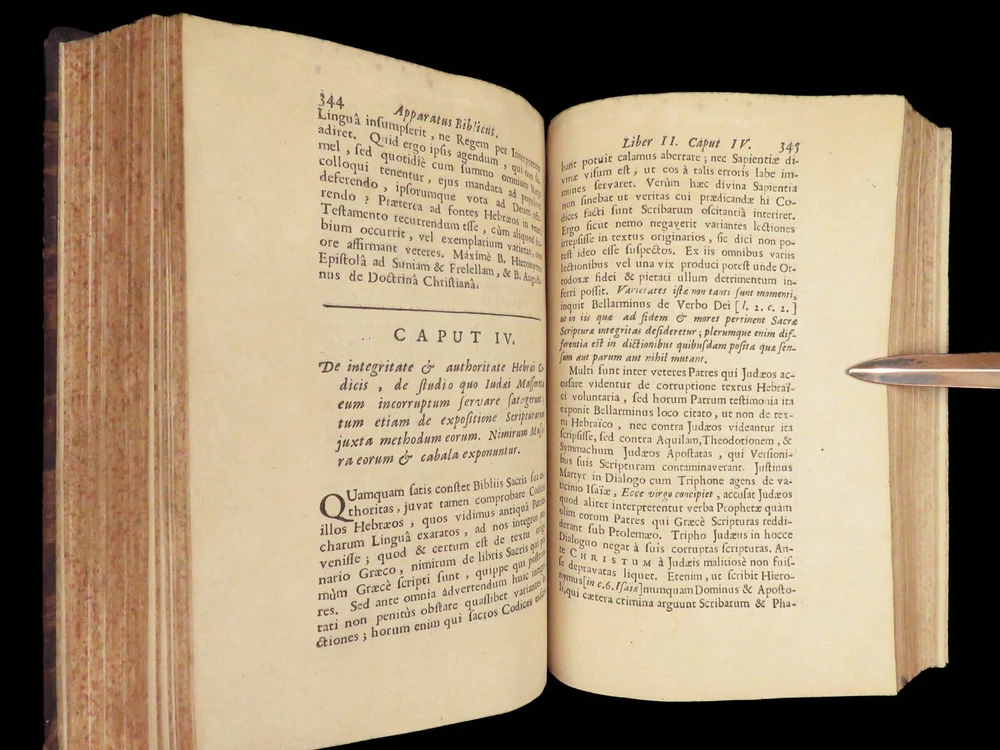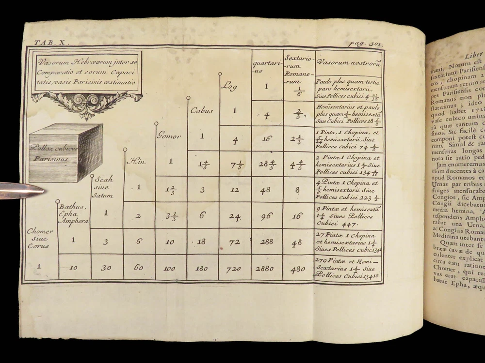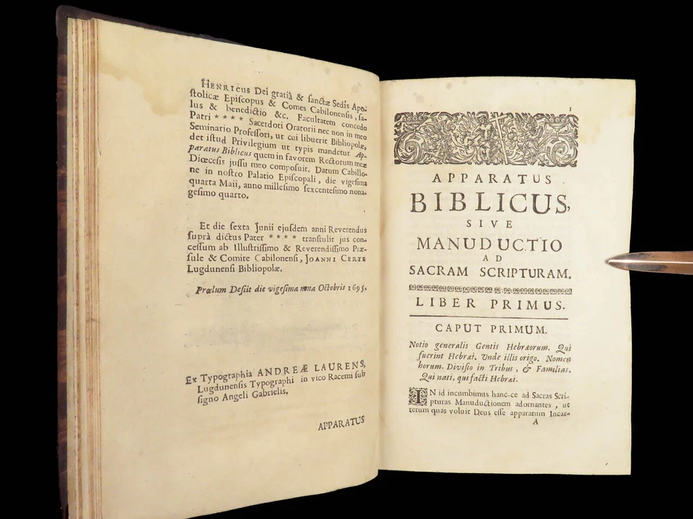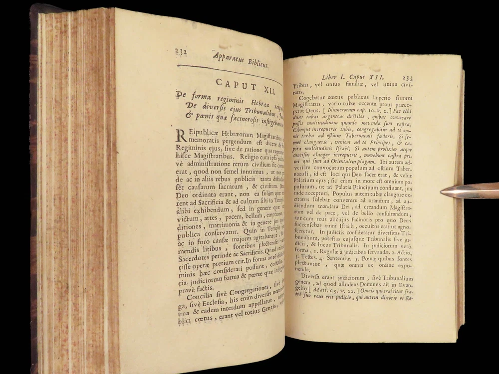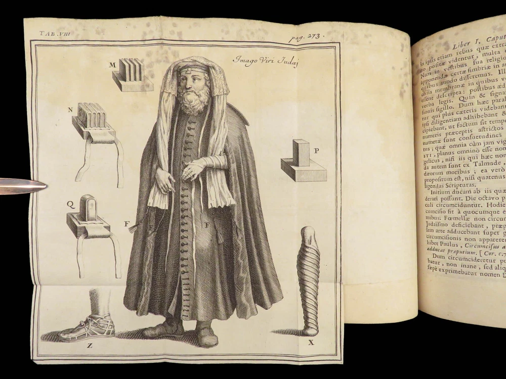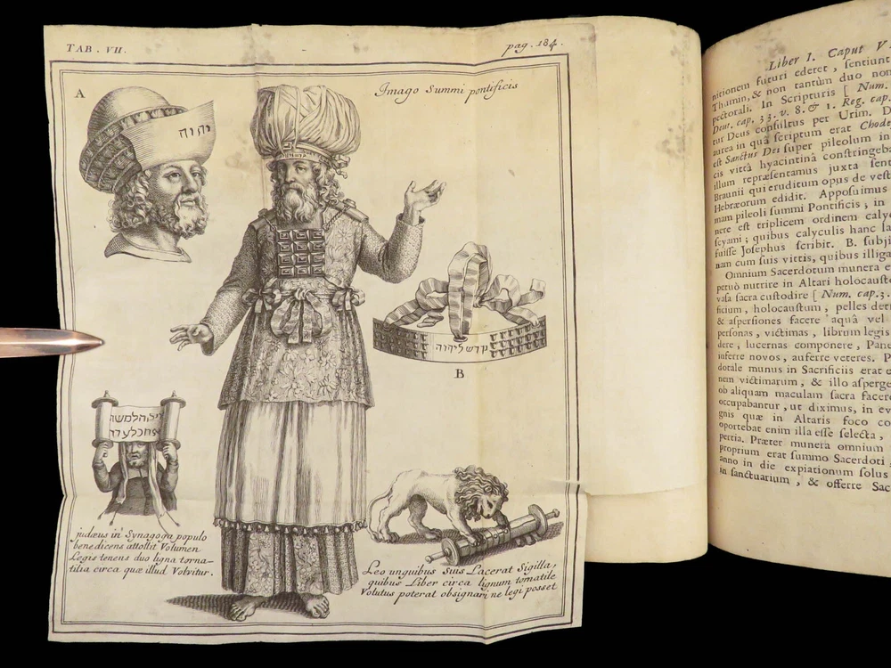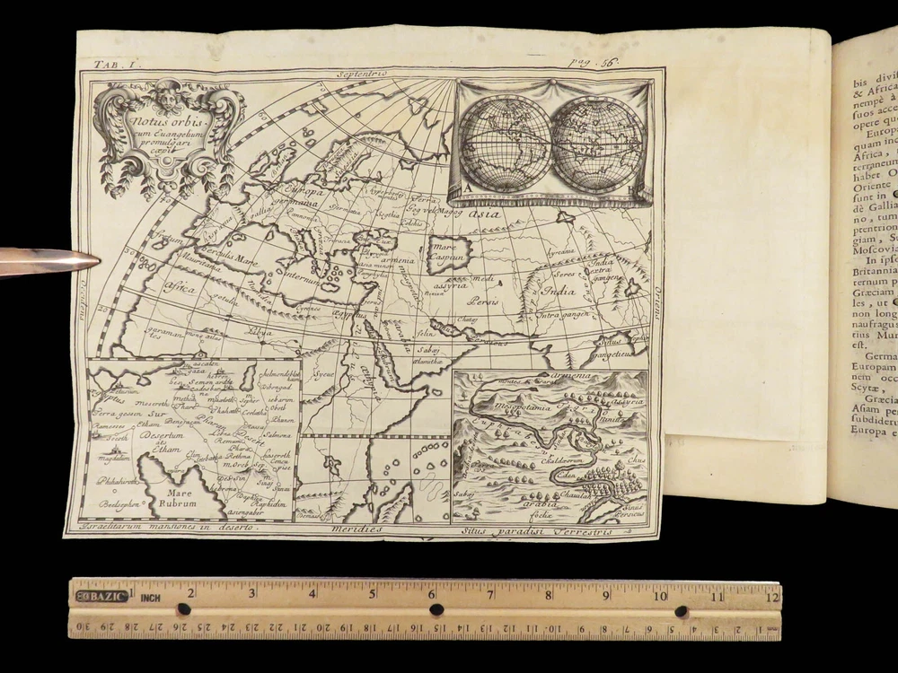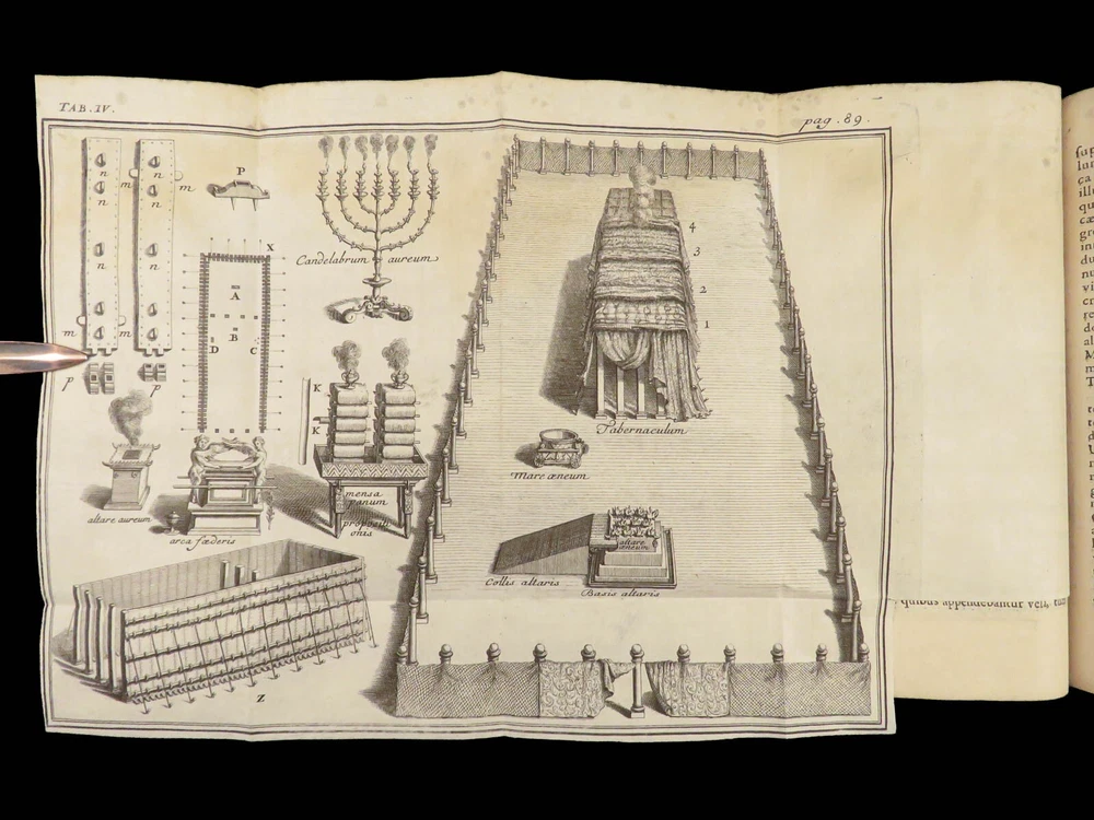 1696 BIBLE Holy Land MAPS Jewish Temple ART Lamy Jerusalem Israel Judaica Jews Bernard Lamy was a 17 th -century French theologian and mathematician who published treatises on biblical studies and mathematics. ‘ Introduction to Holy Scriptures’ which was originally titled ‘ Apparatus ad Biblia Sacra .’ This work was written to discuss the validity of the Books of Tobias and Judith, which were not included in the biblical canon by the Council of Trent. Lamy also discusses the history of the Hebrew people, the Jewish temple and tabernacle, the Holy Land itself, and the Jewish culture and customs mentioned in the Bible. Item number: #27054 Price: $750 LAMY, Bernard Apparatus biblicus sive Manuductio ad Sacram Scripturam... intelligendam Lugduni: apud J. Certe, 1696. First edition. Details : · Collation: Complete with all pages o [30], 586 (i.e., 592), [72] o 11 engraved folding plates · Language: Latin · Binding: Leather; tight and secure · Size : ~7.5in X 5.25in (19cm x 13cm) Our Guarantee: Very Fast. Very Safe. Free Shipping Worldwide. Customer satisfaction is our priority! Notify us with 7 days of receiving, and we will offer a full refund without reservation!