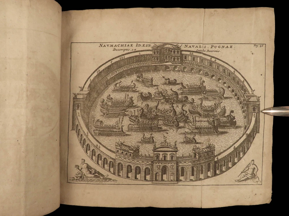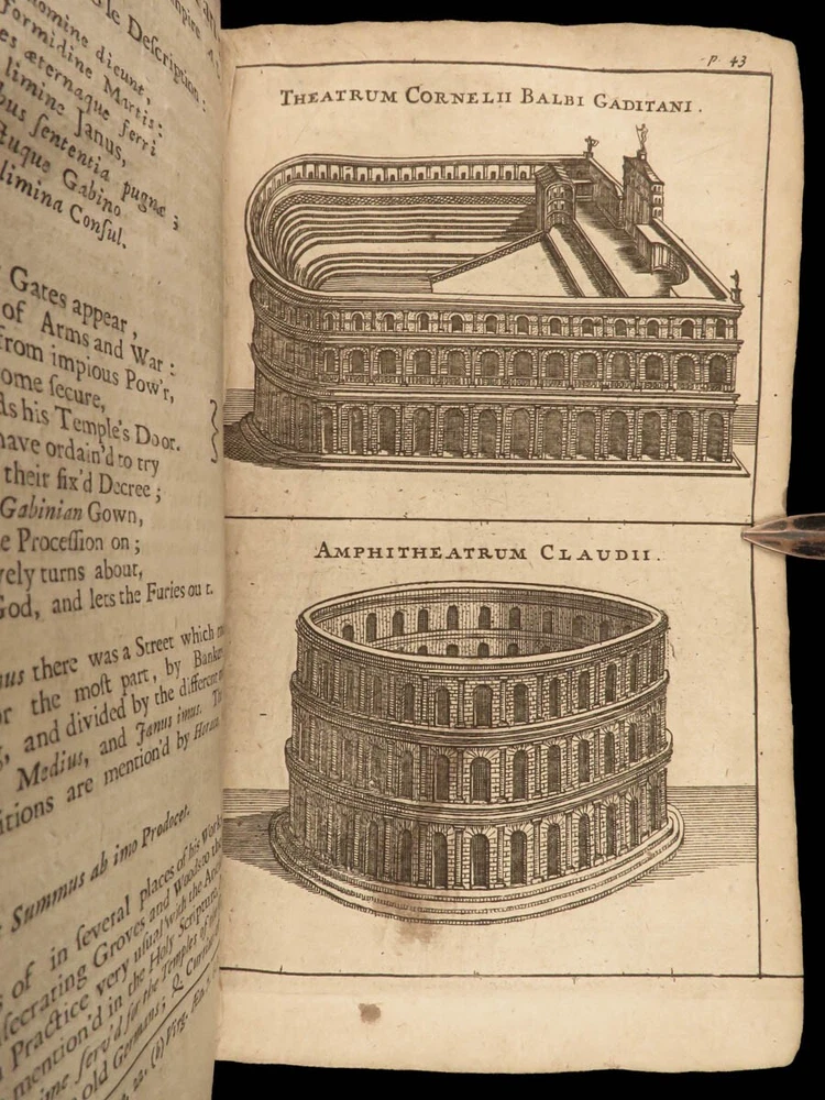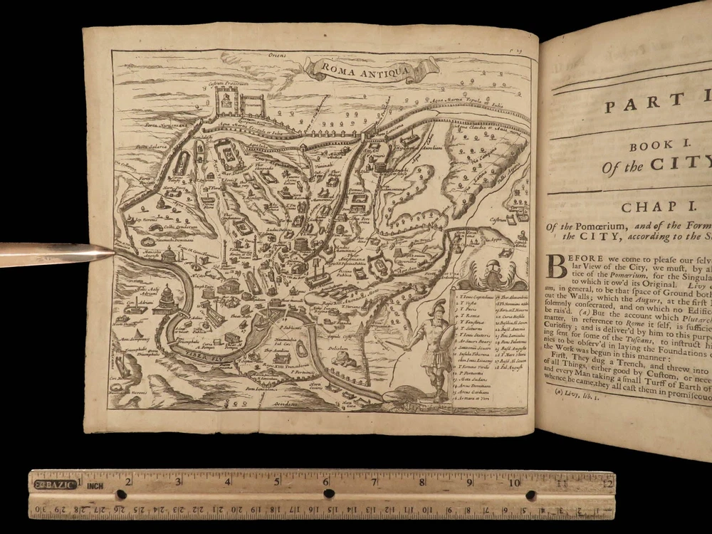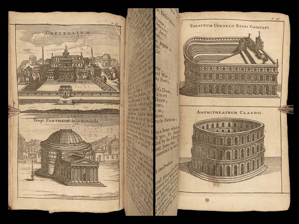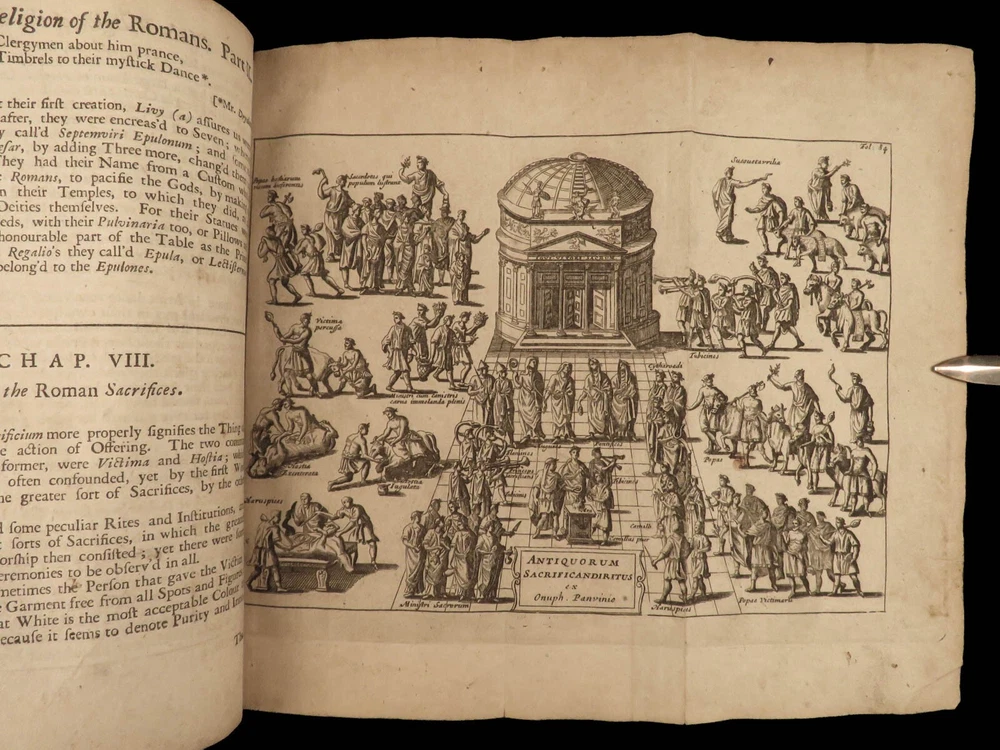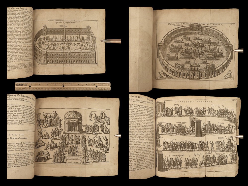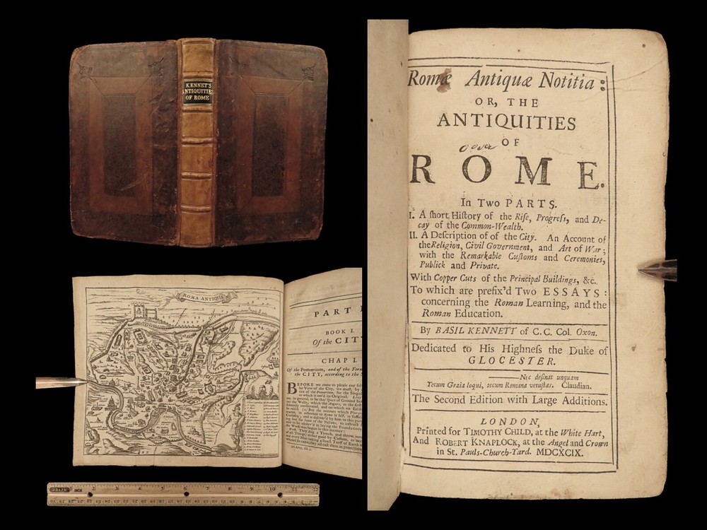 1699 Antiquities of ROME Basil Kennett Classical WAR Gladiators MAP Architecture Basil Kennett was a 17 th -century English chaplain much better known for his academic scholarship. This work became the standard on the history of Rome during its time. While other books on the history of Rome were certainly available, this work was written in a way of encouraging the study of classical philosophy and history, more so than just reiterating historical facts. This 1699 edition contains Kennett’s two essays which, according to the title page, concern “the Roman learning and the Roman Education”. Notable topics found in this work include: · On Roman Art of war: arms and weapons, soldier exercises; of the Evocarti · On gladiators, entertainment events · Extensive discussion on Roman government, Senate · Roman mythology and religious practices · Roman architecture, buildings, structures, development of design Item number: #23761 Price: $950 KENNETT, Basil Romae antiquae notitia : or, The antiquities of Rome. In two parts London: printed for Timothy Child, 1699. Details : · Collation: Complete with all pages o [38], 376, [24] o 11 engraved plates · Provenance: Handwritten o Stephani Thornton o John Thornton · Language: English · Binding: Leather; tight and secure · Size : ~8in X 5in (20cm x 12.5cm) Our Guarantee: Very Fast. Very Safe. Free Shipping Worldwide. Customer satisfaction is our priority! Notify us with 7 days of receiving, and we will offer a full refund without reservation! 23761