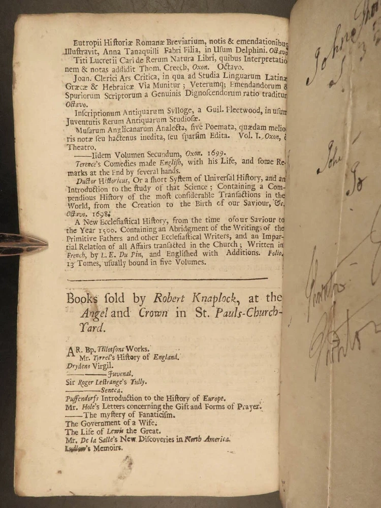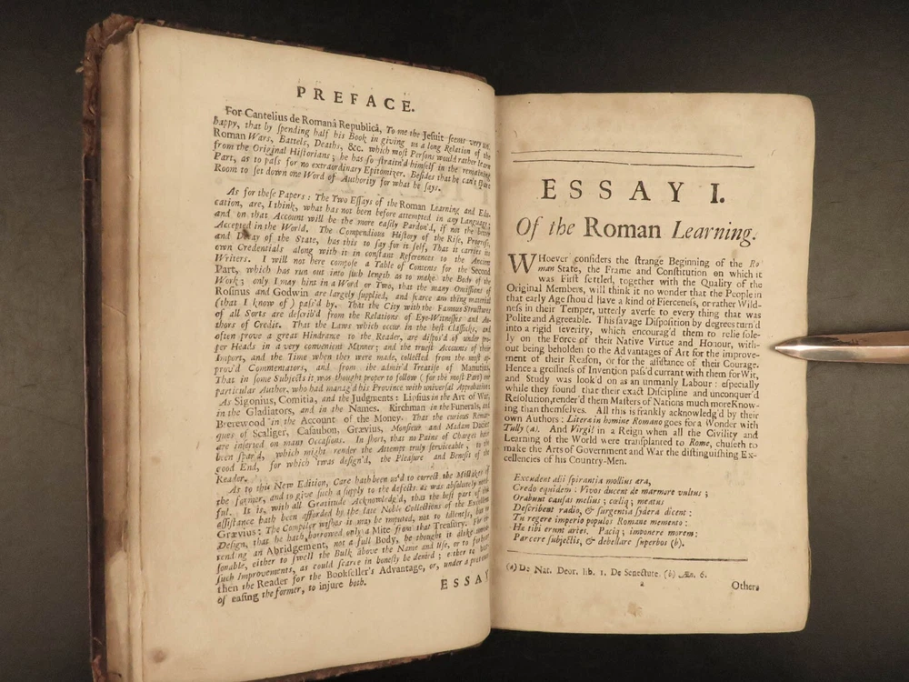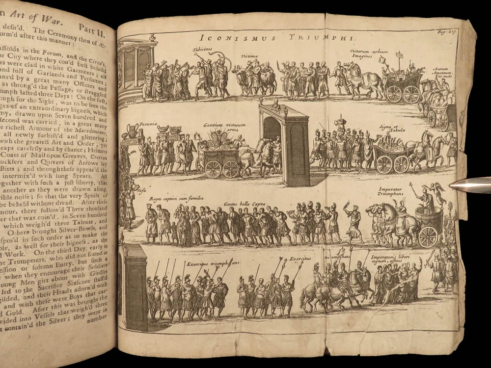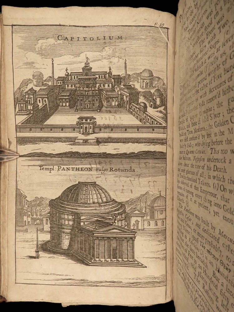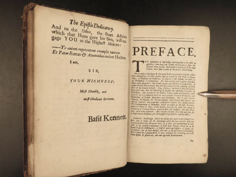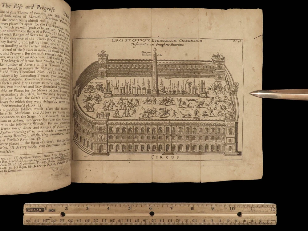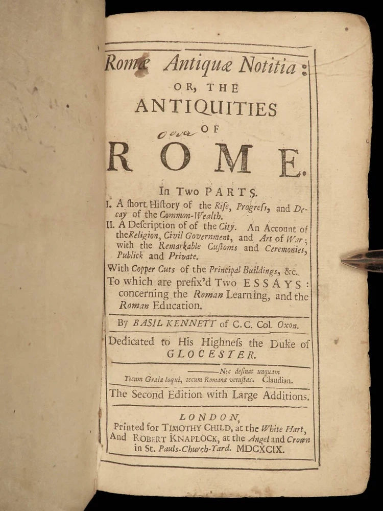 1699 Antiquities of ROME Basil Kennett Classical WAR Gladiators MAP Architecture Basil Kennett was a 17 th -century English chaplain much better known for his academic scholarship. This work became the standard on the history of Rome during its time. While other books on the history of Rome were certainly available, this work was written in a way of encouraging the study of classical philosophy and history, more so than just reiterating historical facts. This 1699 edition contains Kennett’s two essays which, according to the title page, concern “the Roman learning and the Roman Education”. Notable topics found in this work include: · On Roman Art of war: arms and weapons, soldier exercises; of the Evocarti · On gladiators, entertainment events · Extensive discussion on Roman government, Senate · Roman mythology and religious practices · Roman architecture, buildings, structures, development of design Item number: #23761 Price: $950 KENNETT, Basil Romae antiquae notitia : or, The antiquities of Rome. In two parts London: printed for Timothy Child, 1699. Details : · Collation: Complete with all pages o [38], 376, [24] o 11 engraved plates · Provenance: Handwritten o Stephani Thornton o John Thornton · Language: English · Binding: Leather; tight and secure · Size : ~8in X 5in (20cm x 12.5cm) Our Guarantee: Very Fast. Very Safe. Free Shipping Worldwide. Customer satisfaction is our priority! Notify us with 7 days of receiving, and we will offer a full refund without reservation! 23761