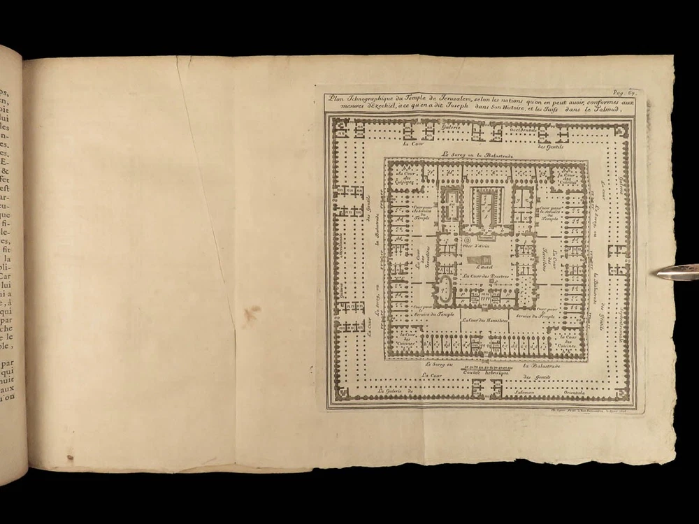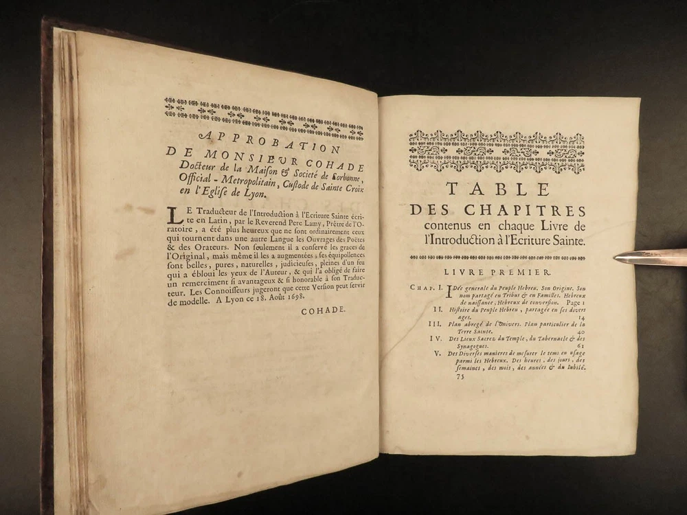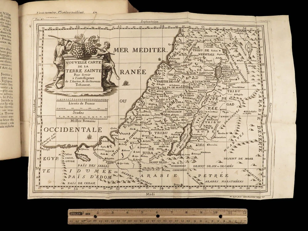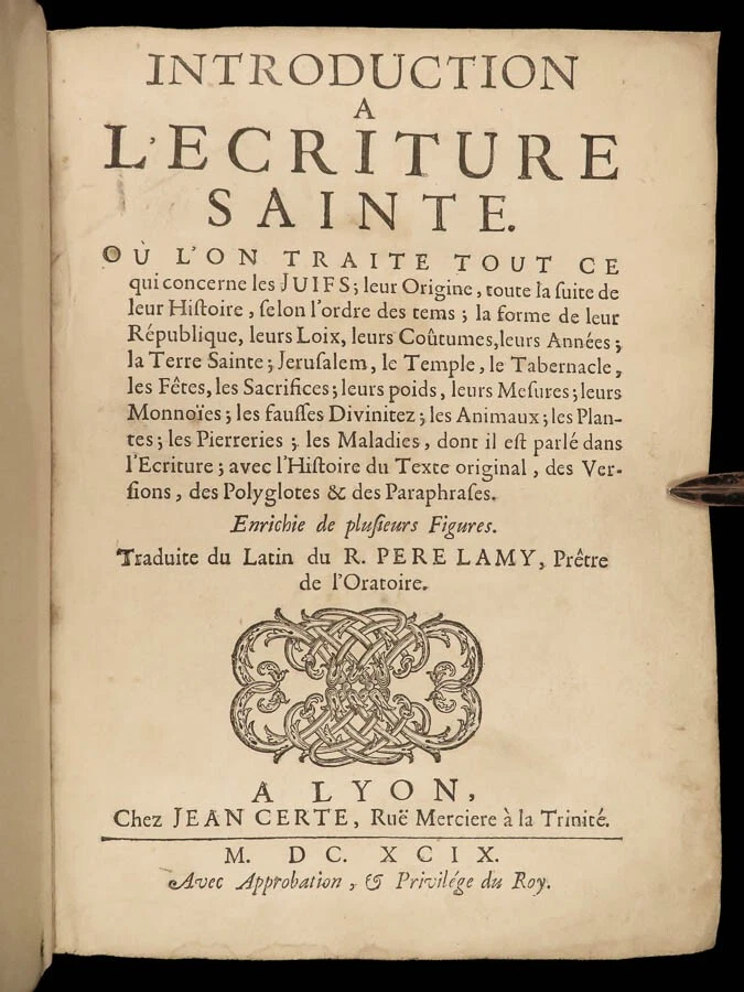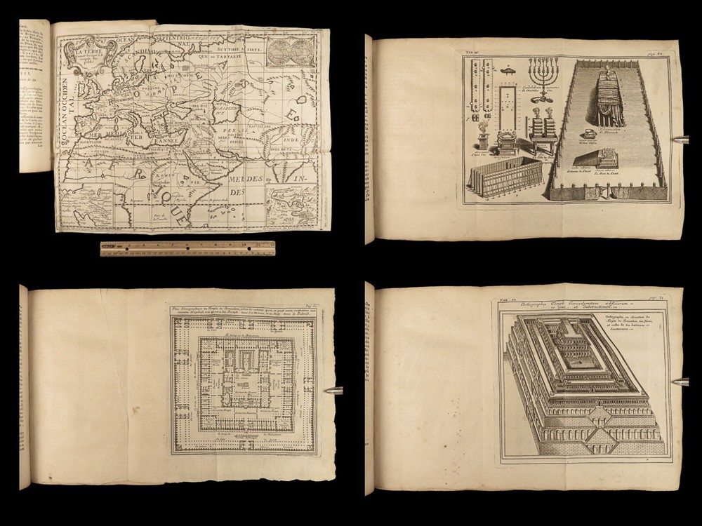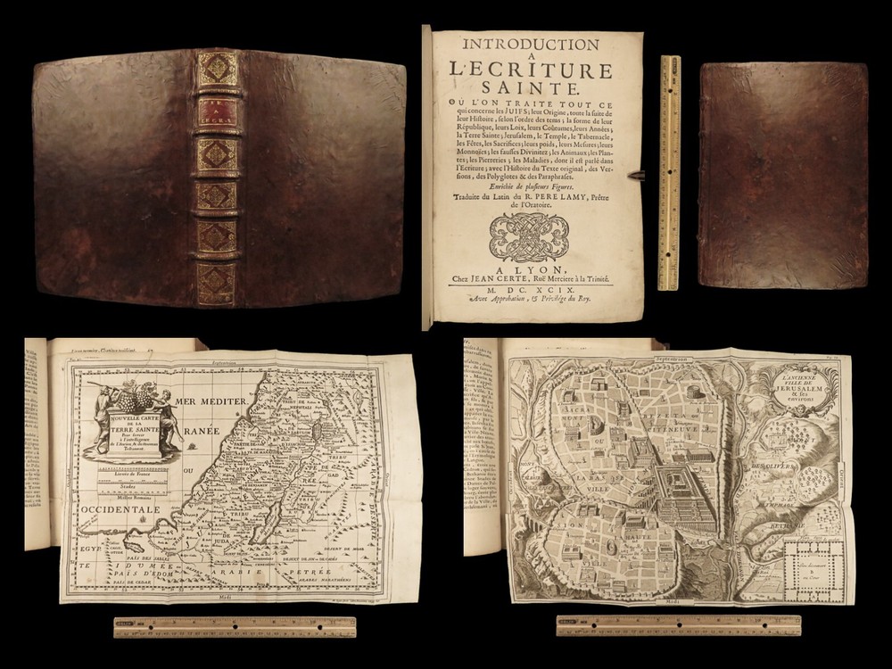 1699 BIBLE MAPS & Bestiary Lamy Illustrated Holy Land Judaica Animals Hebrews Bernard Lamy was a 17 th -century French theologian and mathematician who published treatises on biblical studies and mathematics. One of his most notable works was ‘ Introduction to Holy Scriptures’ which was originally titled ‘ Apparatus ad Biblia Sacra ’. This work was written to discuss the validity of the Books of Tobias and Judith, which were not included in the biblical canon by the Council of Trent. Lamy also discusses the history of the Hebrew people, the Jewish temple and tabernacle, the Holy Land itself, and the Jewish culture and customs mentioned in the Bible. This rare 1699 edition features an impressive folding map of the Holy Land, folding charts, and plates throughout. Item number: #24166 Price: $1195 LAMY, Bernard Introduction à l'Ecriture sainte. Où l'on traite tout ce qui concerne les Juifs ; leur Origine, toute la suite de leur Histoire, selon l'ordre des tem Lyon : Jean Certe, 1699. Details : · Collation: Complete with all pages o viii, [20], 423, [49] o 11 folding plates and charts (including 3 maps) o 11 full-page engravings · Language: French · Binding: Leather; tight and secure · Size : ~10in X 7.5in (25cm x 19cm) Our Guarantee: Very Fast. Very Safe. Free Shipping Worldwide. Customer satisfaction is our priority! Notify us with 7 days of receiving, and we will offer a full refund without reservation! 24166
