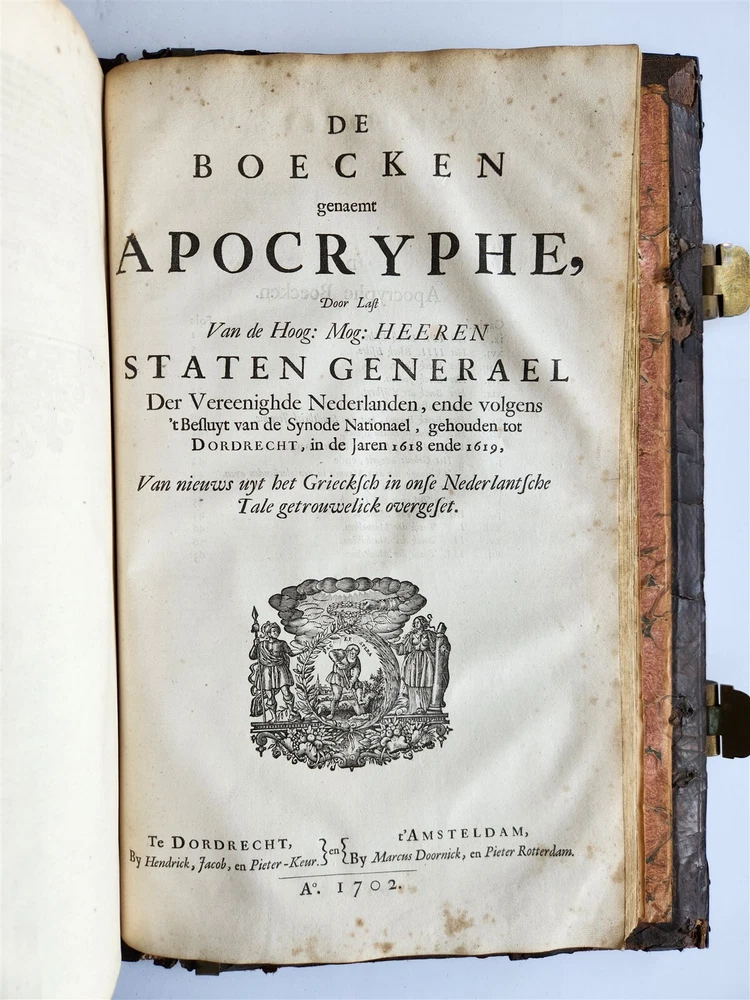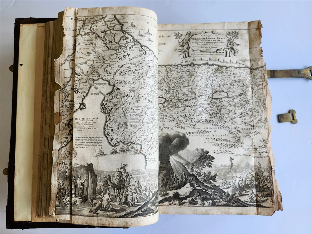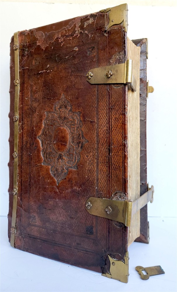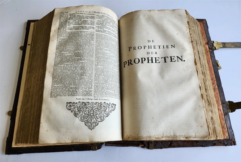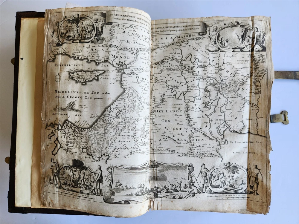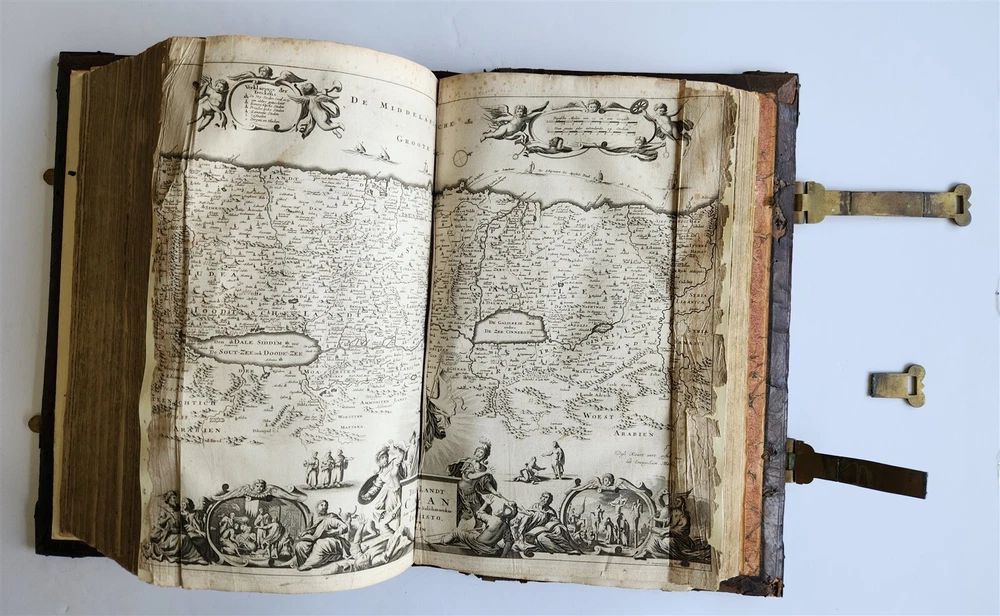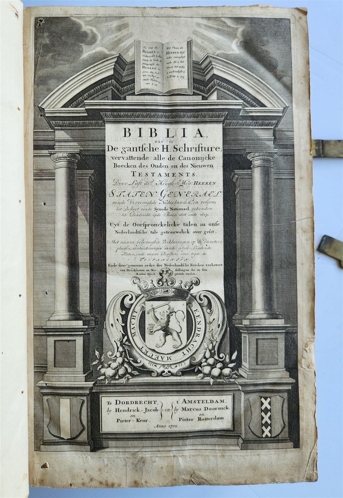 Monumental Dutch "Keur" Bible Biblia, Dat is De gantsche H. Schrifture, vervattende alle de Canonijcke Boecken des Ouden en des Nieuwen Testaments. Door last der Hoogh-Mog. Heeren Staten Generael vande Vereenighde Nederlanden en volgens het Besluyt vande Synode Nationael (...) - Oude Testament + Nieuwe Testament + Apocriefe boeken Biblia, That is The entire Holy Scripture, containing all the Canonical Books of the Old and New Testament. By order of the Most High Lords States General of the United Netherlands and according to the Decree of the National Synod (...) Old Testament + New Testament + Apocryphal books Dordrecht, Hendrik, Jacob en Pieter Keur / Amsterdam, Marcus Doornick & Pieter Rotterdam; 1702 4 parts in 1 volume Engr. illustrations: general title, 6 double-page maps: Printed in Gothic type in 2 columns New Testament and Apocrypha with separate title Original blind-stamped calf leather binding over wooden boards, covers with large blind central ornament within double ruled frame and corner pieces, brass fittings (4 corner pieces and 2 clasps), spine with raised bands some wear, new endpapers, some repairs of the maps, occasional spots, one of the clasps broken, rebacked At the time the 'Werelt Caert' was published, the entire world had not yet been explored and known. California was drawn as an island, Australia had yet to be partly discovered and was designated as 'New Holland'! Massive folio. Size 10 by 16.5 inches Thickness over 5 inches Text in Dutch ================= Please see my other auctions Thank You Refund Policy: We will issue a FULL REFUND, 100% money back if you are not satisfied with your purchase. Items must be returned to us within 20 days in order to receive a refund or replacement. Buyer is responsible for shipping costs. Powered by SixBit's eCommerce Solution