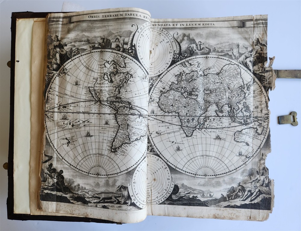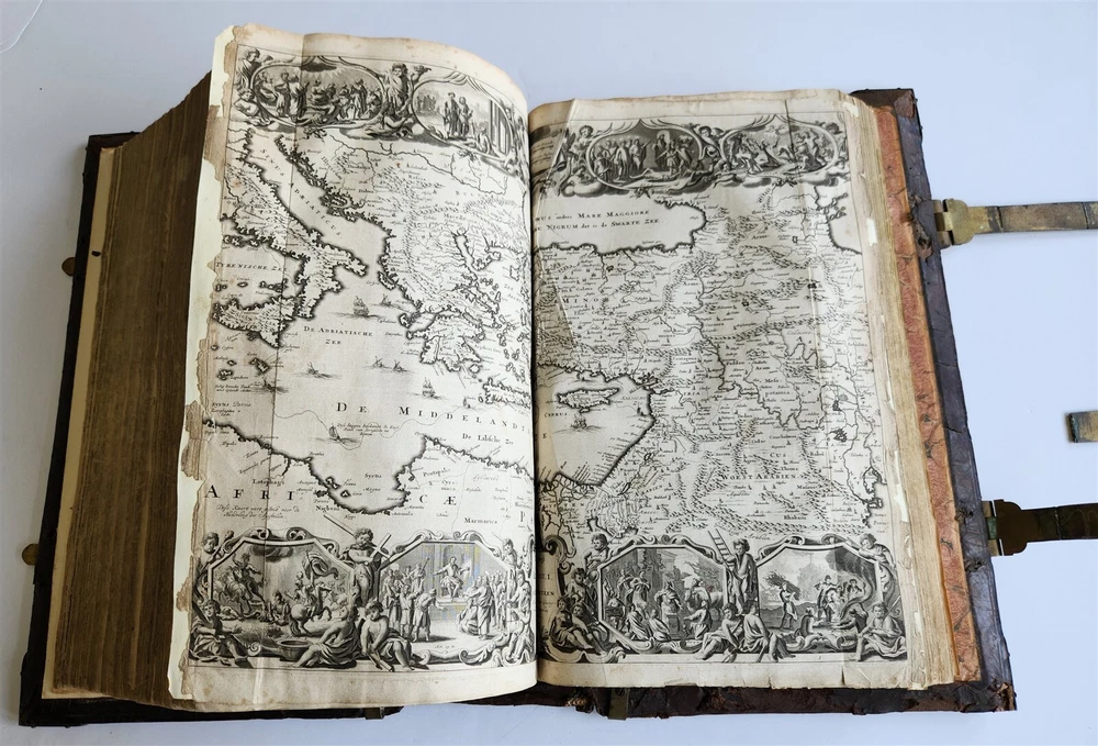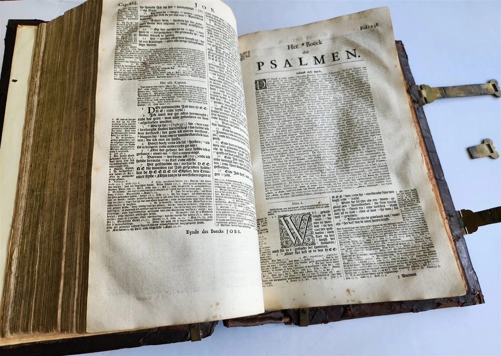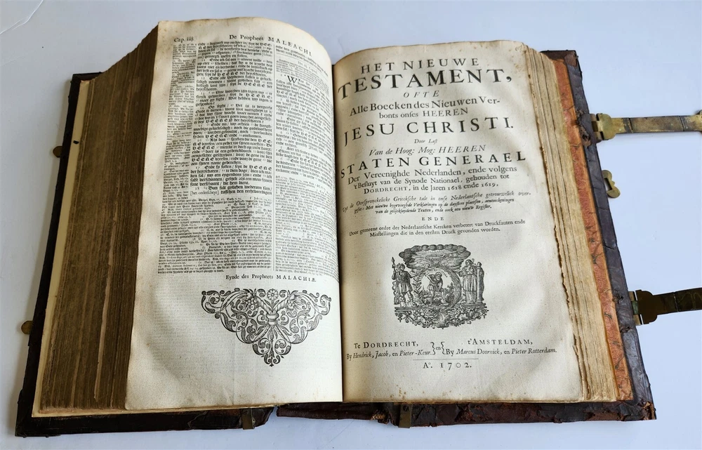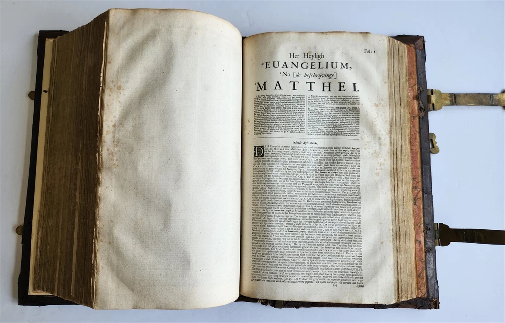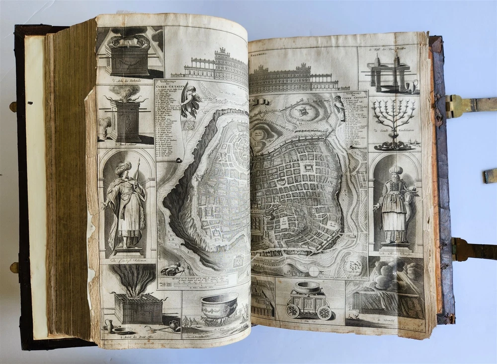 Monumental Dutch "Keur" Bible Biblia, Dat is De gantsche H. Schrifture, vervattende alle de Canonijcke Boecken des Ouden en des Nieuwen Testaments. Door last der Hoogh-Mog. Heeren Staten Generael vande Vereenighde Nederlanden en volgens het Besluyt vande Synode Nationael (...) - Oude Testament + Nieuwe Testament + Apocriefe boeken Biblia, That is The entire Holy Scripture, containing all the Canonical Books of the Old and New Testament. By order of the Most High Lords States General of the United Netherlands and according to the Decree of the National Synod (...) Old Testament + New Testament + Apocryphal books Dordrecht, Hendrik, Jacob en Pieter Keur / Amsterdam, Marcus Doornick & Pieter Rotterdam; 1702 4 parts in 1 volume Engr. illustrations: general title, 6 double-page maps: Printed in Gothic type in 2 columns New Testament and Apocrypha with separate title Original blind-stamped calf leather binding over wooden boards, covers with large blind central ornament within double ruled frame and corner pieces, brass fittings (4 corner pieces and 2 clasps), spine with raised bands some wear, new endpapers, some repairs of the maps, occasional spots, one of the clasps broken, rebacked At the time the 'Werelt Caert' was published, the entire world had not yet been explored and known. California was drawn as an island, Australia had yet to be partly discovered and was designated as 'New Holland'! Massive folio. Size 10 by 16.5 inches Thickness over 5 inches Text in Dutch ================= Please see my other auctions Thank You Refund Policy: We will issue a FULL REFUND, 100% money back if you are not satisfied with your purchase. Items must be returned to us within 20 days in order to receive a refund or replacement. Buyer is responsible for shipping costs. Powered by SixBit's eCommerce Solution