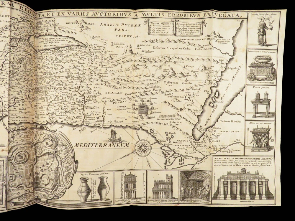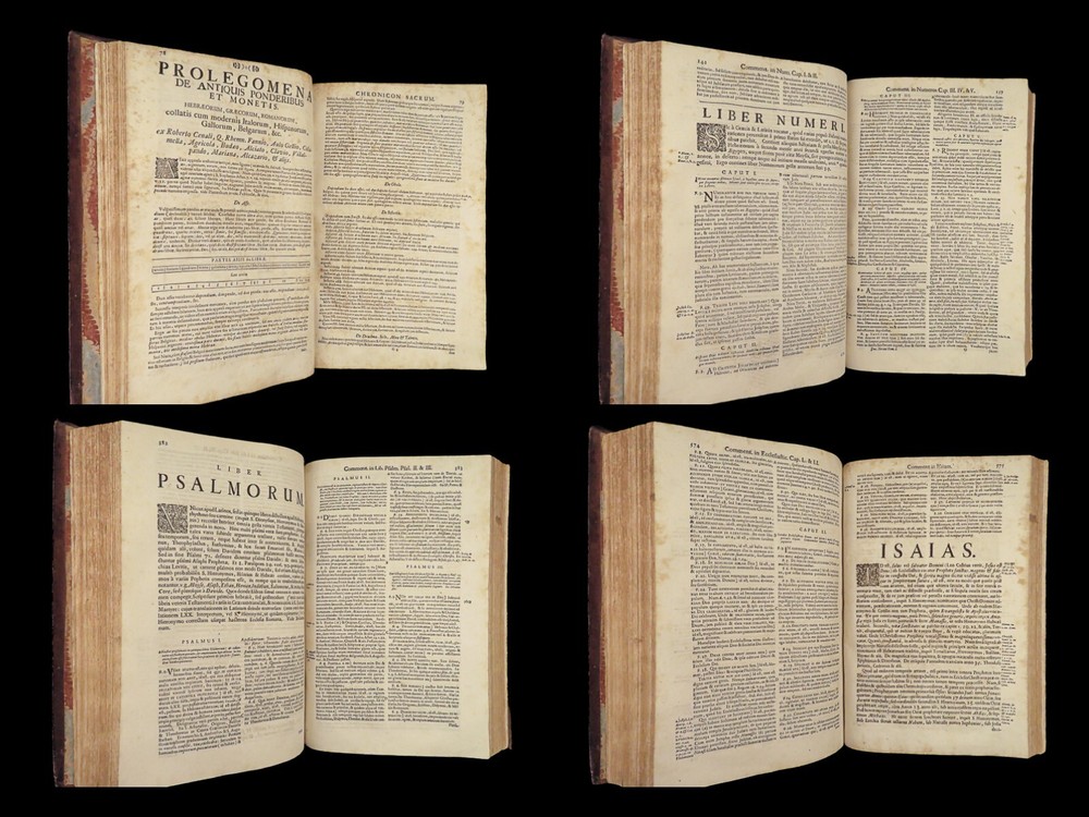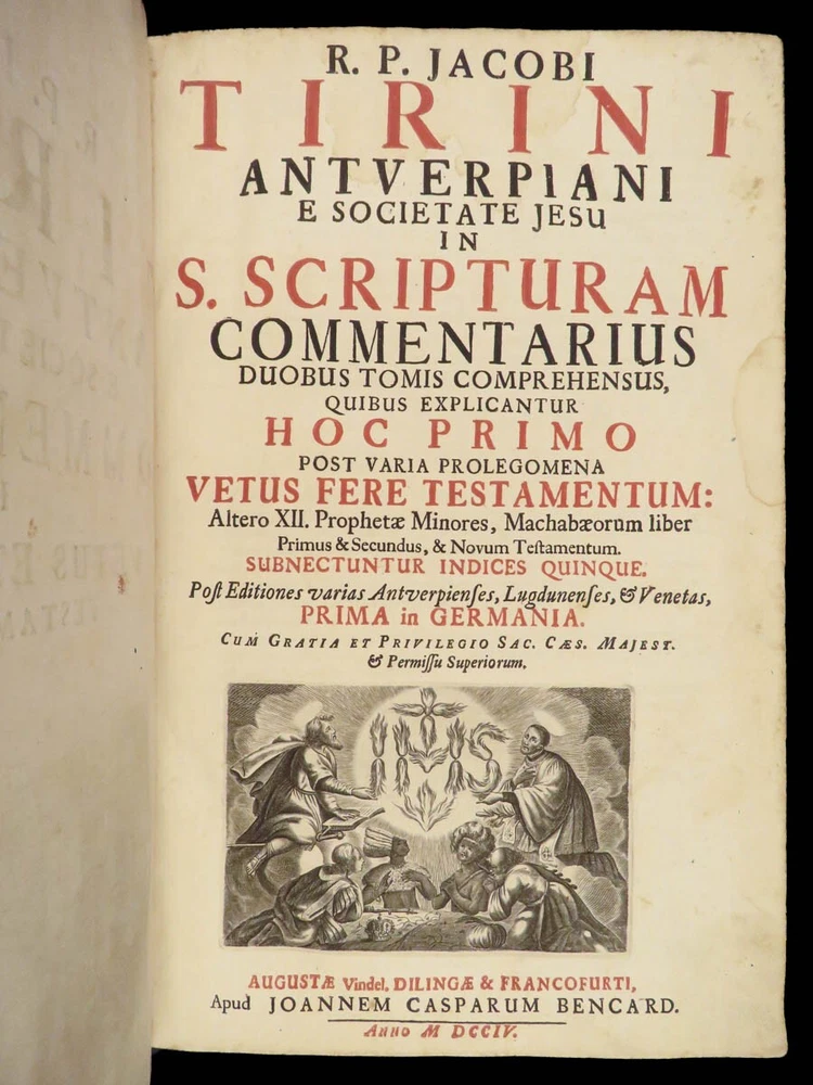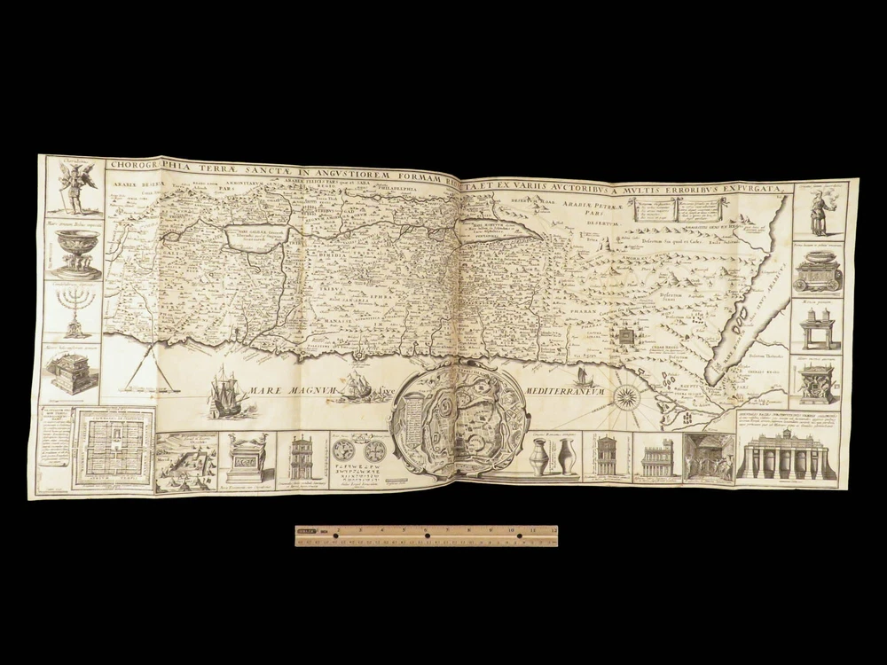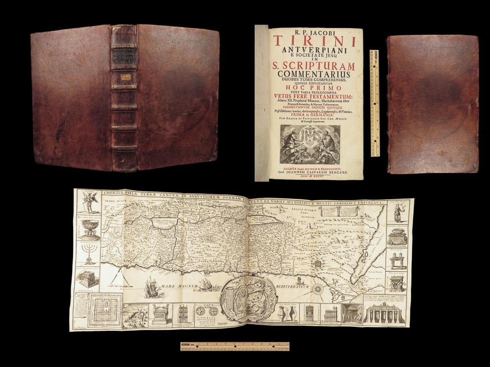 1704 ENORMOUS Jesuit BIBLE Commentary HUGE MAP Old Testament Psalms Tirinus Jacob Tirinus was an early 17 th -century Belgian Jesuit who was best-known for his Bible commentary. First published in 1645, “ Commentarius in Sacram Scripturam ”, this commentary not only contains annotations on the books of the Bible but also includes descriptions of the Holy Land and other major locations covered in the Bible such as Egypt, Babylon, and Syria. This huge tome from the 1704 Frankfurt edition includes commentary on the Pentateuch, Kings, Chronicles, Job, Psalms, Ecclesiastes, Song of Songs, Isaiah, Jeremiah, Lamentations, Ezekiel, and Daniel. It also includes non-canonical books such as ‘ Sapientiae’ , or Wisdom of Solomon, Baruch, and ‘Sirach’ . Item number: #27871 Price: $499 TIRINUS, Jacobus R. p. Jacobi Tirini Antverpiani e Societate Jesu in S. Scripturam commentaries Dilingae & Francofurti: apud Joannem Casparum Bencard, 1704. Details : · Collation: Complete with all pages; o [16], 788 (i.e., 784) o Double-page folding map, 6 folding charts · Provenance: Handwritten o Alois Gerster o Aloiis Arnold · Language: Latin · Binding: Leather; tight and secure · Size: ~13.25in X 9in (33.5cm x 22.5cm) Our Guarantee: Very Fast. Very Safe. Free Shipping Worldwide. Customer satisfaction is our priority! Notify us with 7 days of receiving, and we will offer a full refund without reservation!