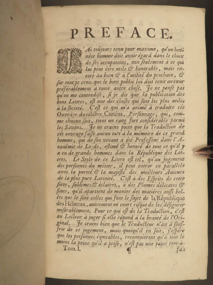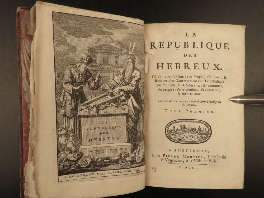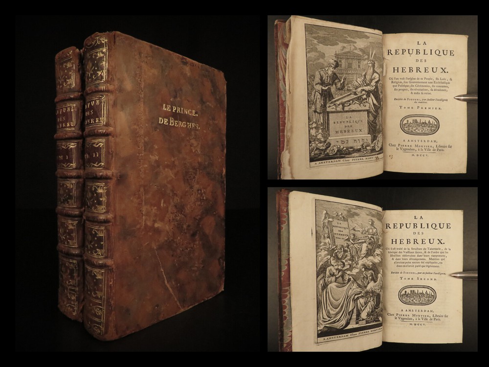 1705 Hebrew Republic MAPS Judaism Judaica Republican Semitism Cunaeus Jewish LAW Petrus Cunaeus was an early 17 th -century Dutch scholar whose ‘Hebrew Republic’ is considered, according to Tuck , “the most powerful statement of republican theory in the early years of the Dutch Republic.” (Tuck, 169) “De Republica Hebraeorum” describes ancient Hebrew kingdoms and portrays it as the model of republican governments. This book was highly influential on the formation of the Dutch Republic, even though Cunaeus foresaw the Dutch government falling just as Rome did. Ultimately, Cunaeus sought for the book to instill tolerance toward 17 th -century Jews through the publication of ‘ Republica .’ Item number: #19736 Price: $950 CUNAEUS, Petrus La republique des Hebreux... Enrichie de figures, pour faciliter l'intelligence des matières. A Amsterdam : chez Pierre Mortier,... M.DCCV., 1705. First edition. Details : · Collation: Complete with all pages o Vol. I – [26], 396, [24] o Vol. II – [14], 384, [16] o 38 engravings · References: Tuck, Philosophy and Government · Provenance: o Binding stamp – Le Prince. de Berghes. § Likely Alphonse Dominique François de Berghes (d. 1721), 2nd Prince of Grimberghen and a Grandee of Spain. He was also brother to Georges-Louis de Berghes (1662–1743), the 94 th prince-bishop of Liège. o Armorial Bookplate § Possibly House of Glymes, a noble house of Belgium, descendants of the Dukes of Brabant. Glymes or Glimes is a municipality of Incourt. Their descendants of the branch of Grimberghen are styled as the Prince de Grimberghen. · Language: French · Binding: Leather; tight and secure · Size : ~6.75in X 4.5in (17.5cm x 11.5cm) Our Guarantee: Very Fast. Very Safe. Free Shipping Worldwide. Customer satisfaction is our priority! Notify us with 7 days of receiving, and we will offer a full refund without reservation! 19736