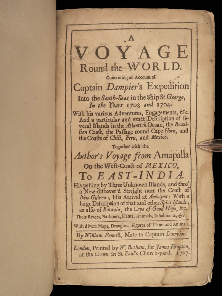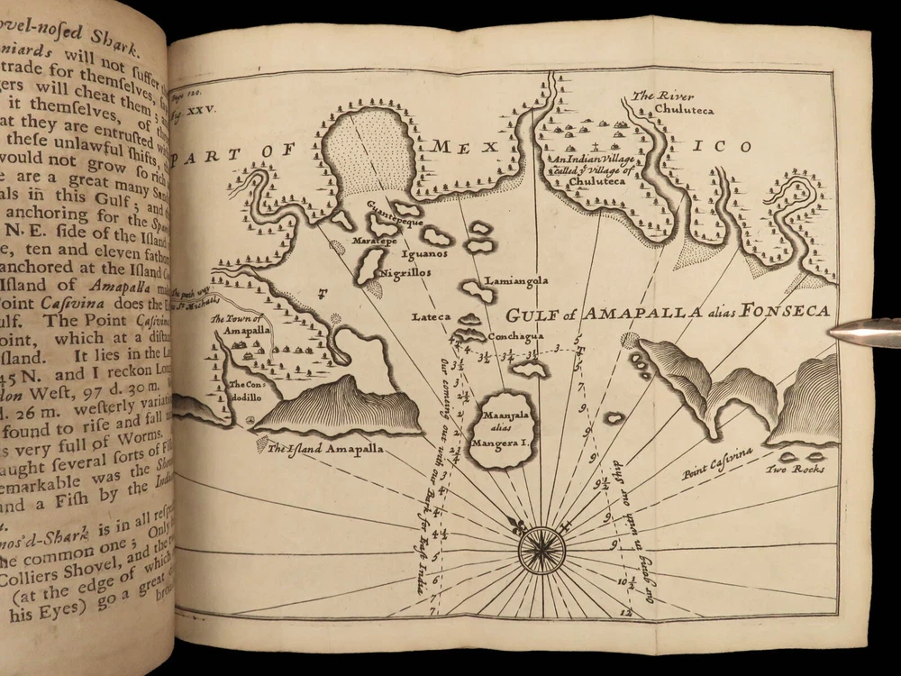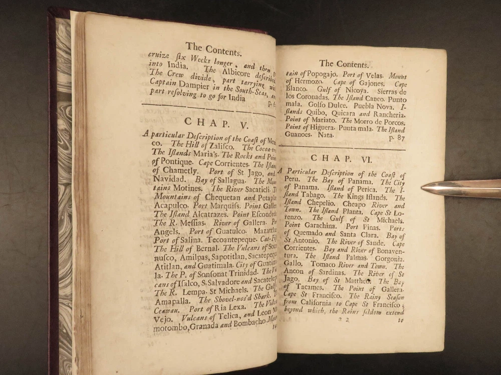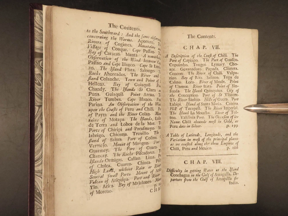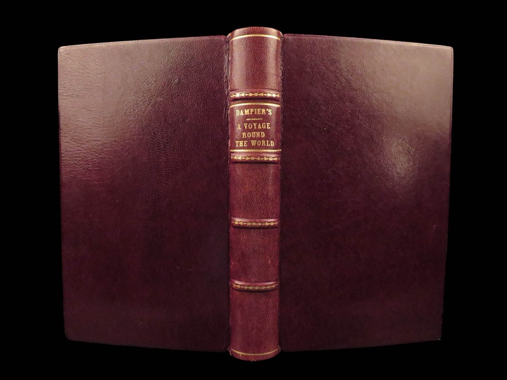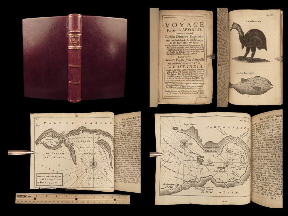 1707 William Dampier Voyages 1 ed Illustrated MAPS Pirates PERU Honduras Funnell An incredibly rare and desirable voyages book on William Dampier’s 1703 South Seas voyage! ‘ Voyage Round the World’, reminiscent of Dampier’s similarly titled work, covers the most important and aspects of Dampier’s adventures in Mexico, Brazil, Cape Horn, Chili, and Peru. Author William Funnel was the first mate to Dampier and wrote a first-hand account of all the encounters and discoveries on Dampier’s voyage. This voyage, which circumnavigated the world, was initiated with the intents of pirating Spanish ships for their role in the War of Spanish Succession. Unfortunately for Dampier, mutiny was afoot and he was marooned at Amapalla Bay. Funnell completed the voyage for Dampier and published this exceedingly rare and valuable account of the voyage. This 1707 first edition features stunning folding maps and full-page illustrations. The map of the Gulf of Amapalla is especially desirable. Item number: #26112 Price: $1599 FUNNELL, William A voyage round the world containing an account of Captain Dampier's expedition into the South-Seas in the ship St George, in the years 1703 and 1704 London: Printed by W. Botham, for James Knapton, 1707. First edition. Details : · Collation: o [24], 300 (i.e., 298), [18] § Wanting p. 25-26, 41-44 § P. 27-32, 289-300, p. [1-2] of index present but damaged o 9 engraved plates (of 10), 4 maps and charts (of 5) · References: Leclerc, Americana , 415; Sabin 26213; Lowndes 585; Hill 64 · Language: French · Binding: Leather; tight and secure · Size : ~8in X 5in (20cm x 12.5cm) · VERY rare, valuable, and desirable with auction records and price comparisons between $6,000-$7500 Our Guarantee: Very Fast. Very Safe. Free Shipping Worldwide. Customer satisfaction is our priority! Notify us with 7 days of receiving, and we will offer a full refund without reservation! 26112