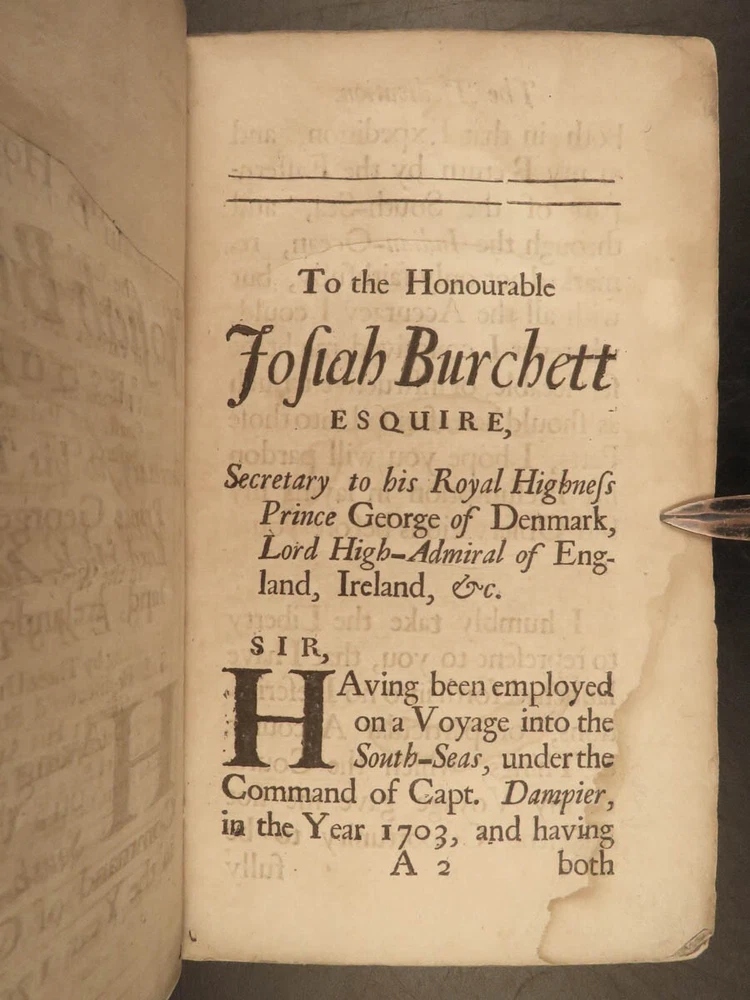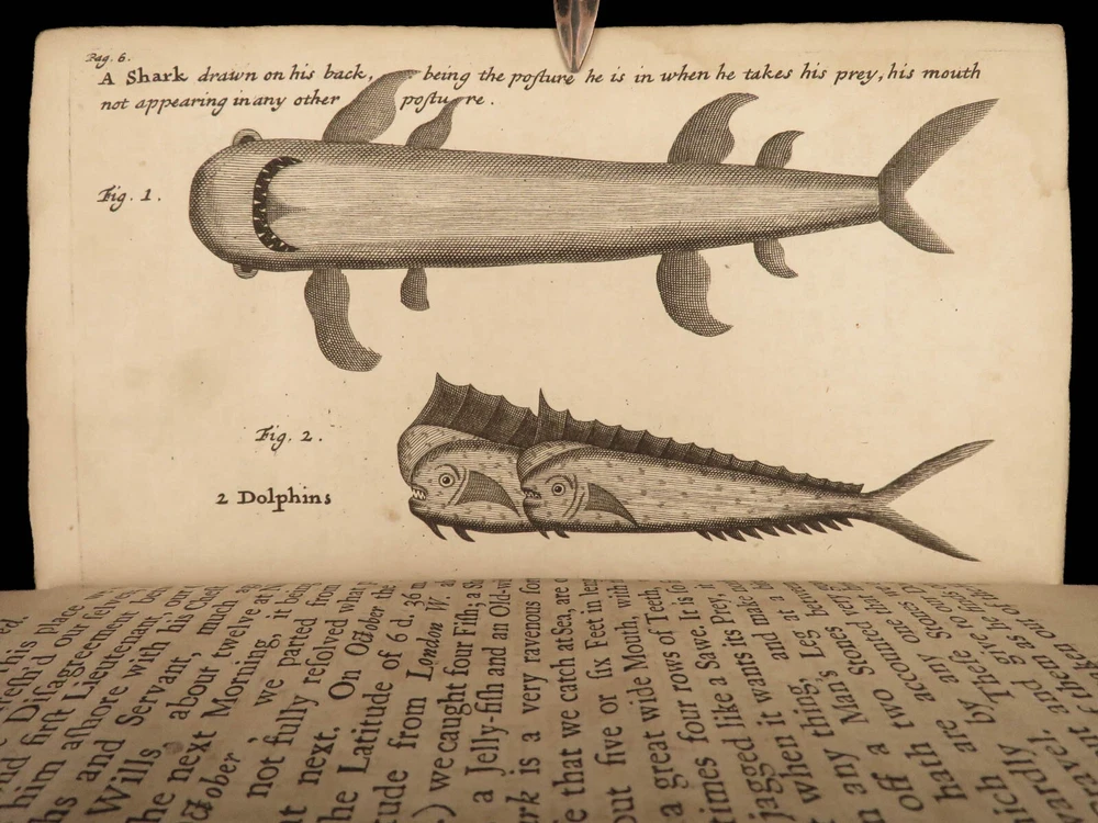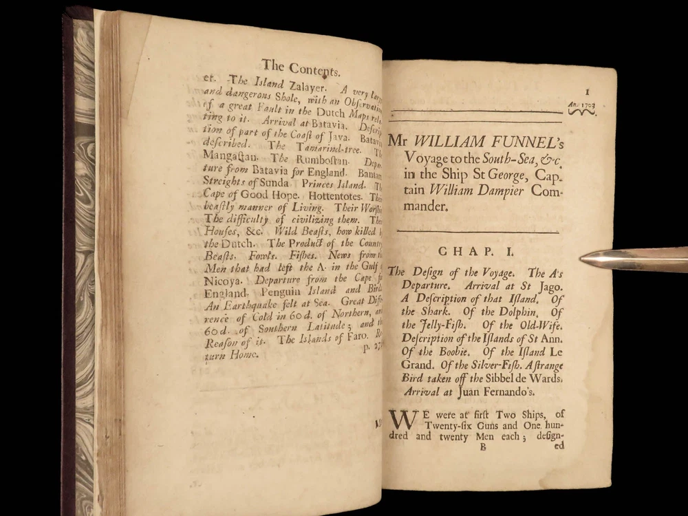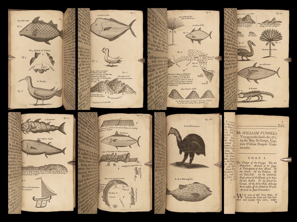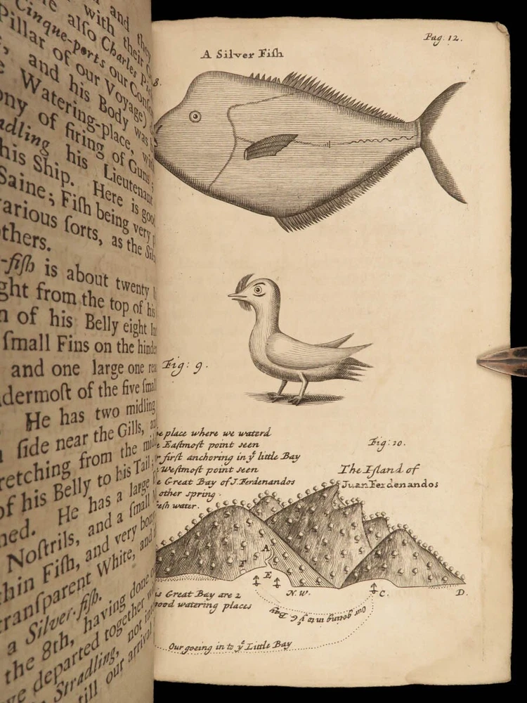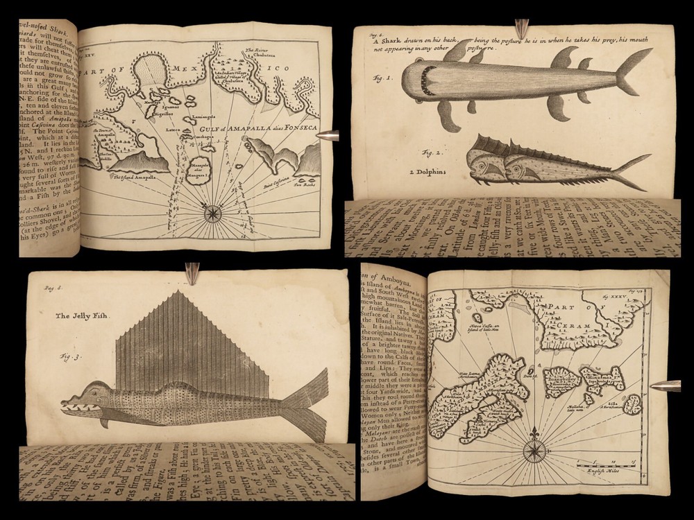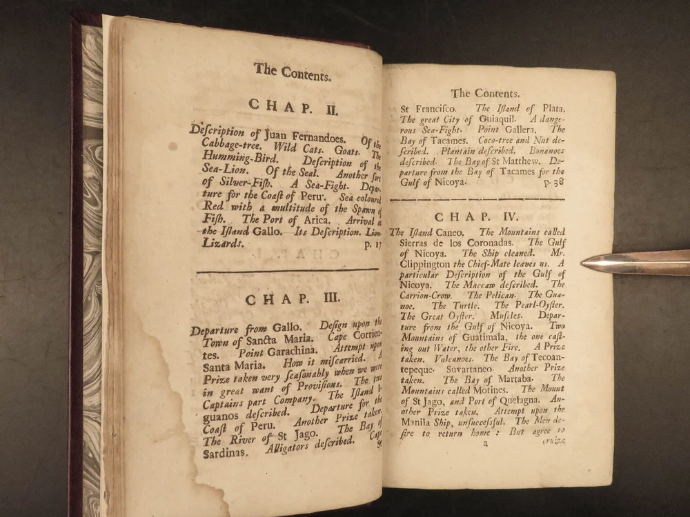 1707 William Dampier Voyages 1 ed Illustrated MAPS Pirates PERU Honduras Funnell An incredibly rare and desirable voyages book on William Dampier’s 1703 South Seas voyage! ‘ Voyage Round the World’, reminiscent of Dampier’s similarly titled work, covers the most important and aspects of Dampier’s adventures in Mexico, Brazil, Cape Horn, Chili, and Peru. Author William Funnel was the first mate to Dampier and wrote a first-hand account of all the encounters and discoveries on Dampier’s voyage. This voyage, which circumnavigated the world, was initiated with the intents of pirating Spanish ships for their role in the War of Spanish Succession. Unfortunately for Dampier, mutiny was afoot and he was marooned at Amapalla Bay. Funnell completed the voyage for Dampier and published this exceedingly rare and valuable account of the voyage. This 1707 first edition features stunning folding maps and full-page illustrations. The map of the Gulf of Amapalla is especially desirable. Item number: #26112 Price: $1599 FUNNELL, William A voyage round the world containing an account of Captain Dampier's expedition into the South-Seas in the ship St George, in the years 1703 and 1704 London: Printed by W. Botham, for James Knapton, 1707. First edition. Details : · Collation: o [24], 300 (i.e., 298), [18] § Wanting p. 25-26, 41-44 § P. 27-32, 289-300, p. [1-2] of index present but damaged o 9 engraved plates (of 10), 4 maps and charts (of 5) · References: Leclerc, Americana , 415; Sabin 26213; Lowndes 585; Hill 64 · Language: French · Binding: Leather; tight and secure · Size : ~8in X 5in (20cm x 12.5cm) · VERY rare, valuable, and desirable with auction records and price comparisons between $6,000-$7500 Our Guarantee: Very Fast. Very Safe. Free Shipping Worldwide. Customer satisfaction is our priority! Notify us with 7 days of receiving, and we will offer a full refund without reservation! 26112