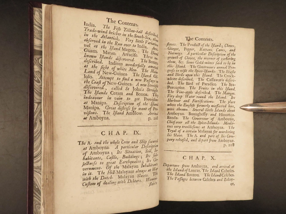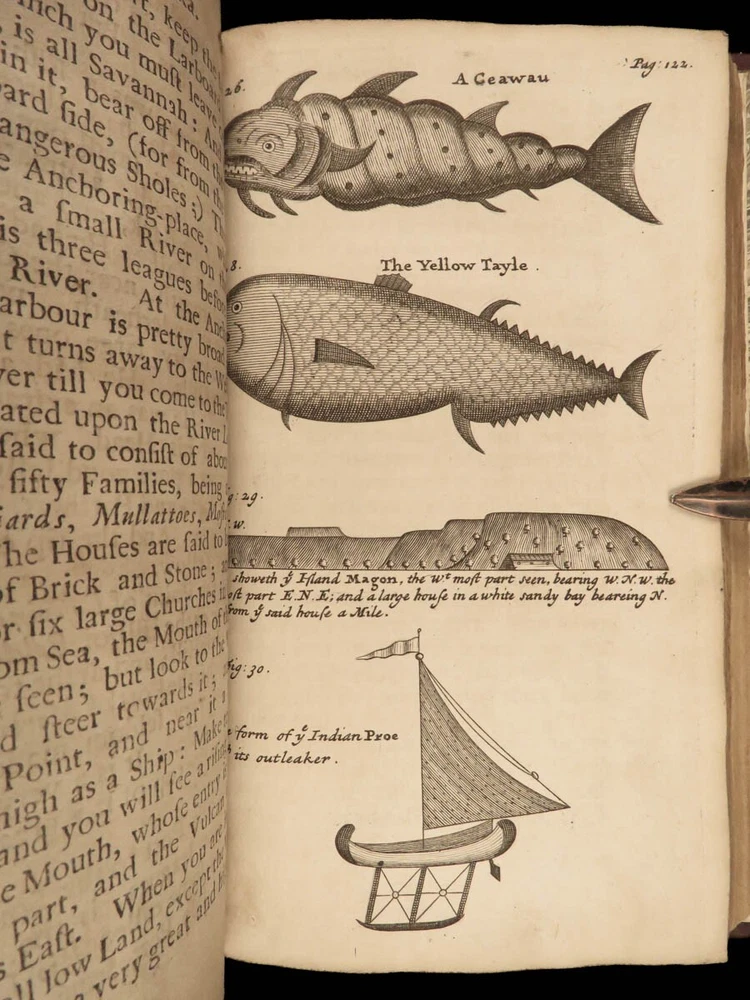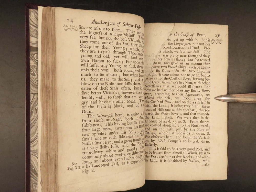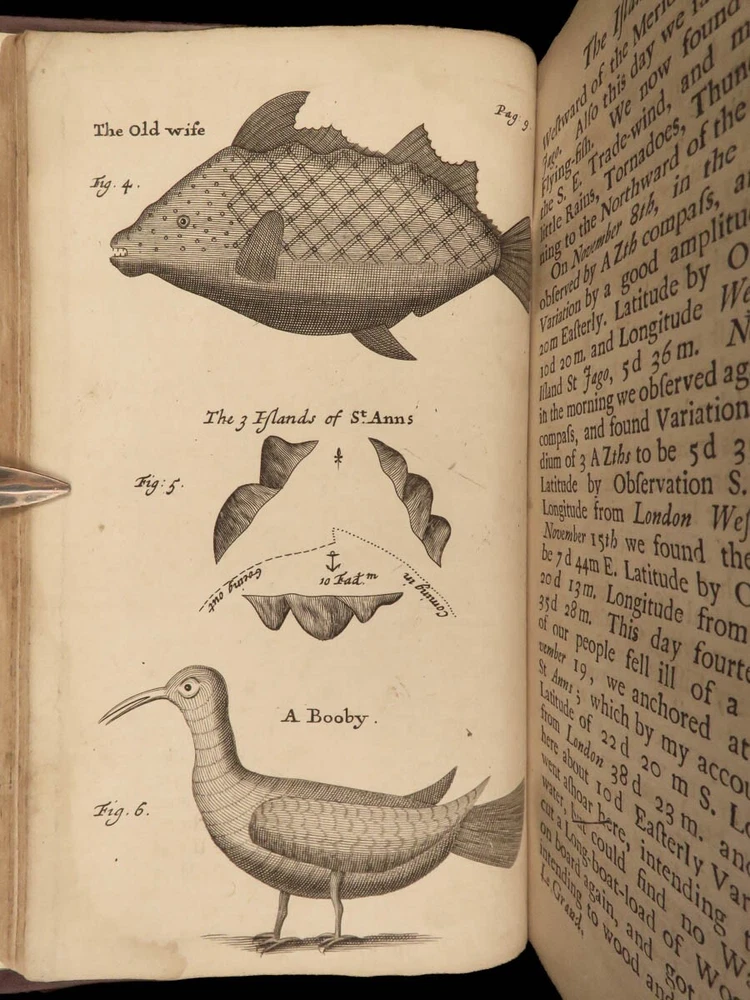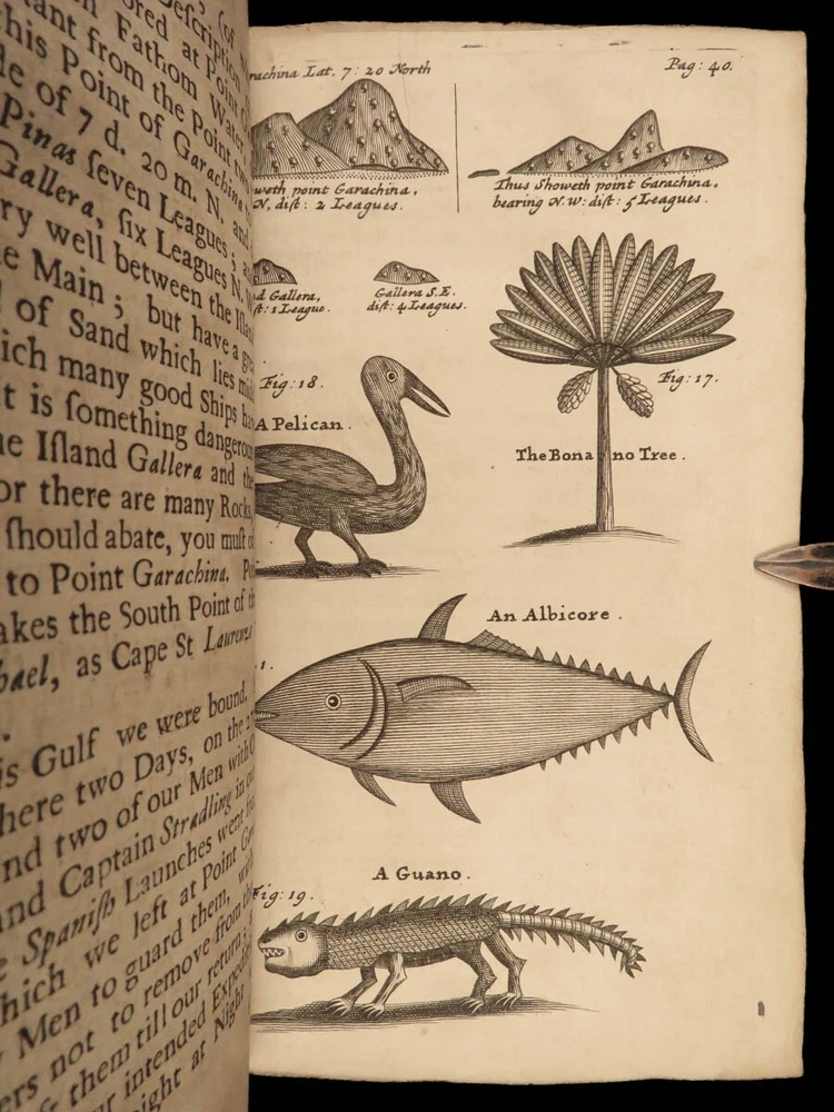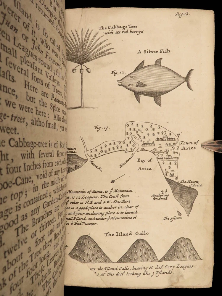 1707 William Dampier Voyages 1 ed Illustrated MAPS Pirates PERU Honduras Funnell An incredibly rare and desirable voyages book on William Dampier’s 1703 South Seas voyage! ‘ Voyage Round the World’, reminiscent of Dampier’s similarly titled work, covers the most important and aspects of Dampier’s adventures in Mexico, Brazil, Cape Horn, Chili, and Peru. Author William Funnel was the first mate to Dampier and wrote a first-hand account of all the encounters and discoveries on Dampier’s voyage. This voyage, which circumnavigated the world, was initiated with the intents of pirating Spanish ships for their role in the War of Spanish Succession. Unfortunately for Dampier, mutiny was afoot and he was marooned at Amapalla Bay. Funnell completed the voyage for Dampier and published this exceedingly rare and valuable account of the voyage. This 1707 first edition features stunning folding maps and full-page illustrations. The map of the Gulf of Amapalla is especially desirable. Item number: #26112 Price: $1599 FUNNELL, William A voyage round the world containing an account of Captain Dampier's expedition into the South-Seas in the ship St George, in the years 1703 and 1704 London: Printed by W. Botham, for James Knapton, 1707. First edition. Details : · Collation: o [24], 300 (i.e., 298), [18] § Wanting p. 25-26, 41-44 § P. 27-32, 289-300, p. [1-2] of index present but damaged o 9 engraved plates (of 10), 4 maps and charts (of 5) · References: Leclerc, Americana , 415; Sabin 26213; Lowndes 585; Hill 64 · Language: French · Binding: Leather; tight and secure · Size : ~8in X 5in (20cm x 12.5cm) · VERY rare, valuable, and desirable with auction records and price comparisons between $6,000-$7500 Our Guarantee: Very Fast. Very Safe. Free Shipping Worldwide. Customer satisfaction is our priority! Notify us with 7 days of receiving, and we will offer a full refund without reservation! 26112