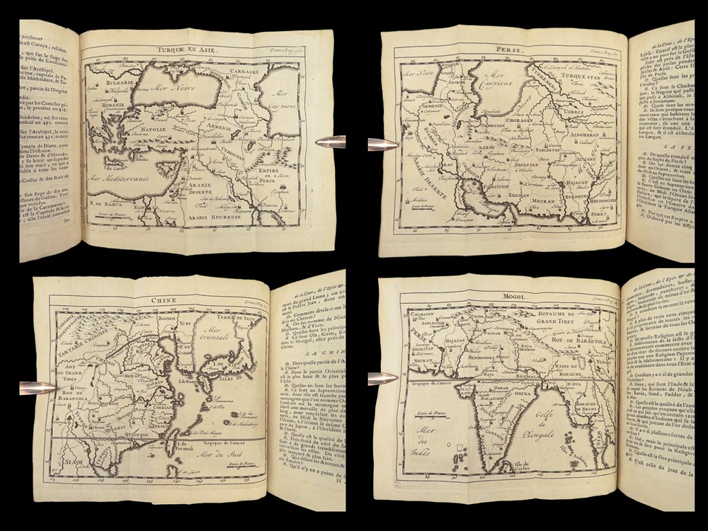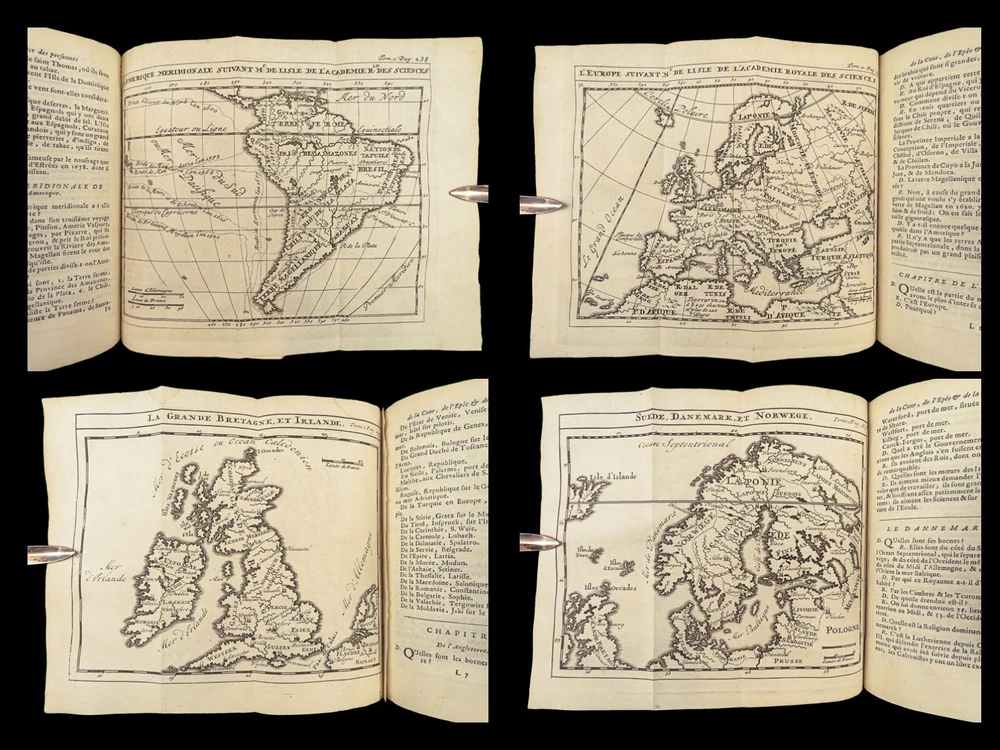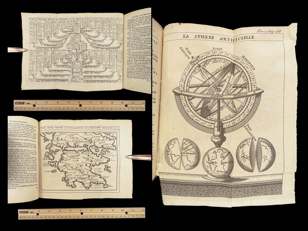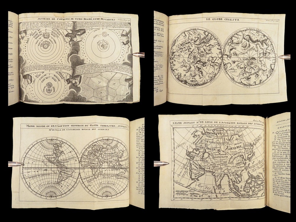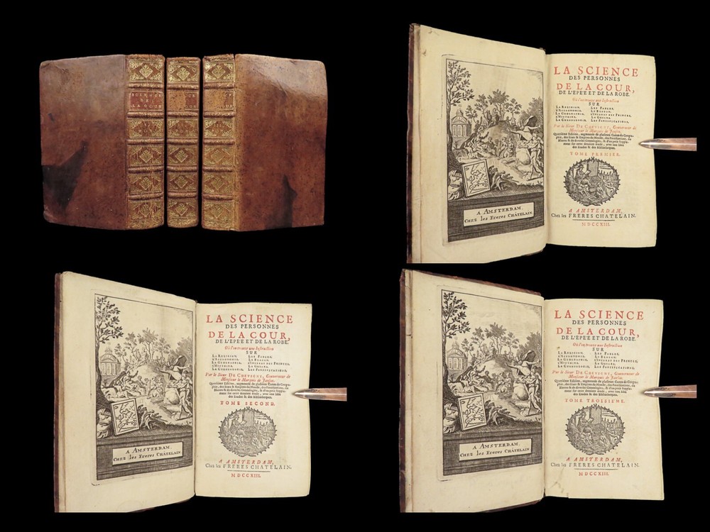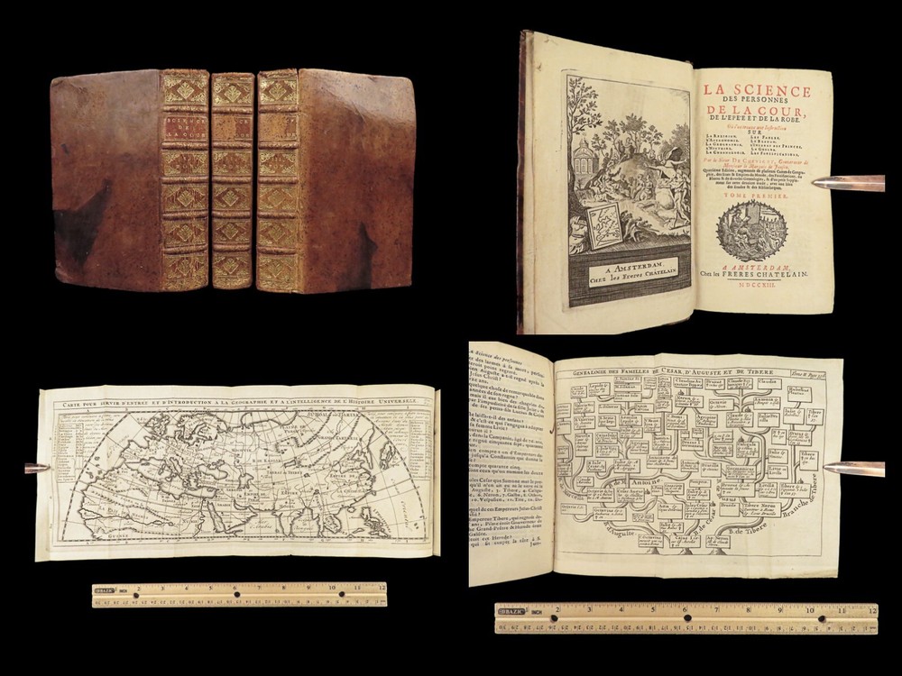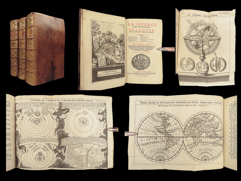 1713 ATLAS Chevigny SCIENCE Encyclopedia Geography Astronomy Zodiac America MAPS The first edition of Chevigny’s “ La Science des la Cour ” appeared in 1706. It covered many fields of knowledge including religion, astronomy, geography, fine art, wars, fortifications, royal families, architecture, marine life, and fairy tales. This three-volume 1713 edition discusses many fascinating topics including: · Religions of the world, general worship, Christian rites and customs · Chronology of the world – beginning with the Old Testament · Temple of Solomon; Foundation of Rome; Cyrus and the Jews · Rise of the Ottoman Empire · Protestant Reformation – Luther and Calvin · Spanish Reformation with Philippe V · George I and English Succession · Astronomy; astrology & religious undertones · General geography · Turkey and Asia Minor · Persia · Tartary · China · India · Egypt and Barbary, Sahara Desert · Congo, Nigeria, Ethiopia · South America – Brazil Peru, Chili · North America – Mexico, Canada; oil and tobacco trade Many of the sections are written in a question-and-answer setting and includes dozens of incredible illustrations and maps such as views of the solar system, mathematical figures, constellations and the zodiac, and maps! Item number: #27452 Price: $950 CHEVIGNY La Science Des Personnes De La Cour, De L'Epée Et De La Robe Amsterdam: Freres Chatelain, 1713. Details : · Collation: 3 volumes o Vol. I – [22], 396, [12] § Two engraving and p. 53-54 present but damaged o Vol. II – [6], 400 o Vol. III – [2], 188 § Indee Generale des Etudes – 209, [3] § Included with separate title page o 46 folding engravings, 3 frontispieces · Provenance: Handwritten – Auguste de Rocquigny · Language: French · Binding: Leather; tight and secure · Size: ~6.75in X 4in (17cm x 10.5cm) Our Guarantee: Very Fast. Very Safe. Free Shipping Worldwide. Customer satisfaction is our priority! Notify us with 7 days of receiving, and we will offer a full refund without reservation!