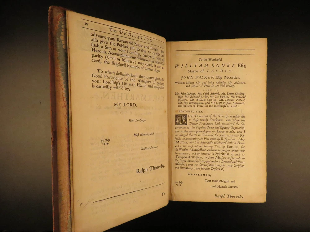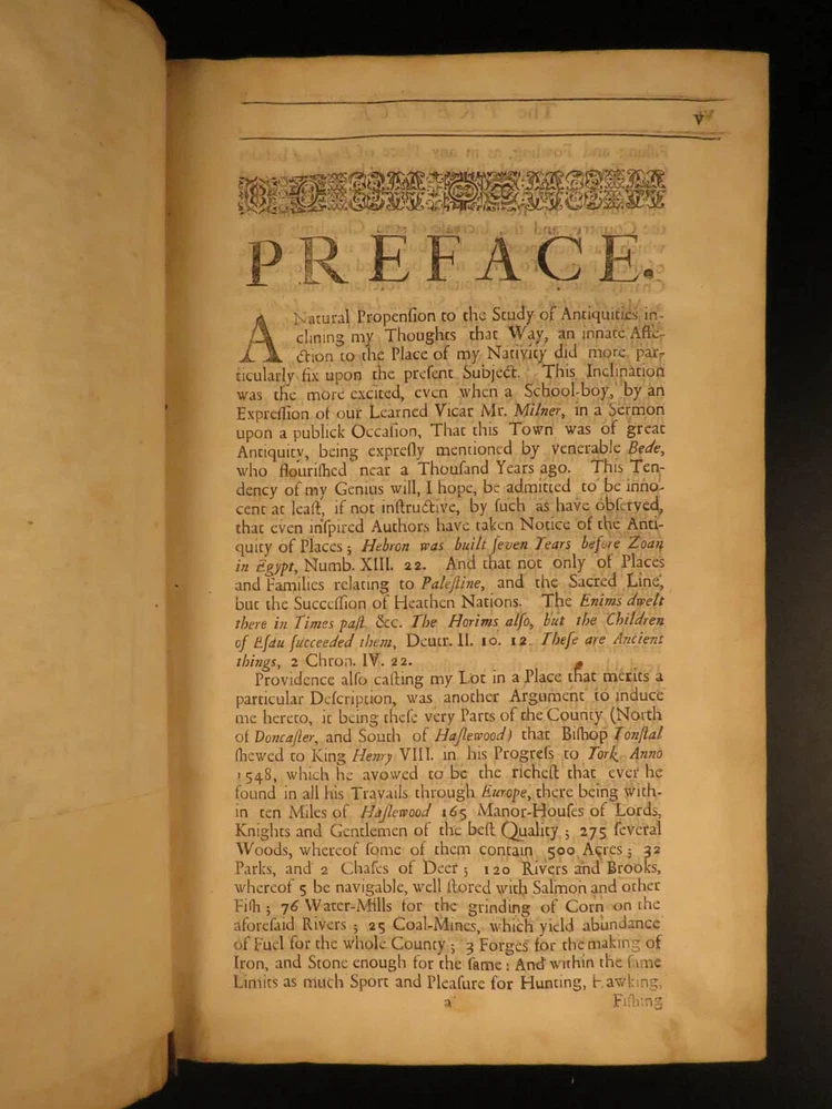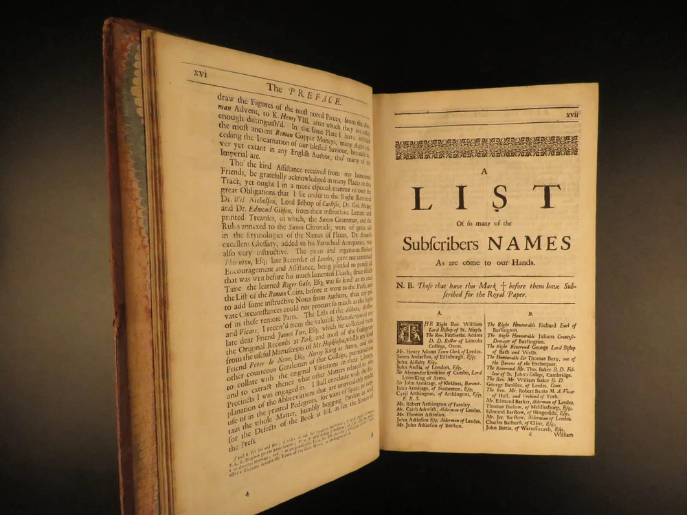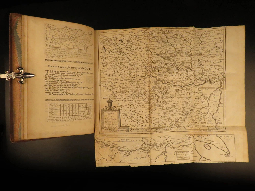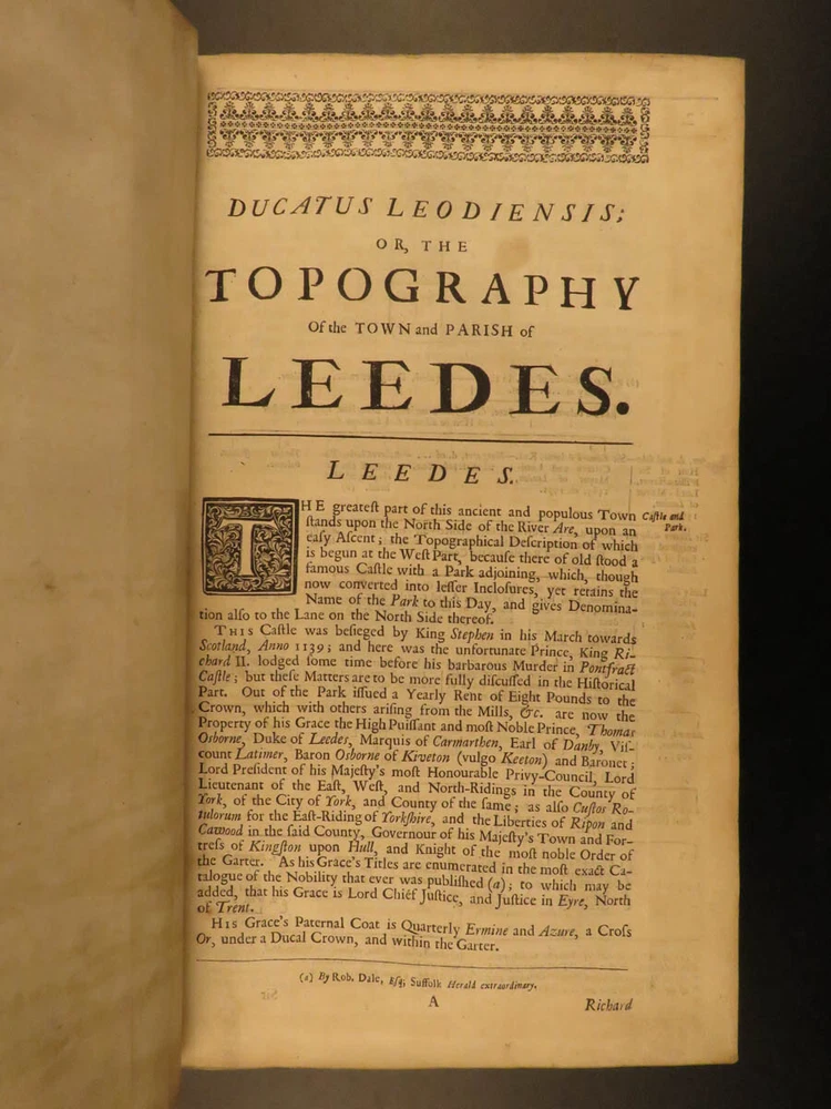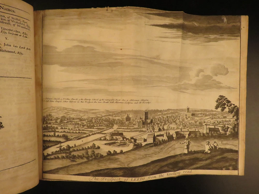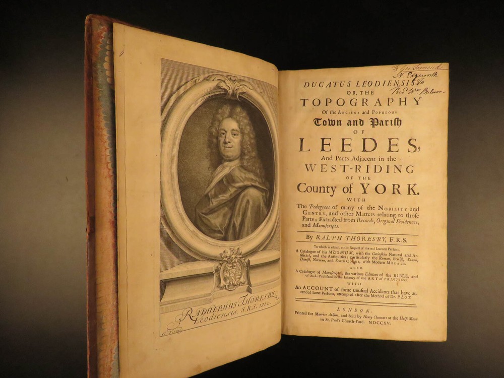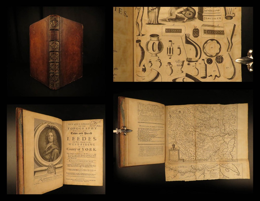 1715 1 st ed LEEDS England Topography Architecture Thoresby MAP Geography London Ralph Thoresby was a 17 th -century English historian who is best remembered for his books on the history of Leeds, England. In 1715, Thoresby published “ The Topography of the Parish of Leeds ” – a description of the history, geography, architecture, and monuments of Leeds. Thoresby published the first edition of ‘ Leeds’ with a descriptive catalogue of the “artificial rarities” found in his Leeds museum. This impressive first edition includes the folding map of Leeds which is often lacking. Item number: #11879 Price: $795 THORESBY, Ralph Ducatus leodiensis: or, The topography of the ancient and populous town and parish of Leedes, and parts adjacent in the West-riding of the county of York ... extracted from records, original evidences, and manuscripts; to which is added ... A catalogue of his museum ... also a catalogue of manuscripts; the various editions of the Bible, and the books published in the infancy of the art of printing; with an account of some unusual accidents that have attended some persons, attempted after the method of Dr. Plot. London, Printed for Maurice Atkins, 1715. First edition. Details : · Collation: Complete with all pages o xxii, 268; [3], 276-628, [12] o 66 engravings § 11 full-page & folding plates § 55 in-text engravings · Provenance: o Armorial Bookplate – Anon. o Stamp – Walter L. Grayson o Handwritten – Geo. Townend o Handwritten – N. Edgeworth o Handwritten – Rev d . Wm. Bielmon · Language: English · Binding: Leather; secure · Size : ~12.5in X 8in (32cm x 20.5cm) Our Guarantee: Very Fast. Very Safe. Free Shipping Worldwide. Customer satisfaction is our priority! Notify us with 7 days of receiving, and we will offer a full refund without reservation! 11879