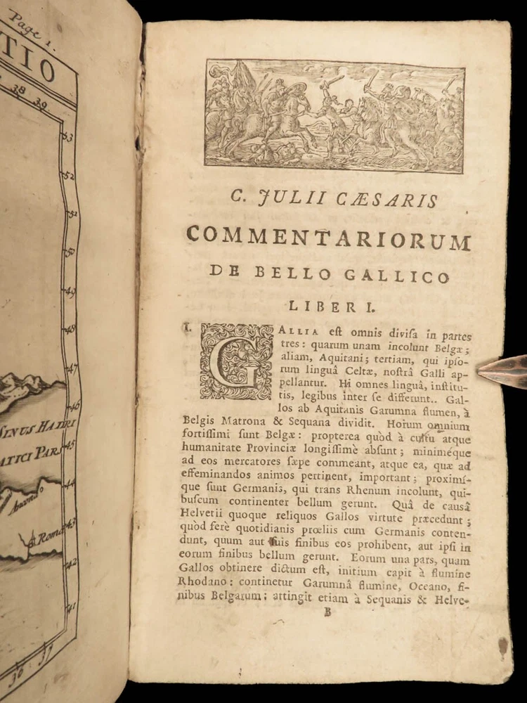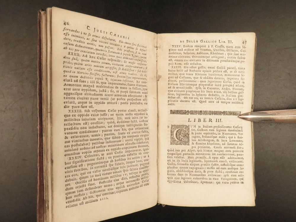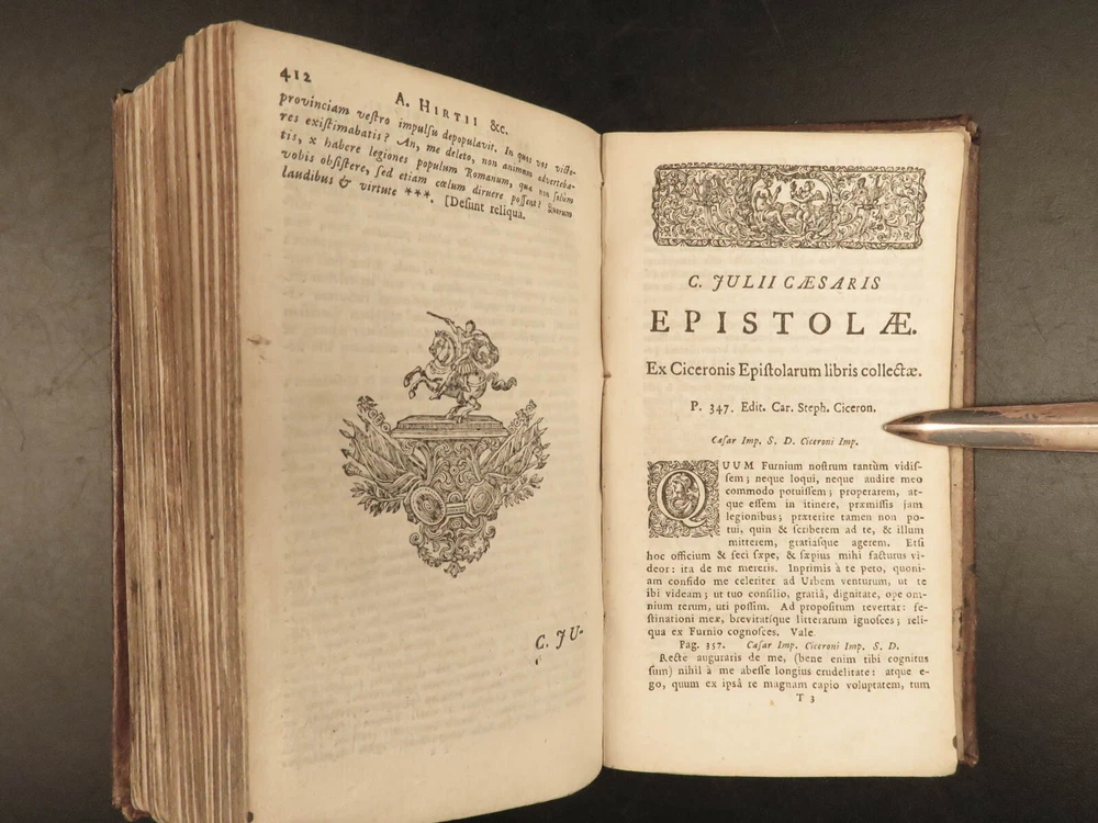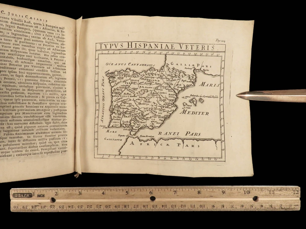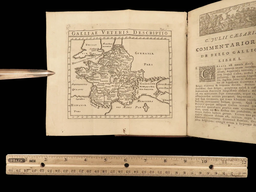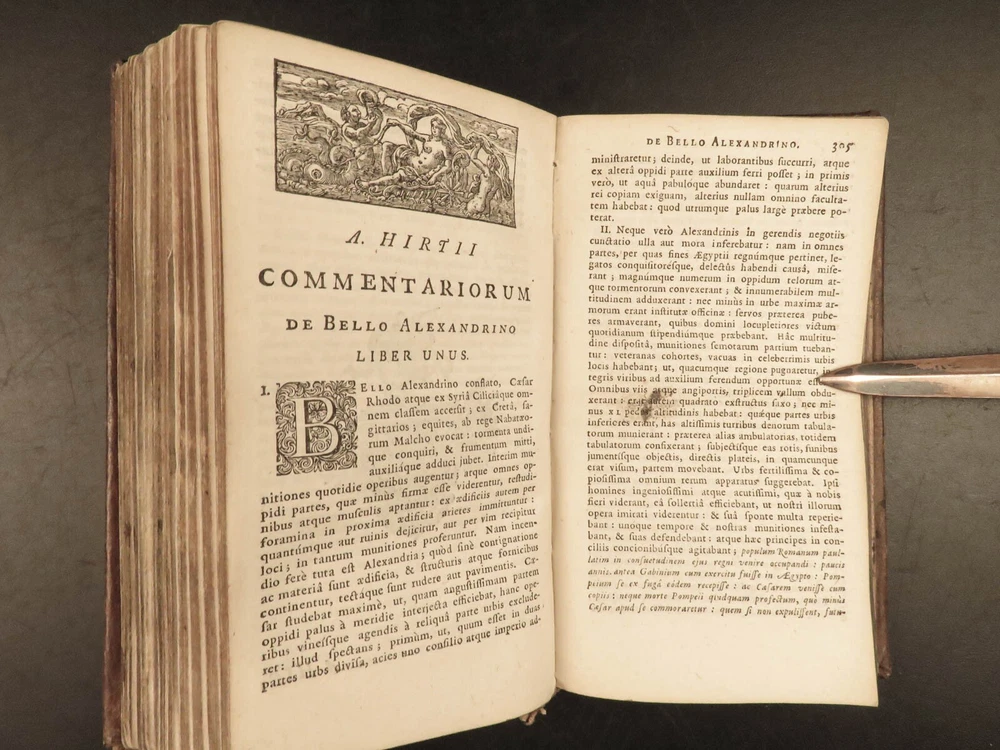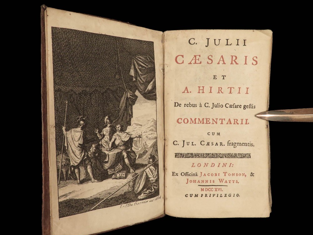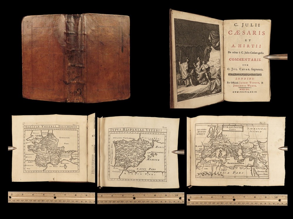 1716 Julius Caesar WAR Commentary Military MAPS Tactics Bellum Africum Hirtius “If you must break the law, do it to seize power: in all other cases observe it!” – Julius Caesar A rare collection of civil war histories and Julius Caesar war commentaries! Julius Caesar’s war commentaries are some of the most prolific military writings! While not specifically known for his writing, Julius Caesar wrote this book which would become a mainstay in the Latin literature canon. It focuses on first-hand account of Julius Caesar in the Callic wars, but it was written as though from a third-person view. This 1716 edition was collected and edited by Michael Maittaire and published in London. It should be noted that included in this edition is Aulus Hirtius' Bellum Alexandrinum and his continuation of Caesar's De bello Gallico. Item number: #23447 Price: $499 CAESAR, Julius C. Julii Cæsaris et A. Hirtii de rebus à C. Julio Cæsari gestis commentarii. Cum C. Jul. Cæsar. Fragmentis Londini: J. Tonson & J. Watts, 1716. Details : · Collation: Complete with all pages o [24], 424, [20] § Pagination errors expected; p. 169-192 bound between p. 216-217 o 3 folding maps + frontis · Provenance: Handwritten – John Collings · Language: Latin · Binding: Leather; tight and secure · Size : ~6.25in X 3.5in (15.5cm x 9cm) Our Guarantee: Very Fast. Very Safe. Free Shipping Worldwide. Customer satisfaction is our priority! Notify us with 7 days of receiving, and we will offer a full refund without reservation! 23447