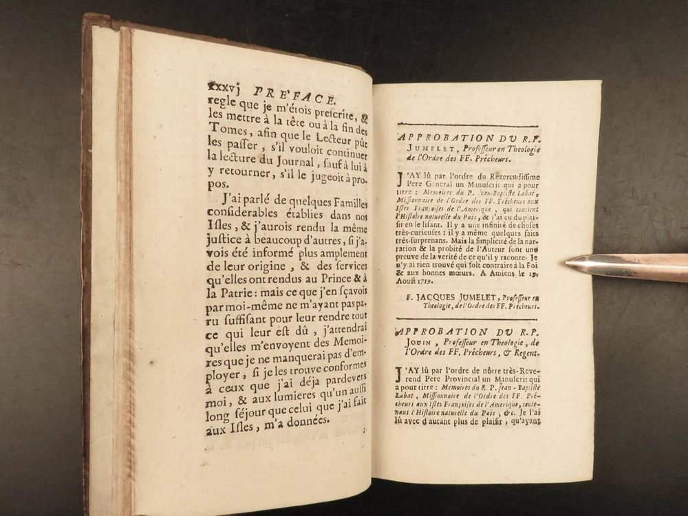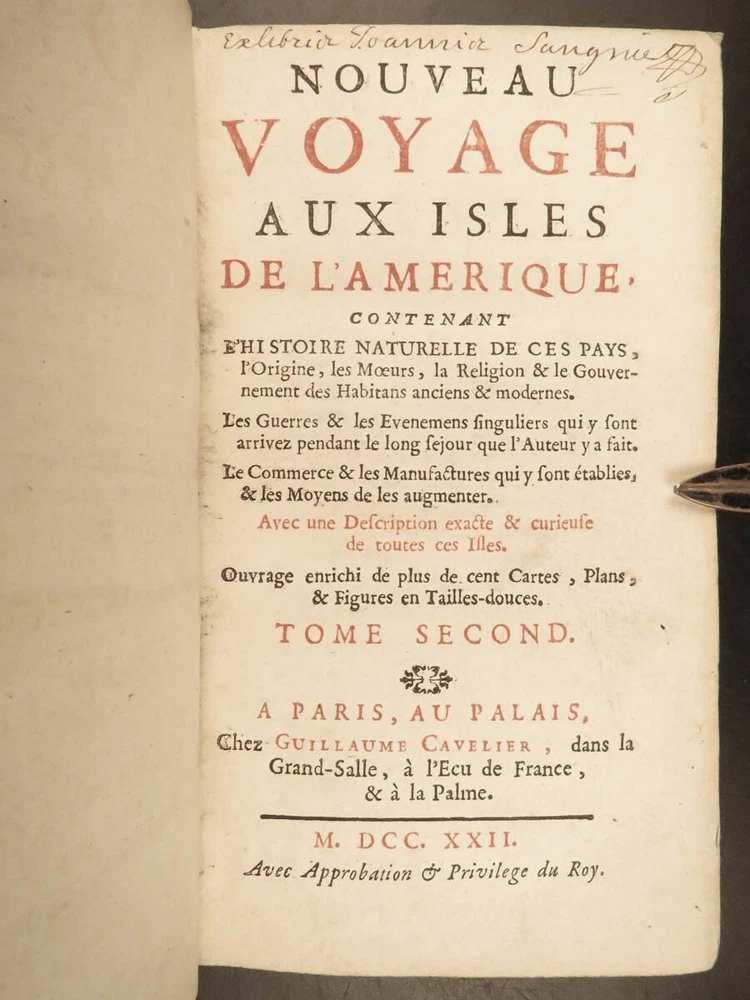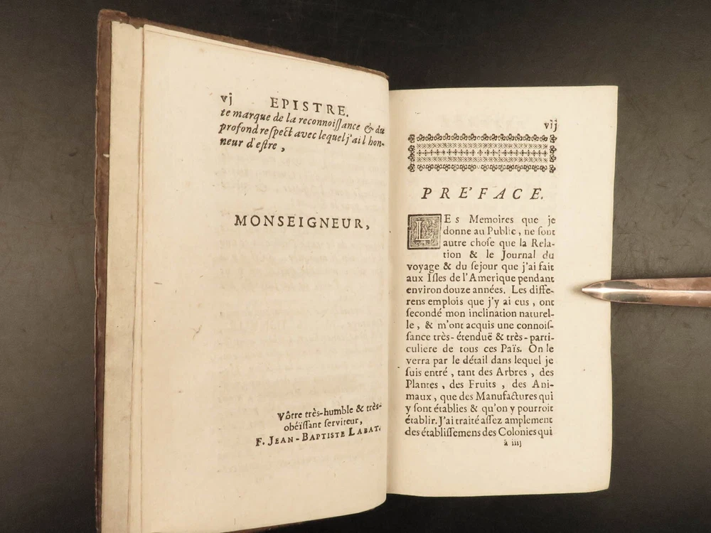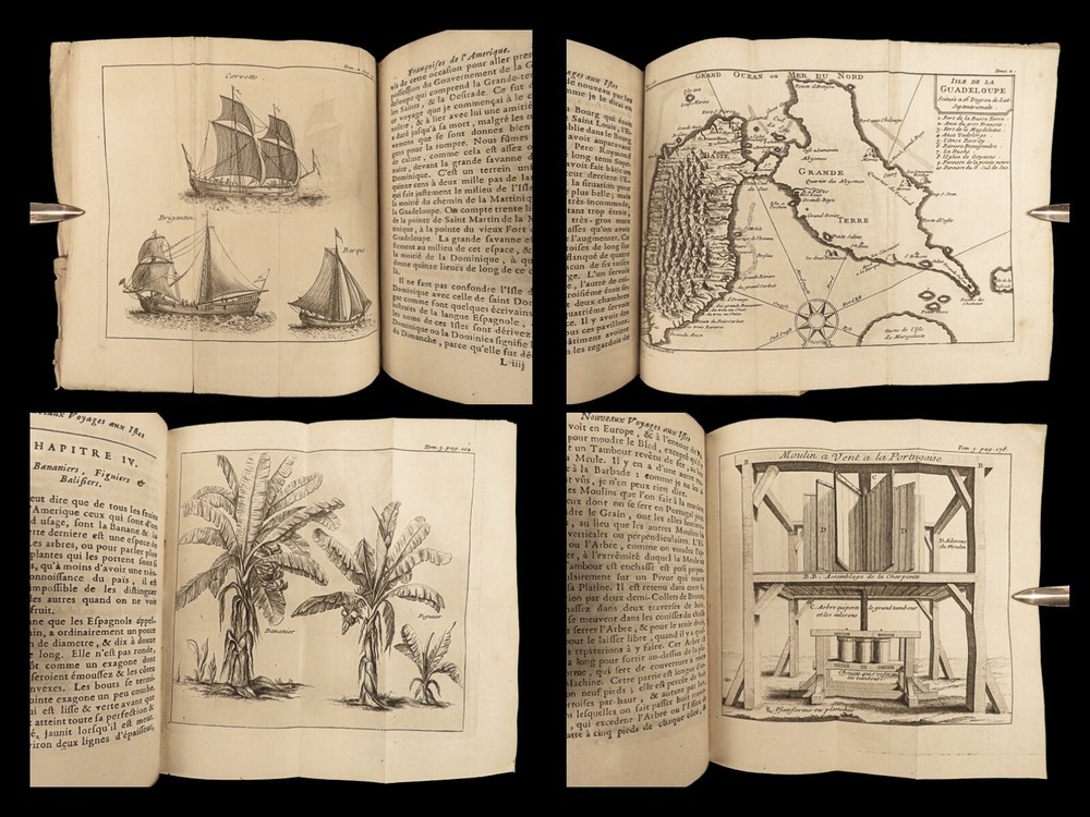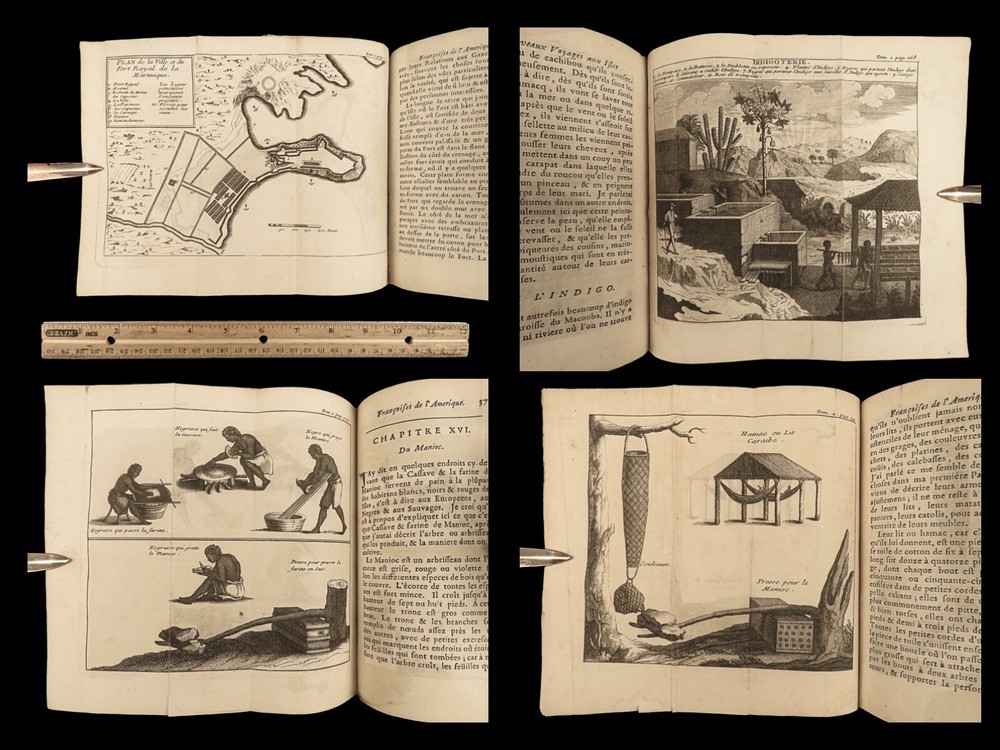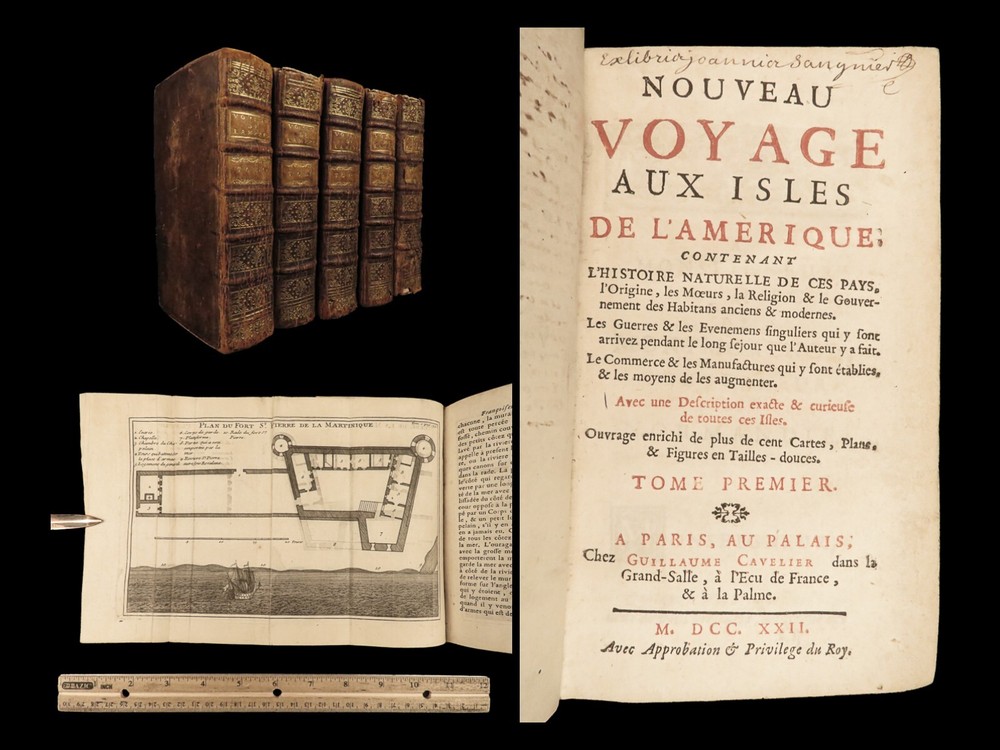 1722 Voyages in America 1 ed Labat West Indies Illustrated MAPS Caribbean Cuba 5v Jean-Baptiste Labat was a 17 th -century Frenchman known for his eclectic interests including exploration. He composed a large portfolio of works, of which, his most famous concern America and his voyages. “ Nouveau voyage aux isles de l’Amerique’ was first published in 1722 and was instantly republished in different languages across Europe. It primarily deals with the West Indies and the Caribbean islands with numerous illustrations that Labat himself illustrated. Many of these illustrations in this first edition are large folding maps; maps of the Caribbean Sea and individual islands such as Isle of Martinique. Other illustrations depict natives, architecture, tools, and scenery. Very impressive and highly desirable first edition! Item number: #23883 Price: $1500 LABAT, Jean-Baptiste Nouveau voyage aux isles de l'Amerique, contenant l'histoire naturelle de ces pays, l'origine, les mœurs, la religion & le gouvernement des habitans anciens & modernes. A Paris: au Palais, chez Theodore Le Gras, M. DCC. XXII. [1722]. First edition. Details : · Collation: Complete with all pages; 5 volumes o Vol. I – xxxvi, [10], 525, [1] o Vol. II – [6], 598 o Vol. III – iv, 549 (i.e., 547), [1] o Vol. V – vi, 524 o Vol. VI – vi, 514, [14] o 85 engravings, many folding § includes 2 folding maps · Provenance: o Armorial bookplate – Sangnier d’Abrancourt o Handwritten – Joannis Sangnier · Language: French · Binding: Leather; tight and secure · Size : ~6.5in X 4in (16.5cm x 10cm) Our Guarantee: Very Fast. Very Safe. Free Shipping Worldwide. Customer satisfaction is our priority! Notify us with 7 days of receiving, and we will offer a full refund without reservation! 23883