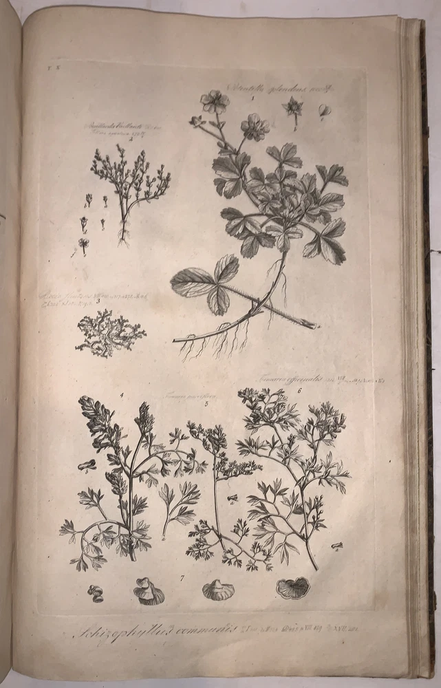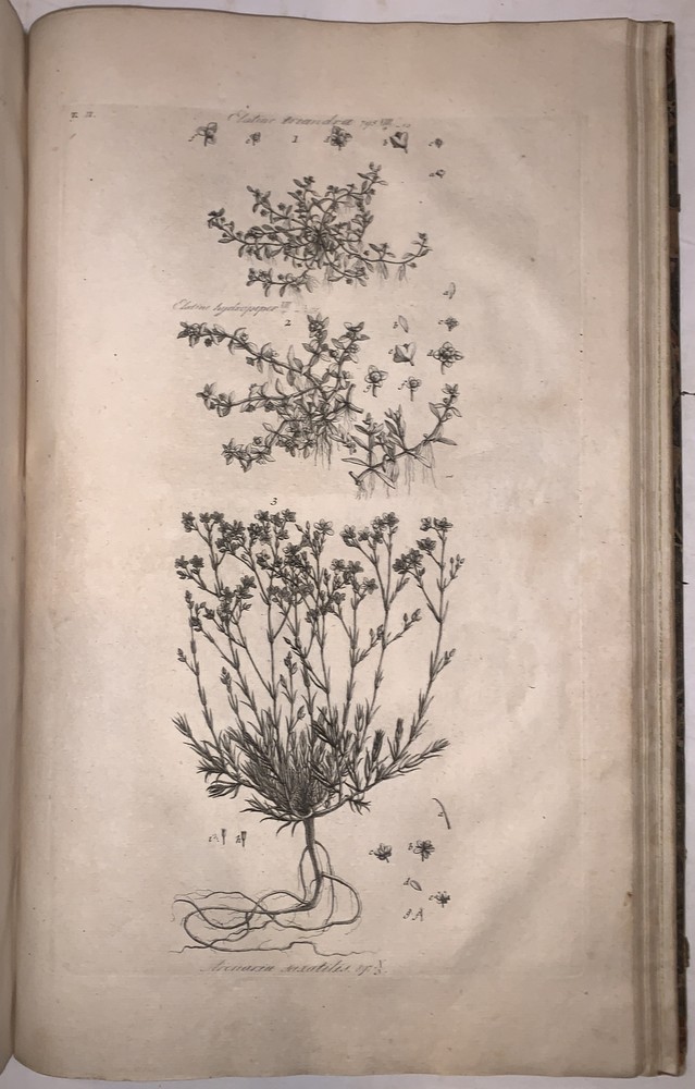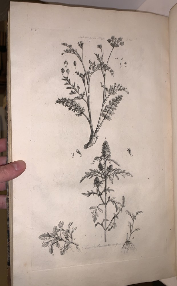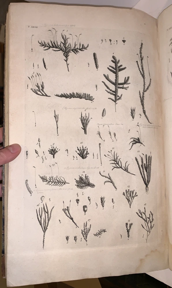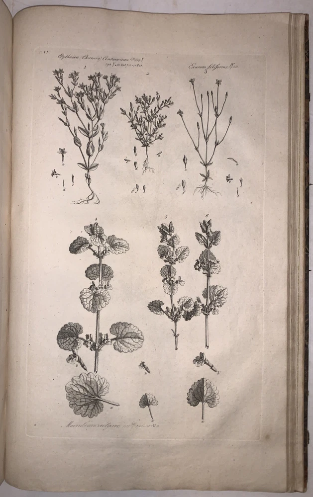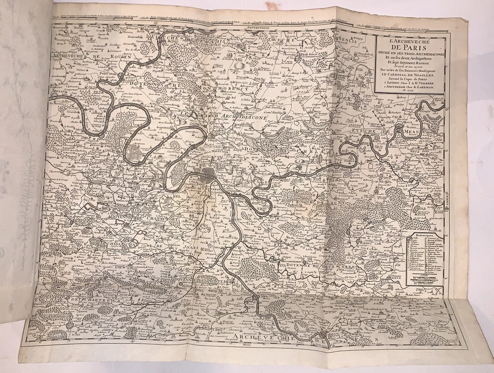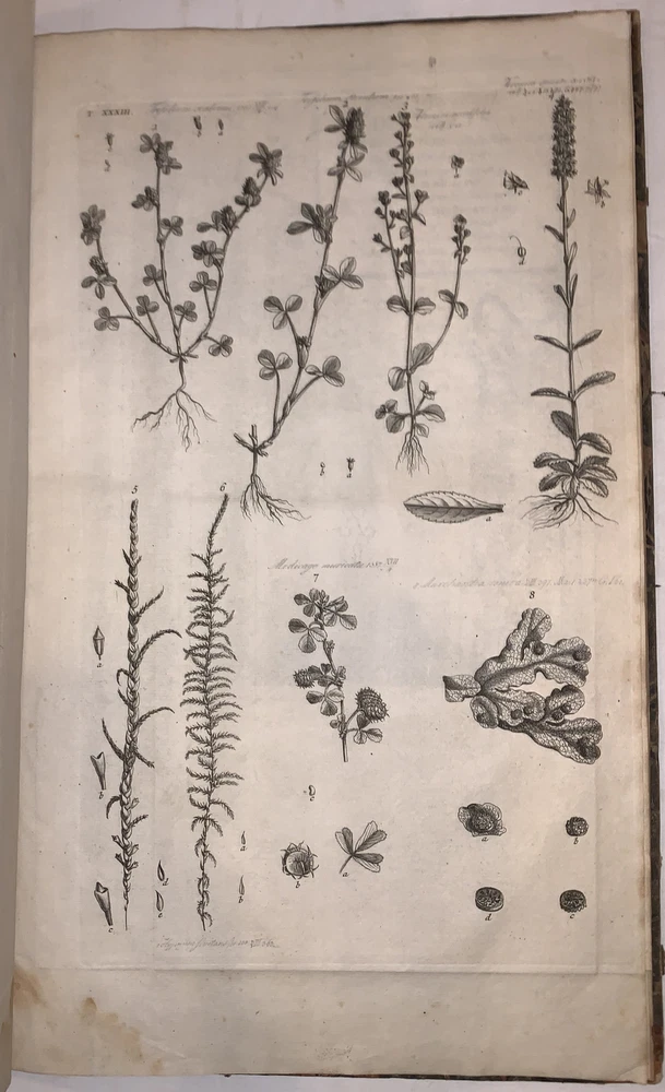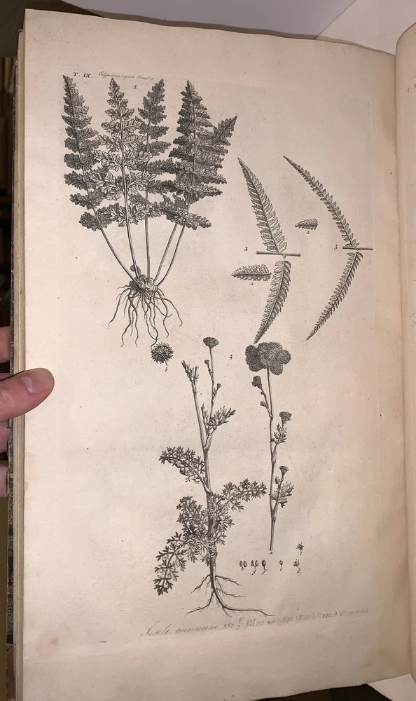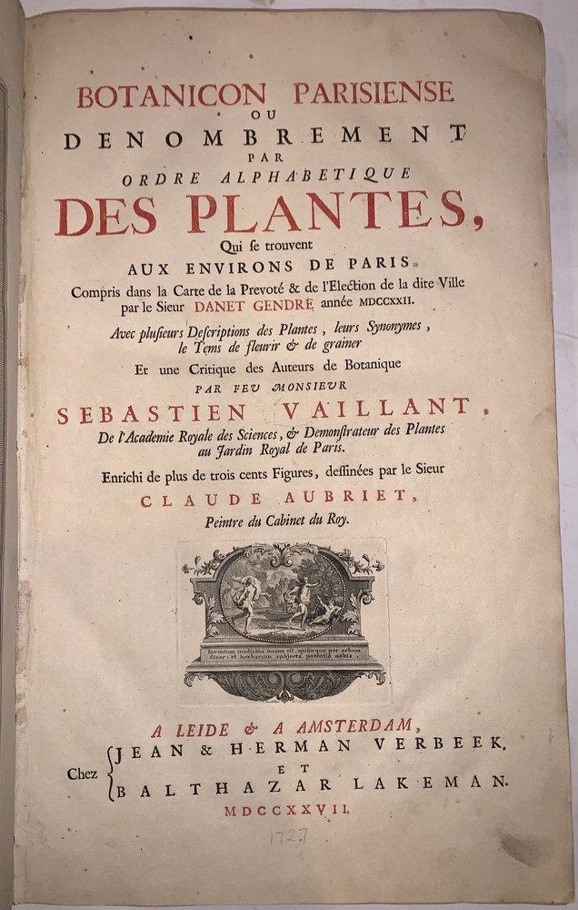 Botanicon Parisiense ou Denombrement par Ordre Alphabetique des Plantes, Qui se trouvent aux Environs de Paris. Compris dans la Carte de la Prevote & de l'Election de la dite Ville par le Sieur Danet Gendre anneee MDCCXXII. Avec plusieurs Descriptions des Plantes, leurs Synonymes, le Tems de fleurir & de Grainer Et une Critique des Auteurs de Botanique Par Fev Monsieur Sebastien Vaillant De l'Academie Royale des Sciences, & Demonstrateur des Plantes au Jardin Royal de Paris. Enrichi de plus de trois cents Figures, dessinees par le Sieur Claude Aubriet, Peintre du Cabinet du Roy. A Leide & A Amsterdam Chez Jean & Herman Verbeek, et Balthazar Lakeman 1727 Folio, [32], xii, [4], 205, [12], [36] pages plus 33 full page plates and a large fold out map. Bound in period leather over marbled boards. Text in French and Latin. Slight musty smell, some rubbing and wear to the covers, damage towards bottom of spine, some discoloration, corners, bumped, else in good + condition. If you have any questions feel free to ask and don't forget to check out my other listings.