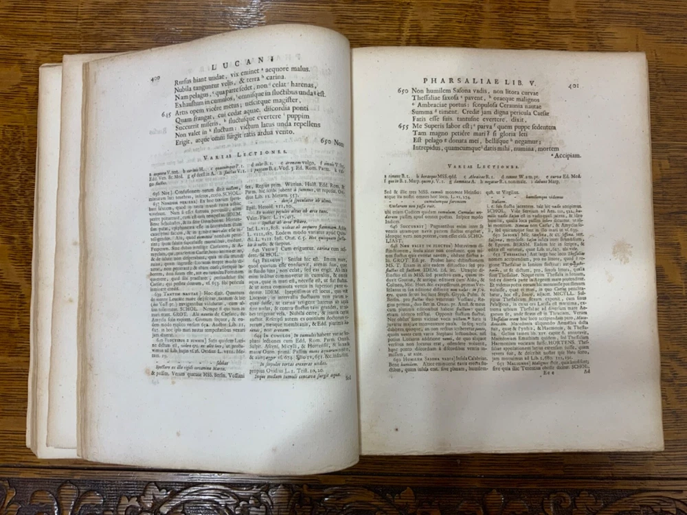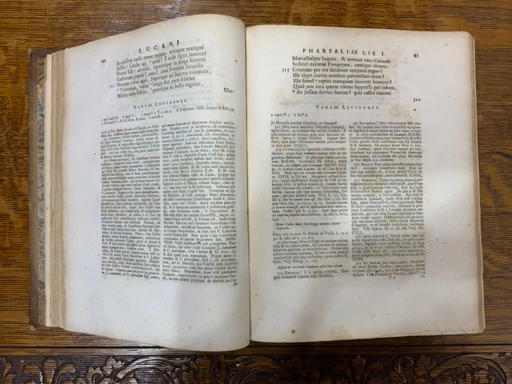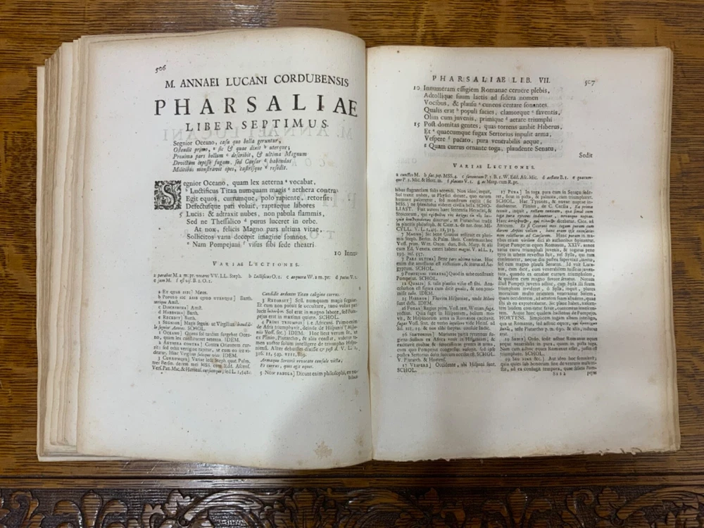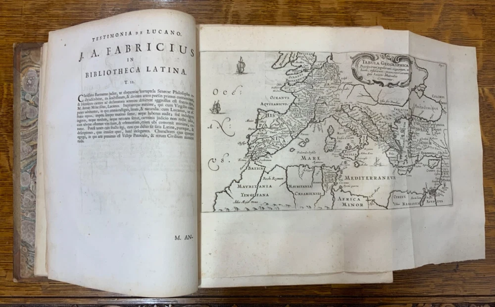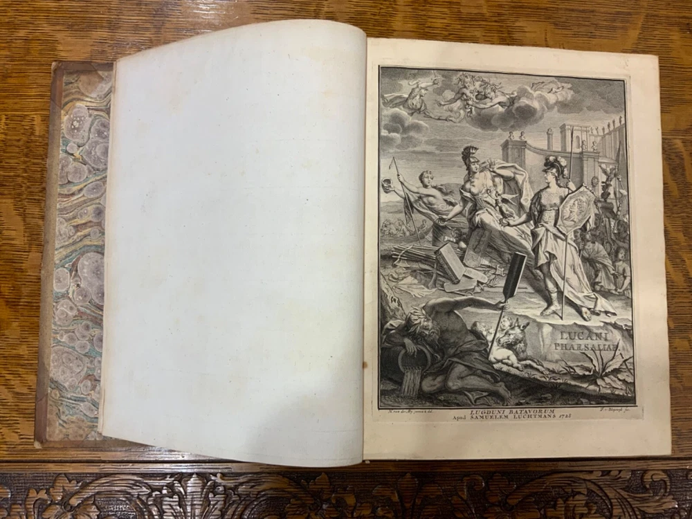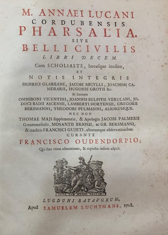M. Annaei Lucani Cordubensis Pharsalia. Sive Belli Civilis Libri Decem. Cum Scholiaste, hucusque inedito, et Notis Integris Henrico Glareani, Jacobi Micylli, Joachimi Camerarii, Hugonis Grotii, &c. Ex Excerptis Omniboni Vicentini, Joannis Sulpitii Verulani, Jodoci Badii Ascensii, Lamberti Hortensii, Gregorii Bersmanni, Theodori Pulmanni, Aliorumque. Nec Non Thomae Maji supplementis, & Apologia Jacobi Palmerii Grentemesnilii, Monsantii Briosii, ac Gr. Bersmanni, & ineditis Francisci Gujeti, aliorumque observationibus. Curante Francisco Oudendorpio, Samuelem Luchtmans, Lugduni Batavorum, 1728, 966pp, 3/4 leather, 8.5 x 11”, 8vo Poor condition/as is. Boards are completely detached from binding. Wear and soiling to boards. Tips are bumped. Spine is lacking. Marbled endpapers. Title page in red and black ink: red is still crisp. Frontispiece before title page. Toning, age-staining, foxing, and tea-staining throughout textblock. No known marginalia. Binding is cracked. Includes fold-out map. Please see photos and ask any questions prior to purchase. 2 volumes bound in 1. Marcus Annaeus Lucanus (3 November AD 39 - 30 April AD 65), better known in English as Lucan, was a Roman poet, born in Corduba, Hispania Baetica (present-day Cordoba, Spain). He is regarded as one of the outstanding figures of the Imperial Latin period, known in particular for his epic Pharsalia . His youth and speed of composition set him apart from other poets. FORN-TUB-0060-XX-2410-JC1287