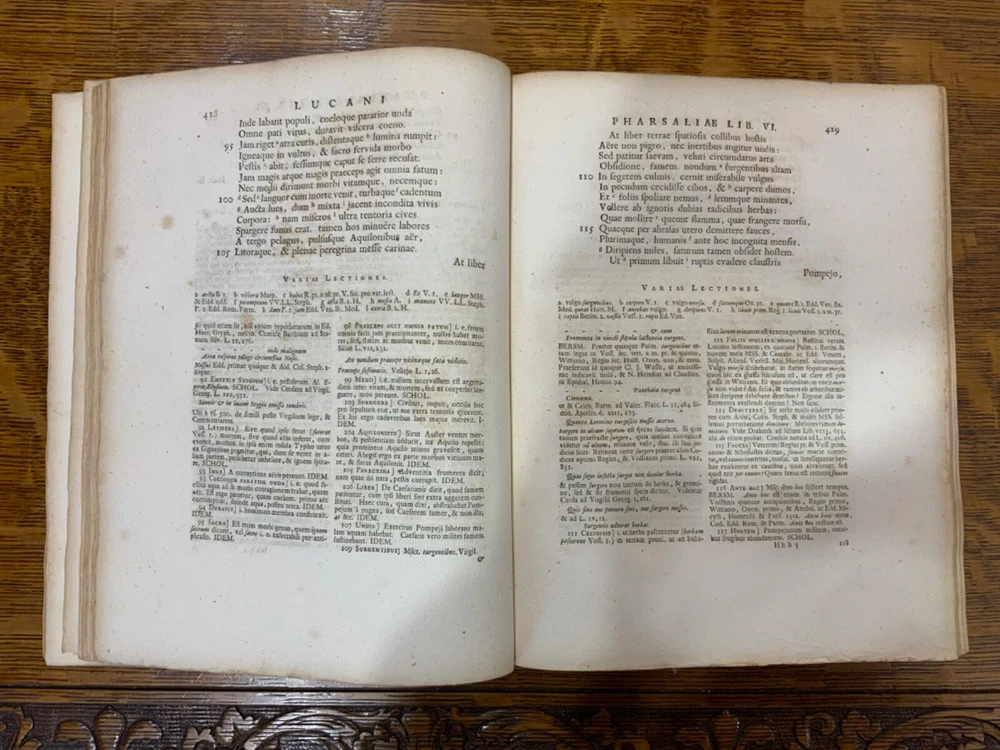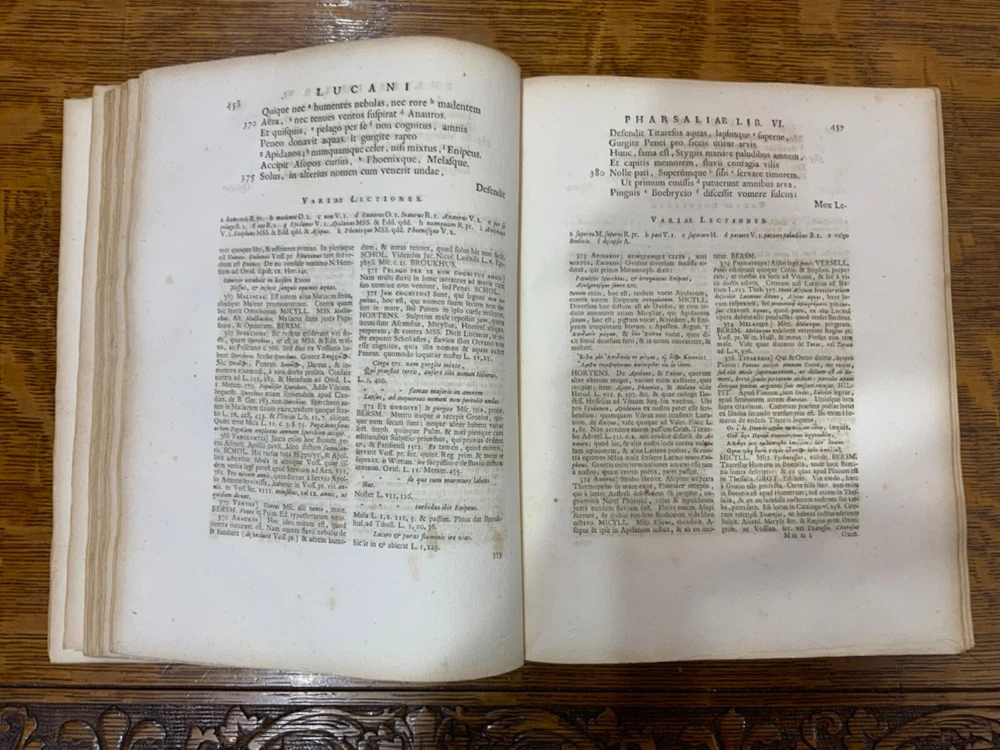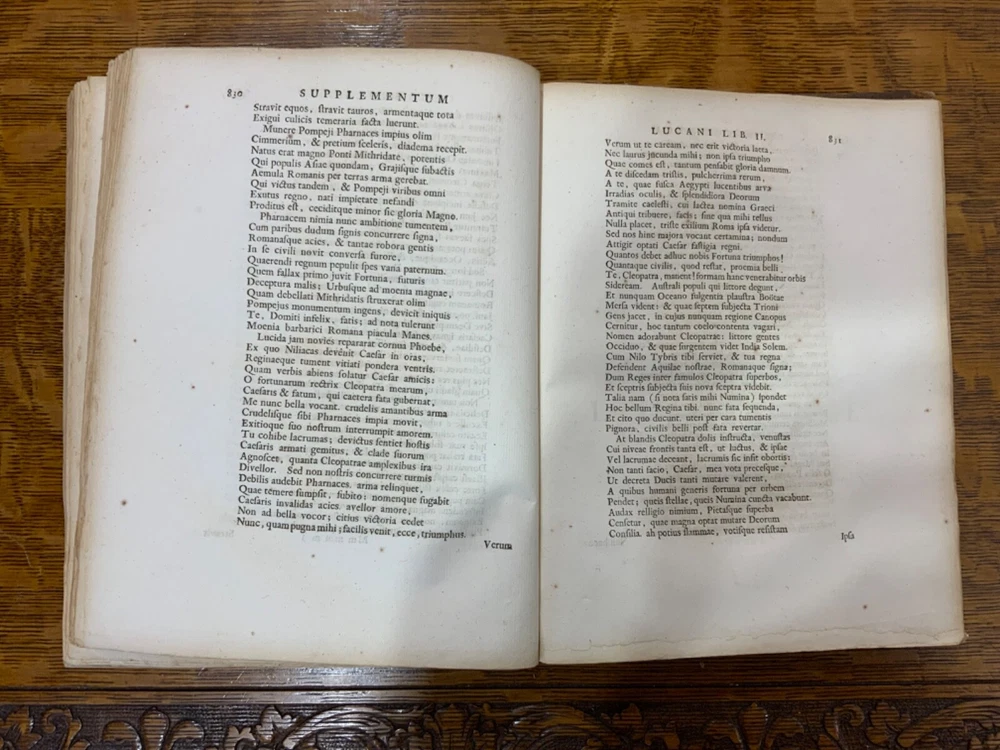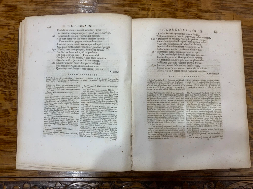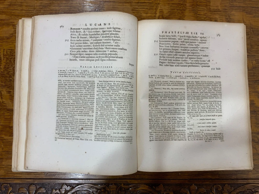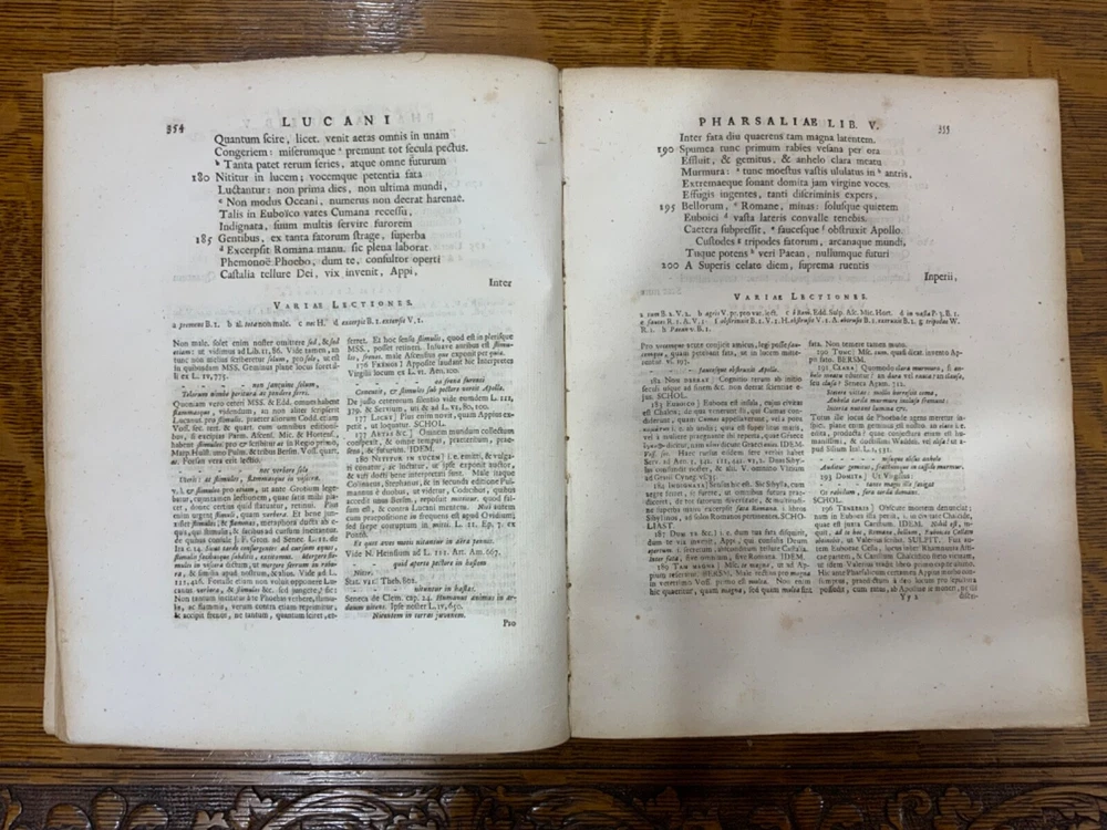 M. Annaei Lucani Cordubensis Pharsalia. Sive Belli Civilis Libri Decem. Cum Scholiaste, hucusque inedito, et Notis Integris Henrico Glareani, Jacobi Micylli, Joachimi Camerarii, Hugonis Grotii, &c. Ex Excerptis Omniboni Vicentini, Joannis Sulpitii Verulani, Jodoci Badii Ascensii, Lamberti Hortensii, Gregorii Bersmanni, Theodori Pulmanni, Aliorumque. Nec Non Thomae Maji supplementis, & Apologia Jacobi Palmerii Grentemesnilii, Monsantii Briosii, ac Gr. Bersmanni, & ineditis Francisci Gujeti, aliorumque observationibus. Curante Francisco Oudendorpio, Samuelem Luchtmans, Lugduni Batavorum, 1728, 966pp, 3/4 leather, 8.5 x 11”, 8vo Poor condition/as is. Boards are completely detached from binding. Wear and soiling to boards. Tips are bumped. Spine is lacking. Marbled endpapers. Title page in red and black ink: red is still crisp. Frontispiece before title page. Toning, age-staining, foxing, and tea-staining throughout textblock. No known marginalia. Binding is cracked. Includes fold-out map. Please see photos and ask any questions prior to purchase. 2 volumes bound in 1. Marcus Annaeus Lucanus (3 November AD 39 - 30 April AD 65), better known in English as Lucan, was a Roman poet, born in Corduba, Hispania Baetica (present-day Cordoba, Spain). He is regarded as one of the outstanding figures of the Imperial Latin period, known in particular for his epic Pharsalia . His youth and speed of composition set him apart from other poets. FORN-TUB-0060-XX-2410-JC1287
