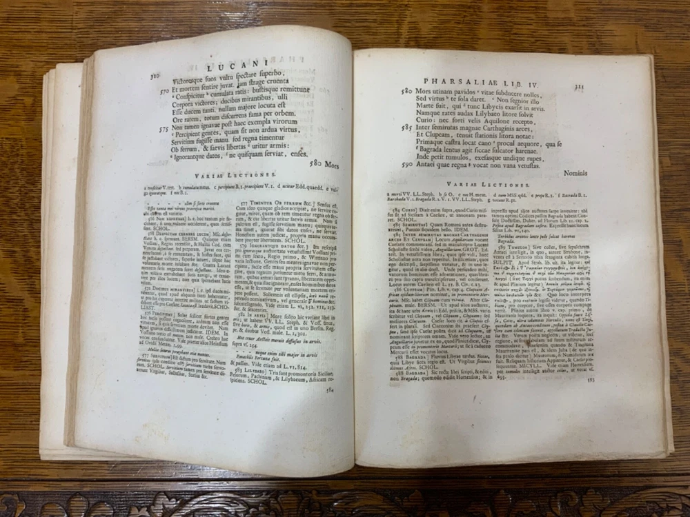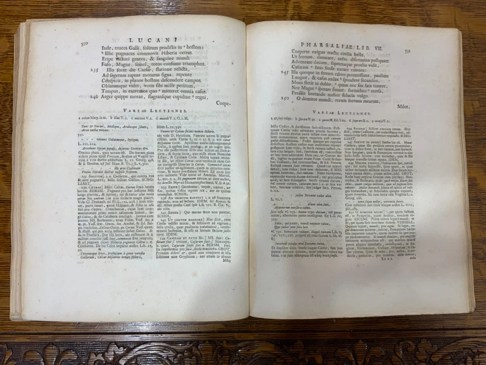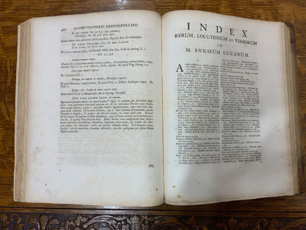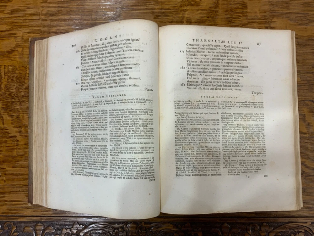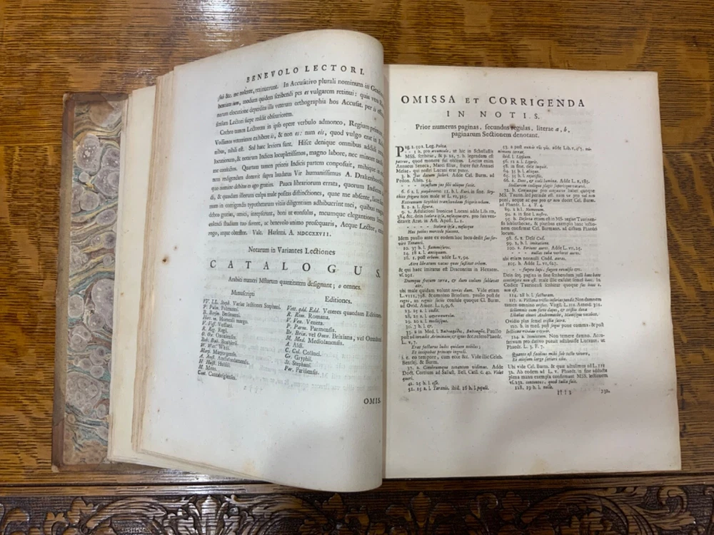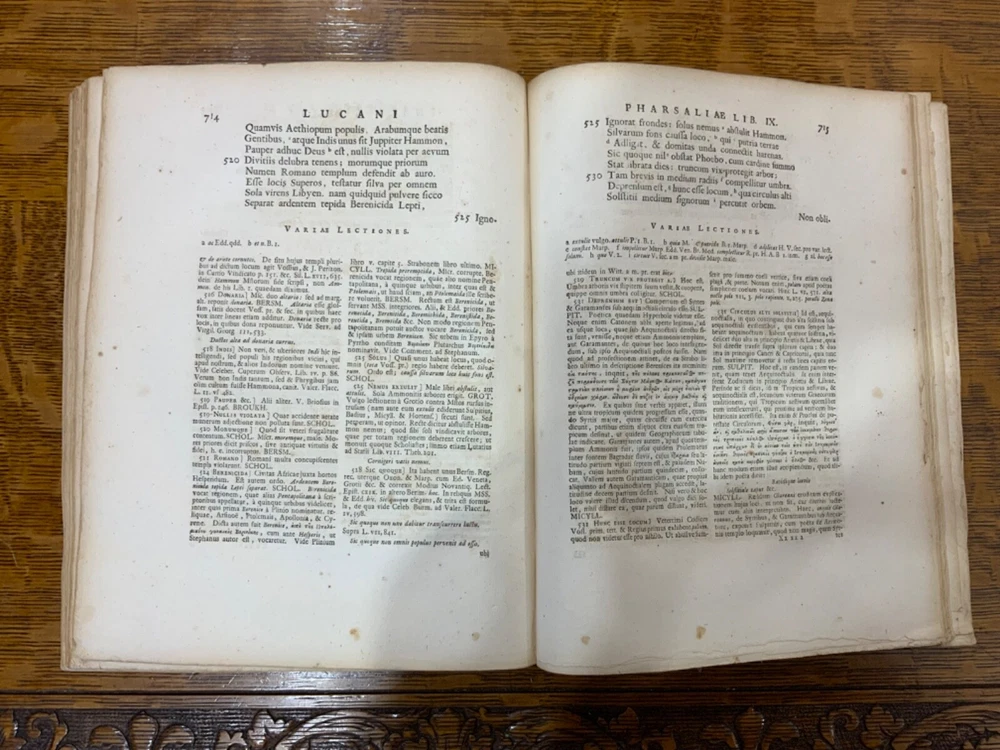 M. Annaei Lucani Cordubensis Pharsalia. Sive Belli Civilis Libri Decem. Cum Scholiaste, hucusque inedito, et Notis Integris Henrico Glareani, Jacobi Micylli, Joachimi Camerarii, Hugonis Grotii, &c. Ex Excerptis Omniboni Vicentini, Joannis Sulpitii Verulani, Jodoci Badii Ascensii, Lamberti Hortensii, Gregorii Bersmanni, Theodori Pulmanni, Aliorumque. Nec Non Thomae Maji supplementis, & Apologia Jacobi Palmerii Grentemesnilii, Monsantii Briosii, ac Gr. Bersmanni, & ineditis Francisci Gujeti, aliorumque observationibus. Curante Francisco Oudendorpio, Samuelem Luchtmans, Lugduni Batavorum, 1728, 966pp, 3/4 leather, 8.5 x 11”, 8vo Poor condition/as is. Boards are completely detached from binding. Wear and soiling to boards. Tips are bumped. Spine is lacking. Marbled endpapers. Title page in red and black ink: red is still crisp. Frontispiece before title page. Toning, age-staining, foxing, and tea-staining throughout textblock. No known marginalia. Binding is cracked. Includes fold-out map. Please see photos and ask any questions prior to purchase. 2 volumes bound in 1. Marcus Annaeus Lucanus (3 November AD 39 - 30 April AD 65), better known in English as Lucan, was a Roman poet, born in Corduba, Hispania Baetica (present-day Cordoba, Spain). He is regarded as one of the outstanding figures of the Imperial Latin period, known in particular for his epic Pharsalia . His youth and speed of composition set him apart from other poets. FORN-TUB-0060-XX-2410-JC1287