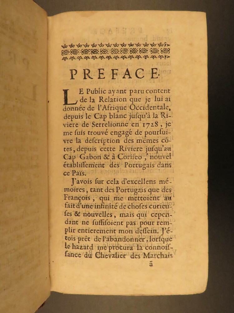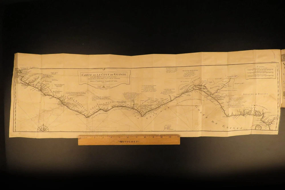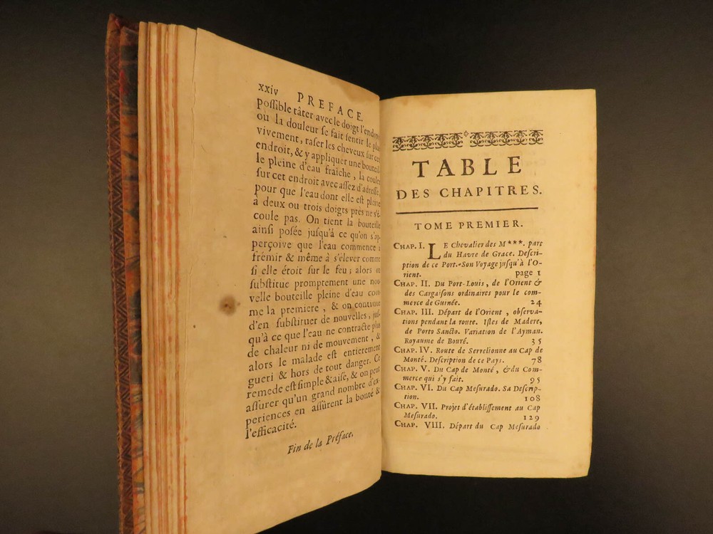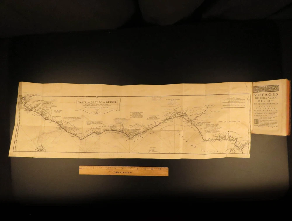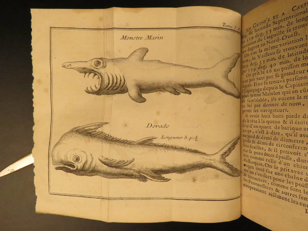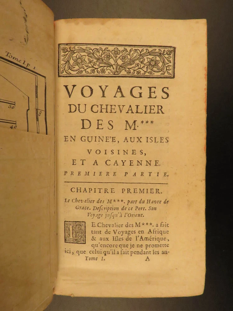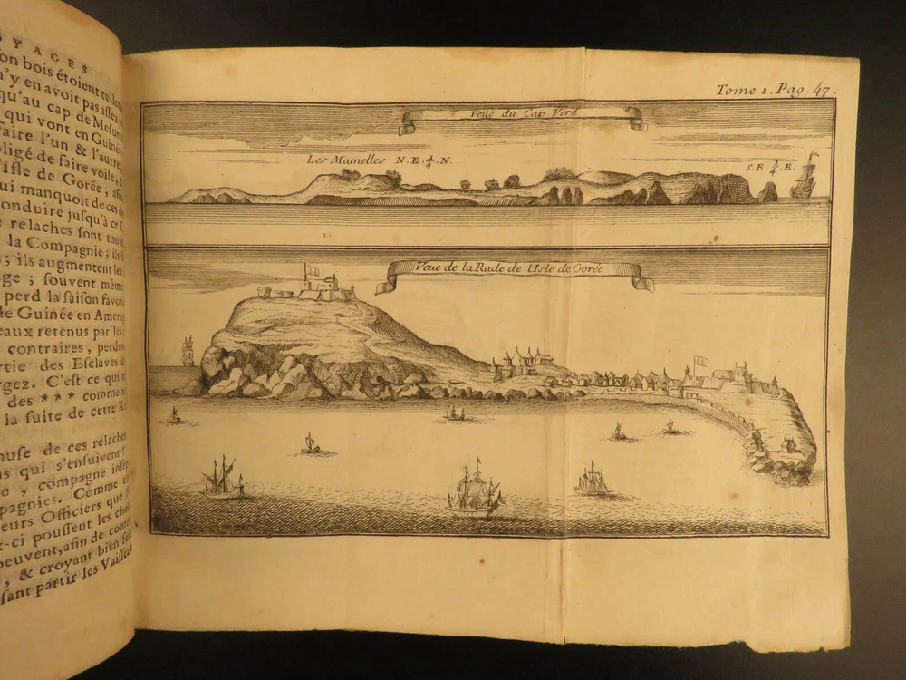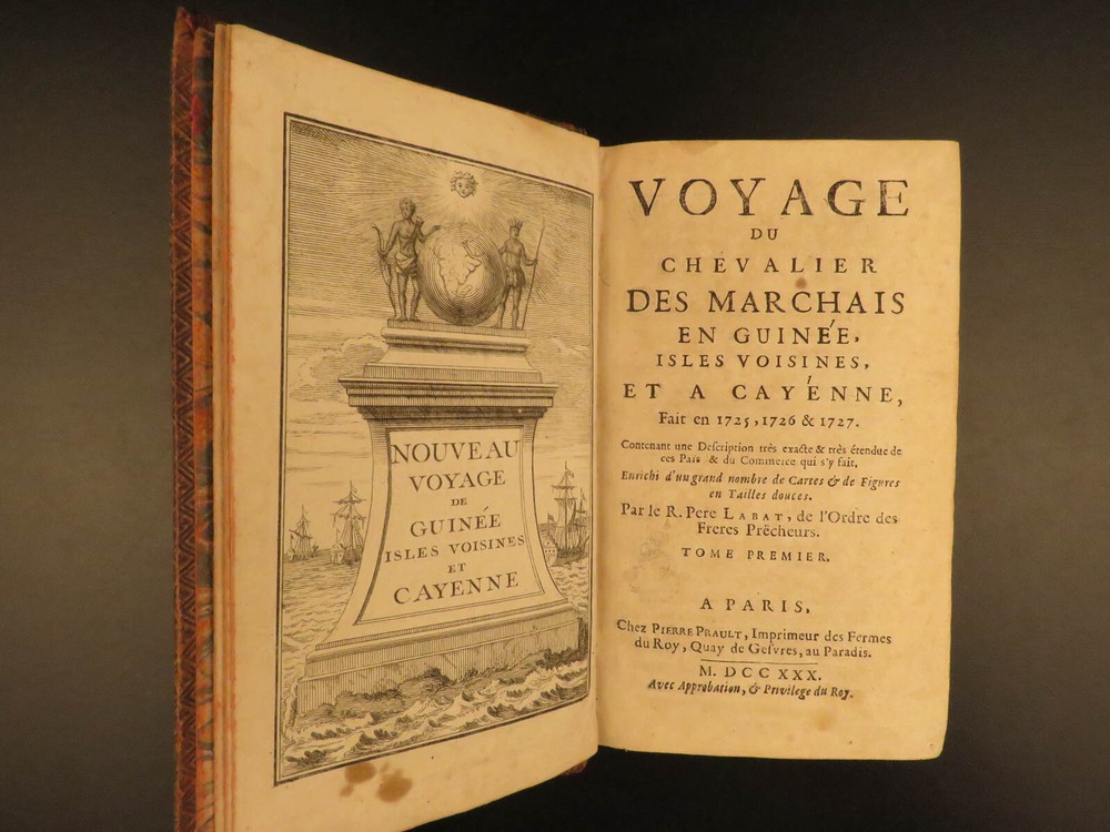 1730 1 ed Slavery Voyages of Marchais AFRICA Whydah Maps Labat Sea Monsters 2v Jean-Baptiste Labat was a 17 th -century Frenchman known for his eclectic interests including exploration. His most famous works concern voyages in America, the West Indies, and the Caribbean. In 1730, Labat published an account of the voyages of Reynaud Desmarchais, a captain of slave ship that sailed exclusively between the African Gold Coast and the West Indies. ‘ Voyage du Chevalier des Marchais en Guinée’ describes many of the procedures and regulations that were involved in slave trade as well as the economic and commercial influence of slavery . In addition to discussions on slaves, Labat includes information on fish, animals, geography, and …sea monsters! (i.e. sharks). These volumes from the 1730 first edition include 27 exquisite illustrations including a view of the coronation procession of the King of Whydah. Item number: #10406 Price: $950 LABAT, Jean-Baptiste Voyage du chevalier des Marchais en Guinée, isles voisines, et a Cayénne : fait en 1725, 1726 et 1727 : Contenant une description très exacte & très étendue de ces païs, & du commerce qui s'y fait. Enrichi d'un grand nombre de cartes & de figures en taille Paris : chez Pierre Prault, 1730. 1st edition Details : · Collation: Complete; 2 volumes (of 4) o Vol. I – xxiv, [2], 381, [1] § 15 engraved plates o Vol. II – [4], 364 § 12 engraved plates · References: Sabin 38414; · Language: French · Binding: Leather; tight & secure · Size : ~6.75in X 4in (17cm x 10cm) Our Guarantee: Very Fast. Very Safe. Free Shipping Worldwide. Customer satisfaction is our priority! Notify us with 7 days of receiving, and we will offer a full refund without reservation! 10406