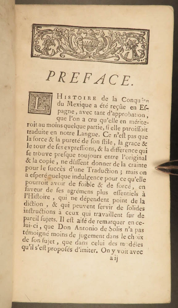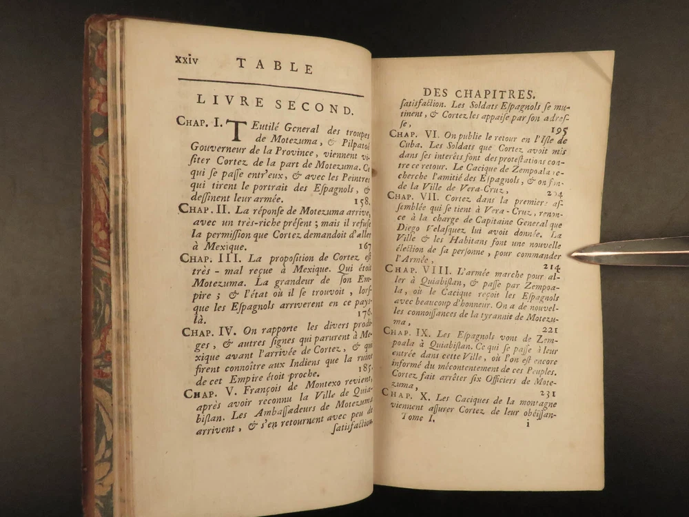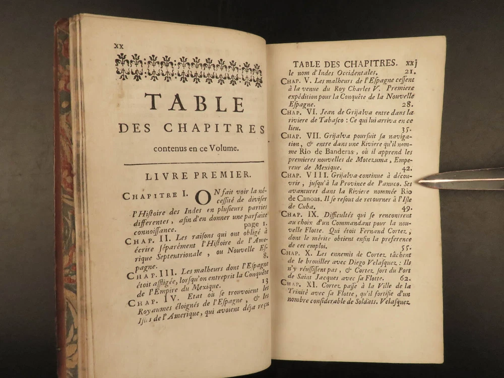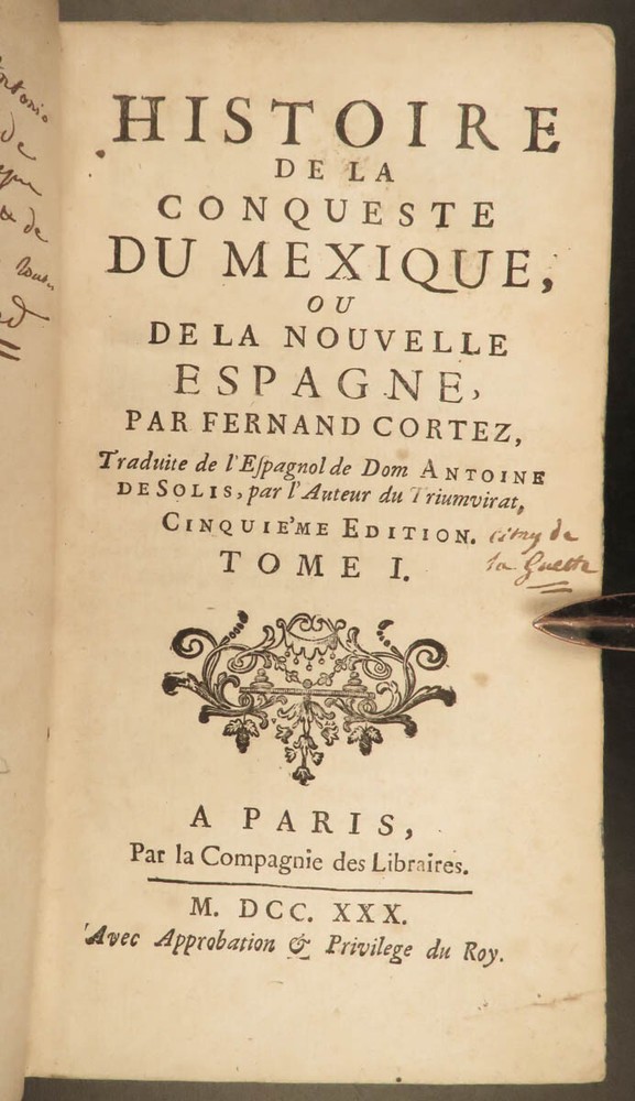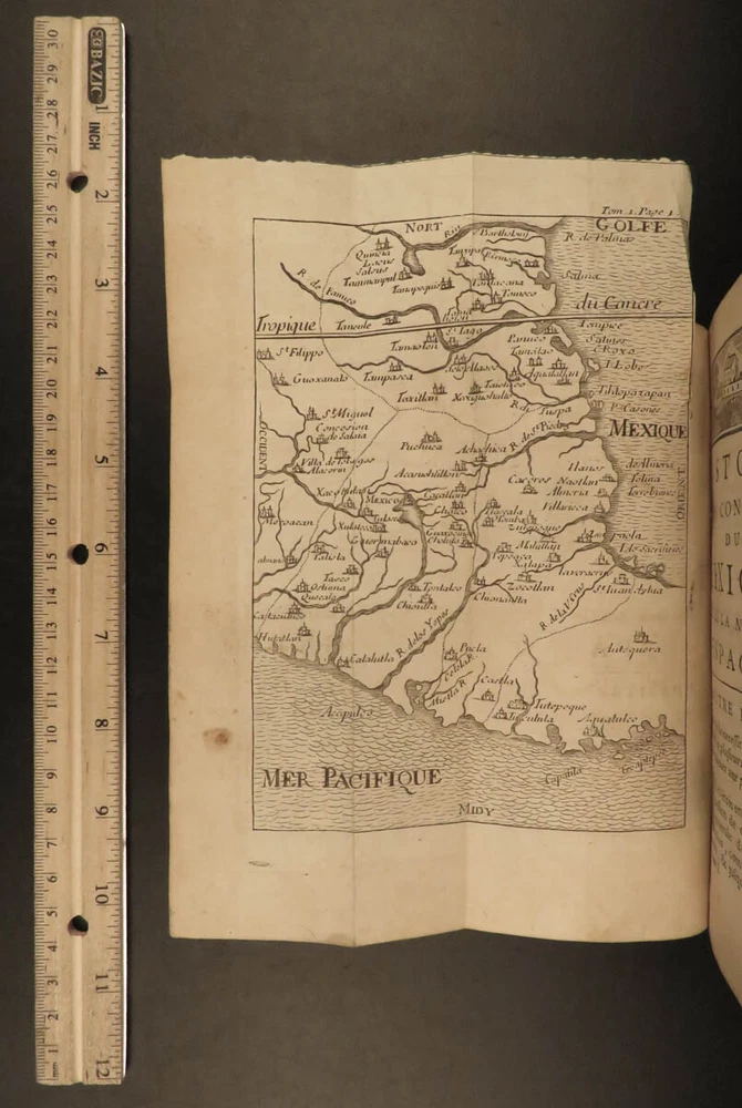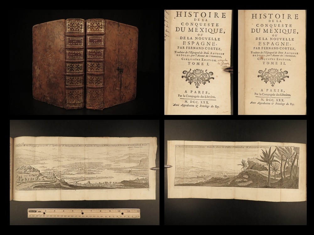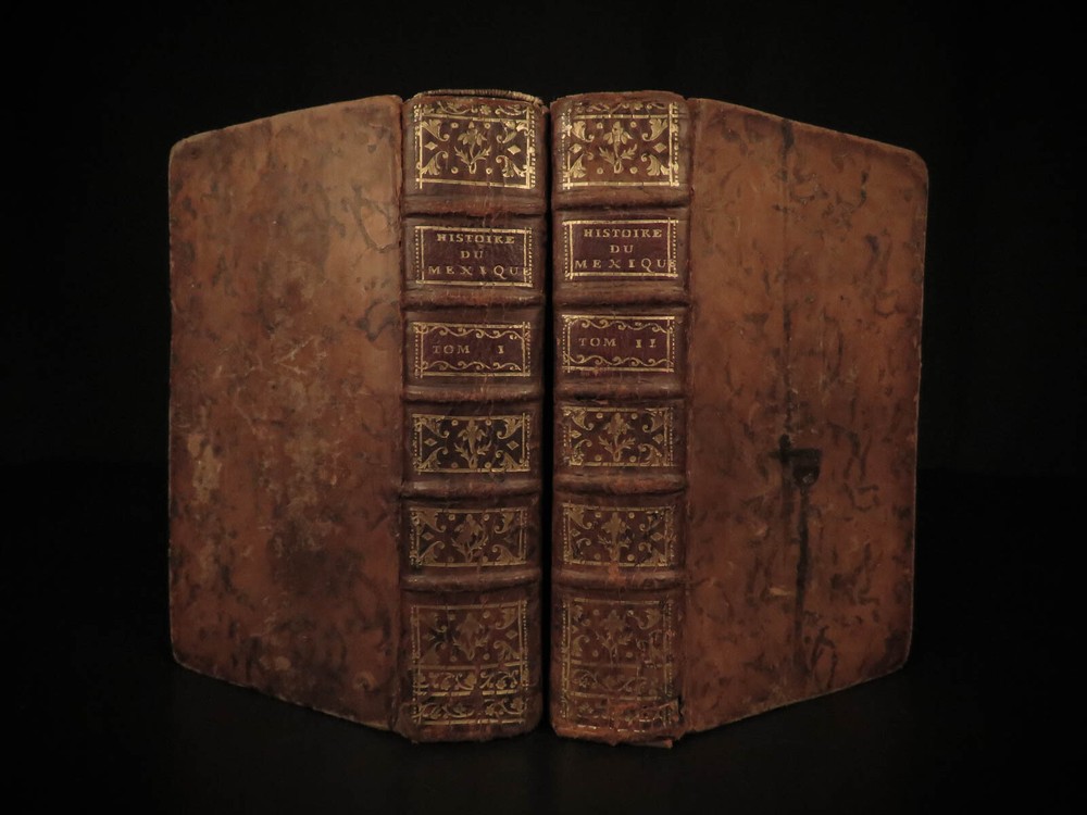 1730 Spanish Conquest of Mexico Solis Aztec Hernan Cortes Montezuma Cortez MAPS “The fleet was destroyed at the instance of the soldiers, that Cortes alone might not be obliged to make good the payment of the ships, but the troops.” – Solis, History (Townshend translation, 1770) A famous book on Spanish conquests – one of the most important European sources on Latin American history. Antonio de Solis’s “ Historia de la Conquista de Mexico ” was extremely popular in both Europe and in the Americas and was known by important colonial figures in Latin and European colonies. It deals, mainly, with Hernando Cortez and his command of invading forces of Moctezuma II and the Aztecs. Specific interactions include: · Cortez sailing from Trinidad to Havana, difficulties in voyages · Cortez at Cozumel, organizing his troops · Aztec opposition at the River of Grijalva · Spanish attempts to make peace with Cazique of Tobasco · Accounts of Moctezuma’s army and troop sizes · The Zempoalans, people of Zimpazingo · Conversion of Aztec temples into Catholic churches · Account of Hernando Cortez executing resolution to sink his ships · Manner of Aztec government · Prisoners and tortures · Mexican culture – festivals, marriages, rites and customs · Death of Cortez This 1730 French edition of Solis’s famous work is beautifully illustrated with portraits and scenes of battle! Item number: #19748 Price: $950 SOLÍS, Antonio de, y Ribadeneyra Histoire de la conqueste du Mexique : ou de la nouvelle Espagne, par Fernand Cortez, traduite de l'Espagnol de Dom Antoine de Solis, par l'auteur du Triumvirat. Paris : Par la Compagnie des Libraires, 1730. Details : · Collation: Complete with all pages; 2 volumes o Vol. I – xxiv, [8], 606, [26] § 11 plates o Vol. II – [12], 560, [22] § 3 plates · References: Medina, Biblioteca 3007; Brown, Bibliotheca Americana 1300 · Provenance: Handwritten – J. Aicard · Language: French · Binding: Leather; tight and secure · Size: ~6.75in X 4in (17.5cm x 10cm) Our Guarantee: Very Fast. Very Safe. Free Shipping Worldwide. Customer satisfaction is our priority! Notify us with 7 days of receiving, and we will offer a full refund without reservation! 19748