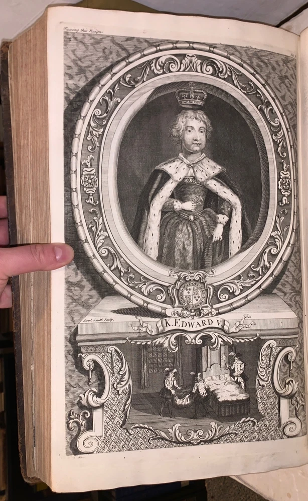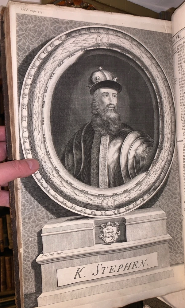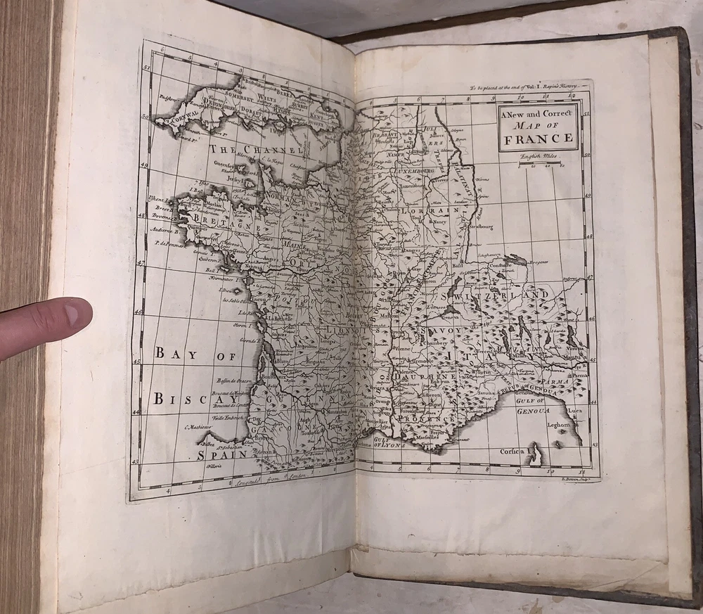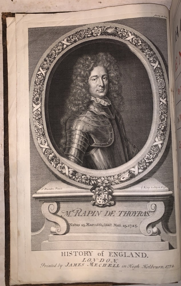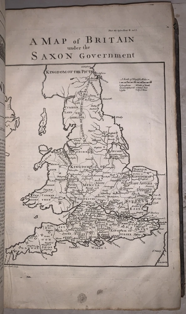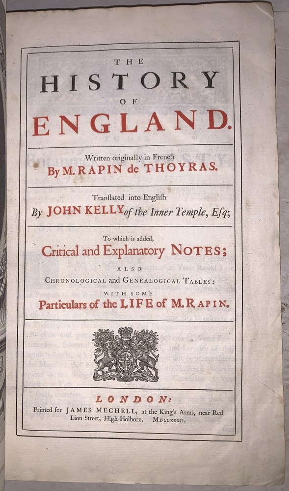 The History of England Written originally in French by M. Rapin de Thoyras Translated into English by John Kelly of the Inner Temple, Esq To which is added, critical and explanatory notes; Also Chronological and Genealogical tables: with Some Particulars of the Life of M. Rapin London: James Mechell 1732 First Edition Volume one of three only. The other two volumes were published in 1733 & 1737. Folio, ii, viii, xiv, 822, [1] pages, bound in period full leather. with raised bands to spine. Illustrated throughout with black and white engravings including fold out and double page map. Some rubbing and wear, scuffs, hinges starting to crack, some foxing and discoloration, previous owner's inscription, slightly musty, one plate a little loose, corners bumped, else in good + condition. "The History of England" by Paul de Rapin de Thoyras is a comprehensive chronicle of England's historical events, spanning from its earliest origins through to more contemporary periods of the author's time. First published in the early 18th century, Rapin de Thoyras' work stands out for its meticulous research and detailed narrative, providing a thorough account of England's political, social, and military history. The author, a French historian, brings a unique perspective to English history, blending an outsider's objectivity with rigorous scholarly methods. The multi-volume series delves into the complexities of monarchical reigns, significant battles, religious upheavals, and the evolution of the English legal and governmental systems. Rapin de Thoyras' "The History of England" has been highly regarded for its clarity, accuracy, and insightful analysis, making it a significant contribution to historical literature on England. If you have any questions, feel free to ask, and don't forget to check out my other listings.