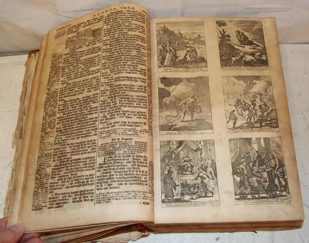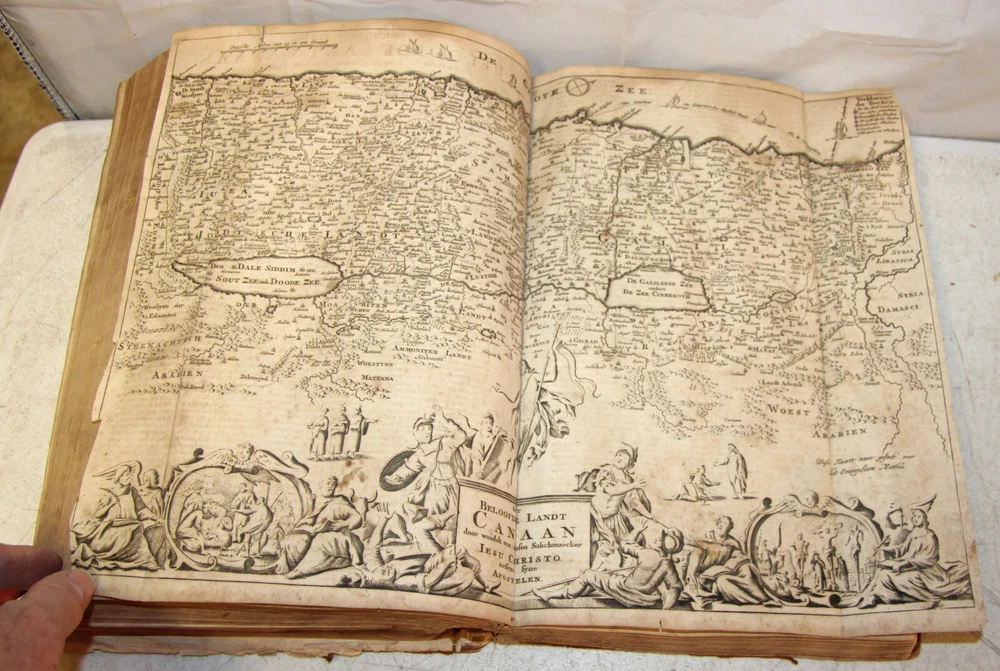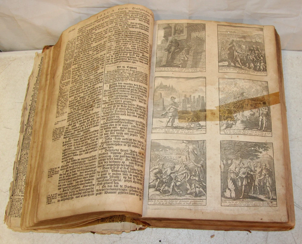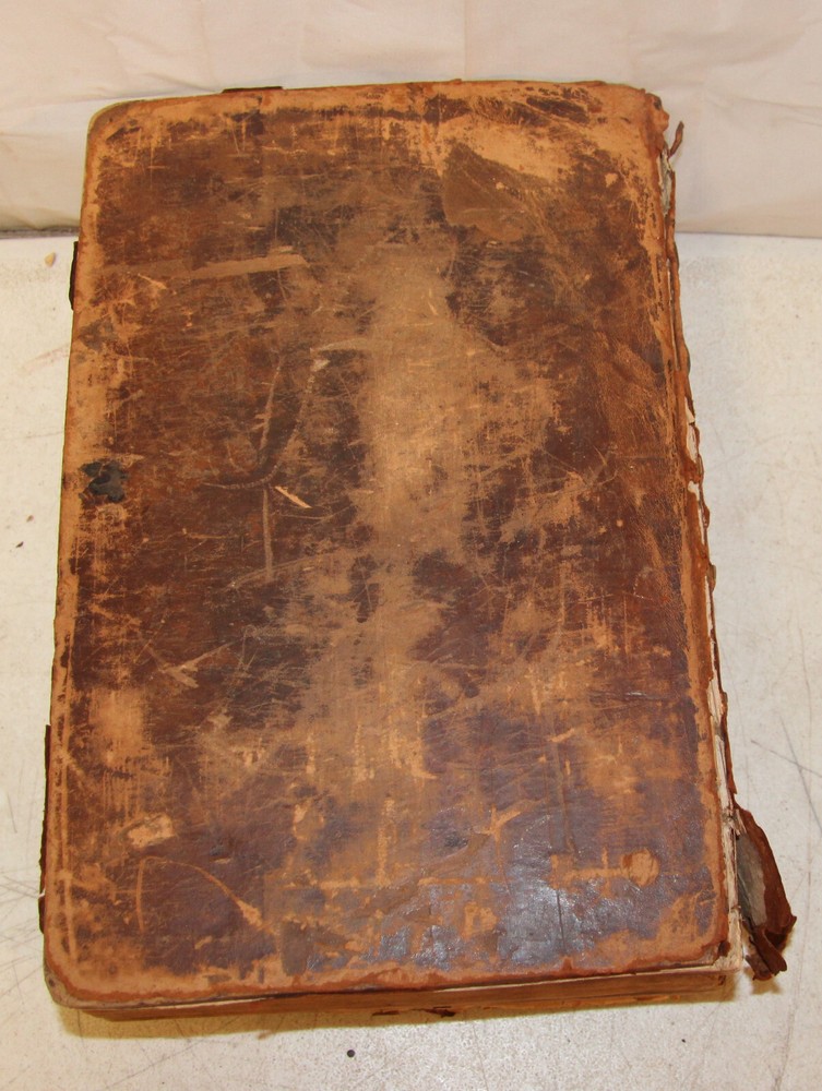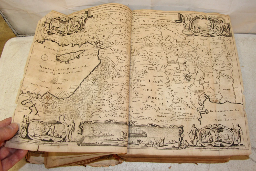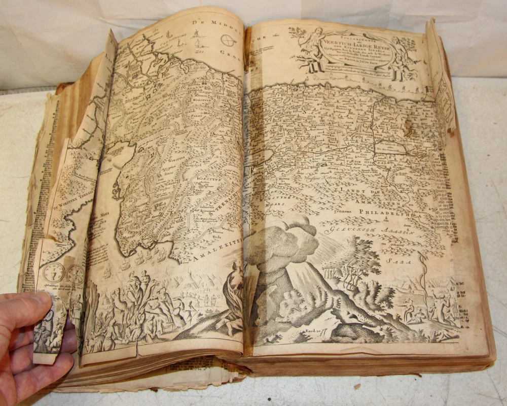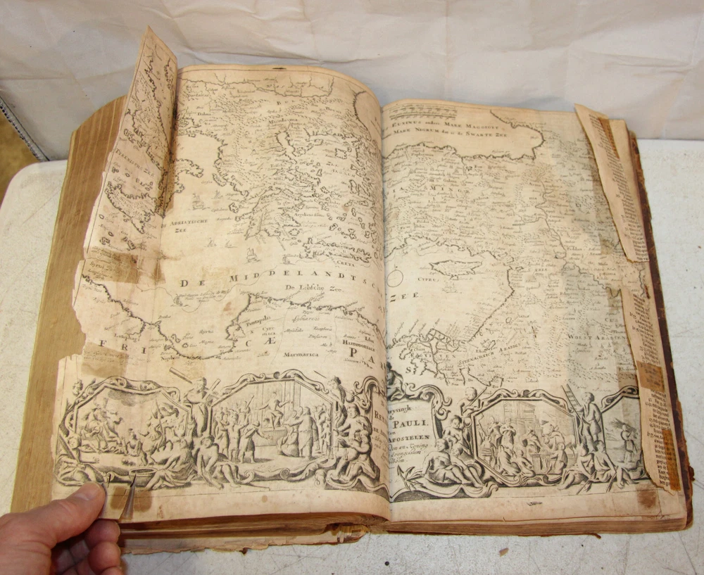 1736 Dutch Holy Bible. 13" tall X 8 3/4" wide and 3 7/8" thick. Both covers detached, leather peeling from spine and covers. First 10 pages (including blank pages) detached with damage to margins. Main title page missing, New Testament and Apocrypha title pages dated 1736. Numerous previous tape repairs to pages. Some fold-out maps have tape repairs that hinder opening them, tlc necessary. Some maps missing content from torn leaves. Everything is legible. Many amazing illustrations. The final pages of the Apocrypha missing. Restore or adore as is. Free shipping to lower 48 states via insured Media Mail.