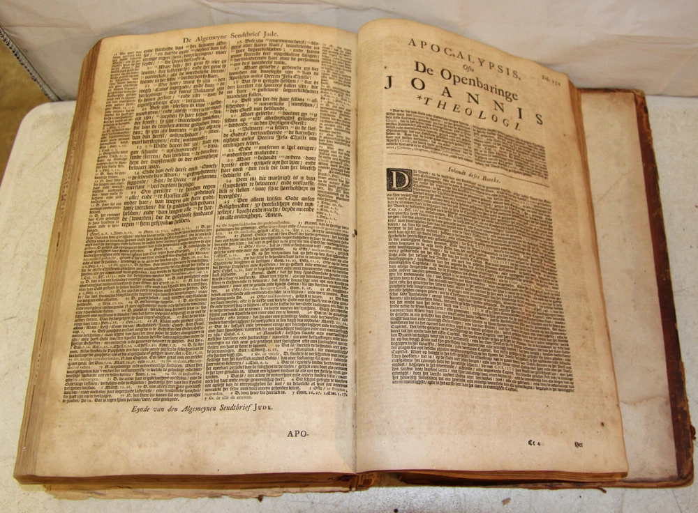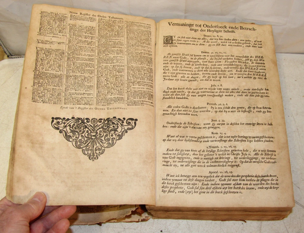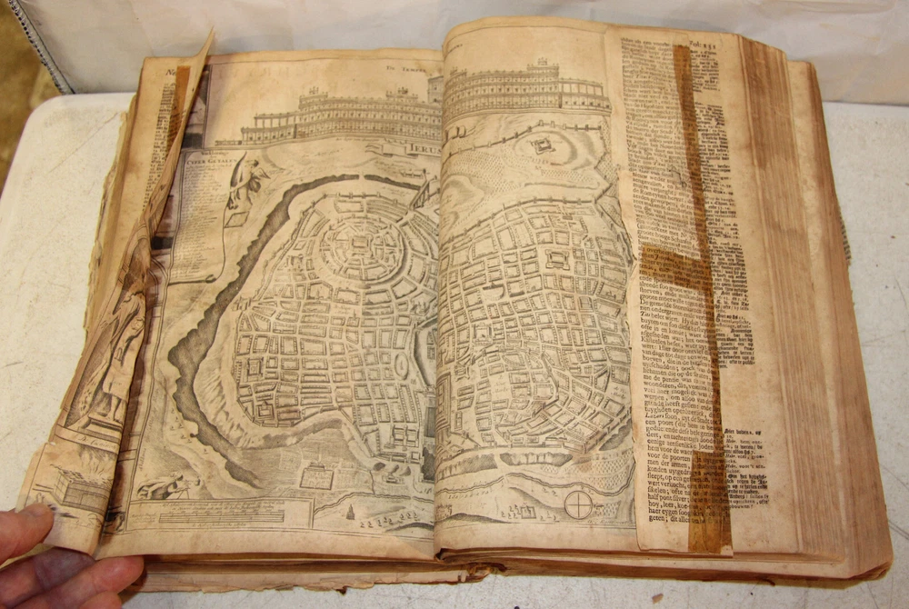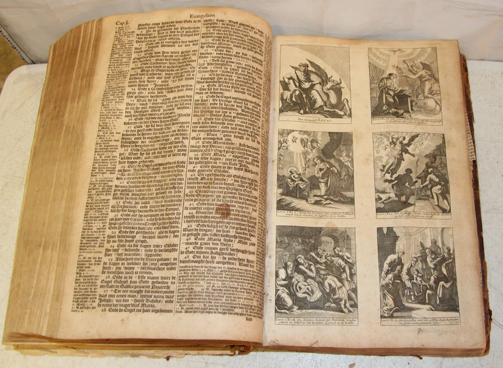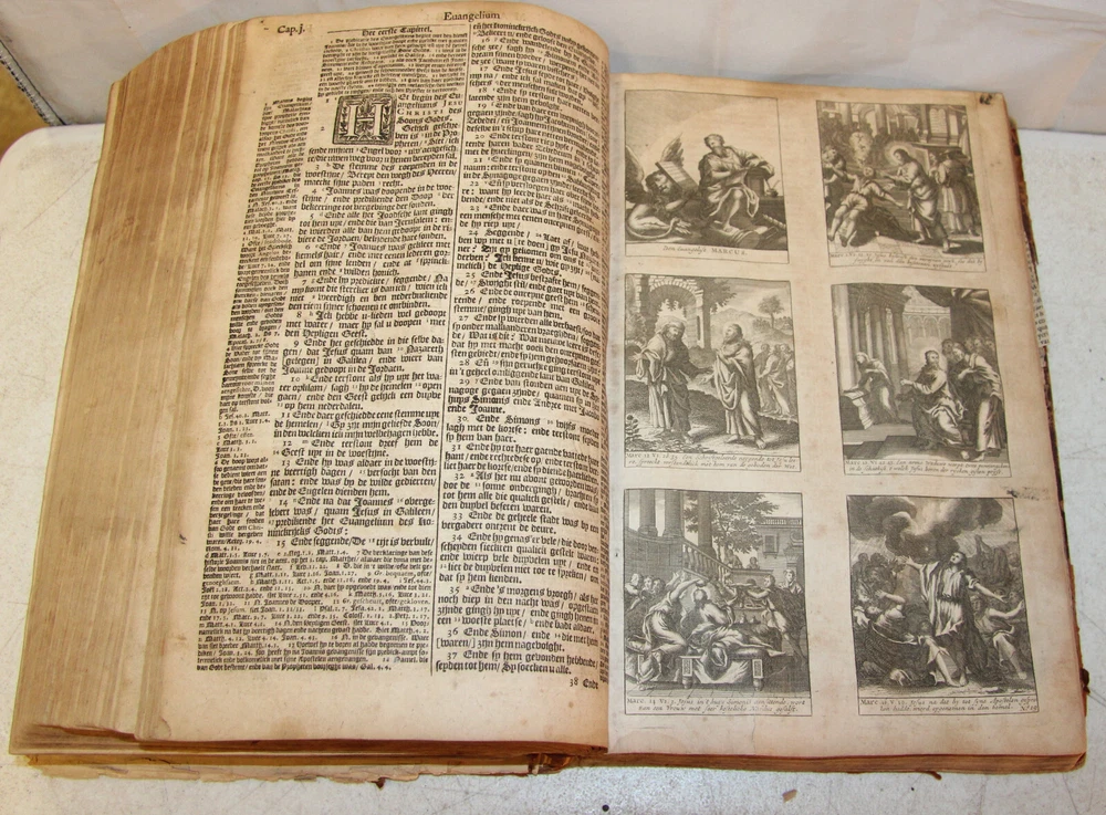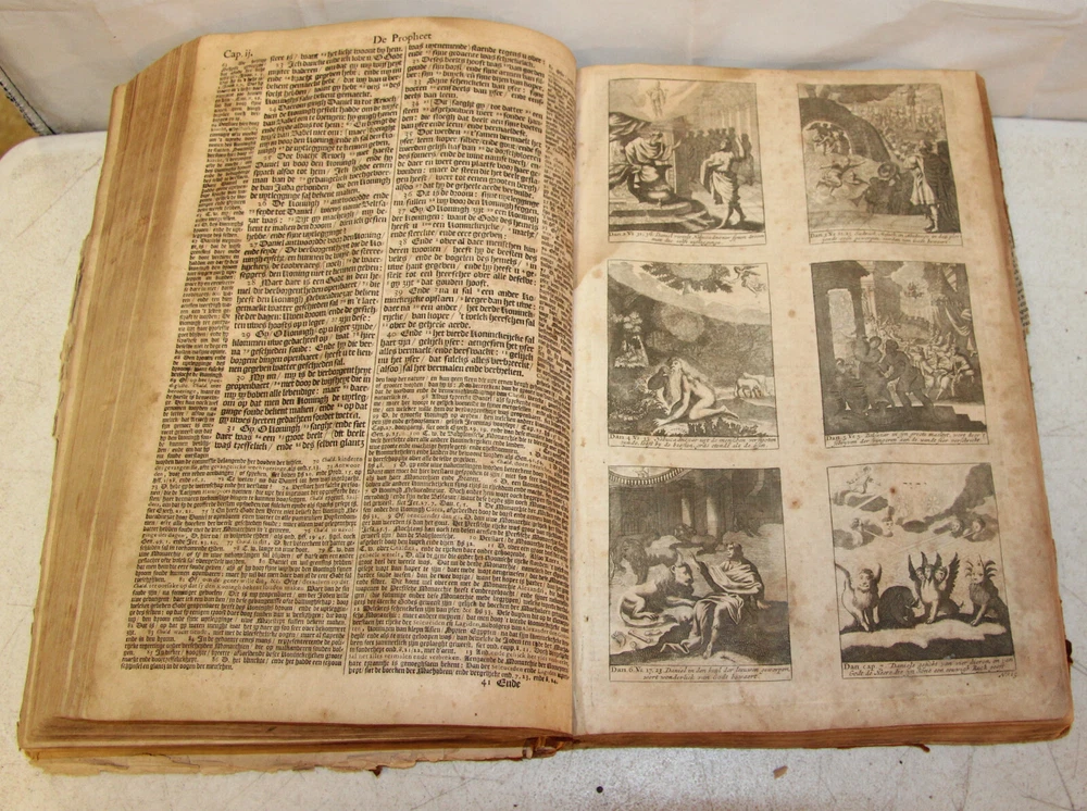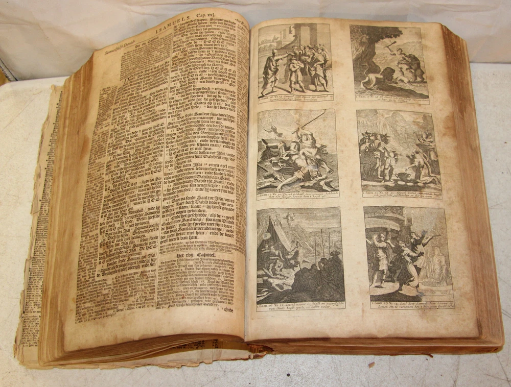 1736 Dutch Holy Bible. 13" tall X 8 3/4" wide and 3 7/8" thick. Both covers detached, leather peeling from spine and covers. First 10 pages (including blank pages) detached with damage to margins. Main title page missing, New Testament and Apocrypha title pages dated 1736. Numerous previous tape repairs to pages. Some fold-out maps have tape repairs that hinder opening them, tlc necessary. Some maps missing content from torn leaves. Everything is legible. Many amazing illustrations. The final pages of the Apocrypha missing. Restore or adore as is. Free shipping to lower 48 states via insured Media Mail.