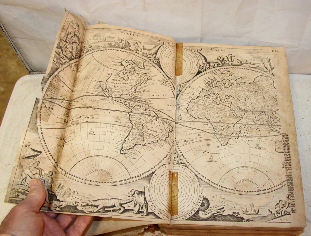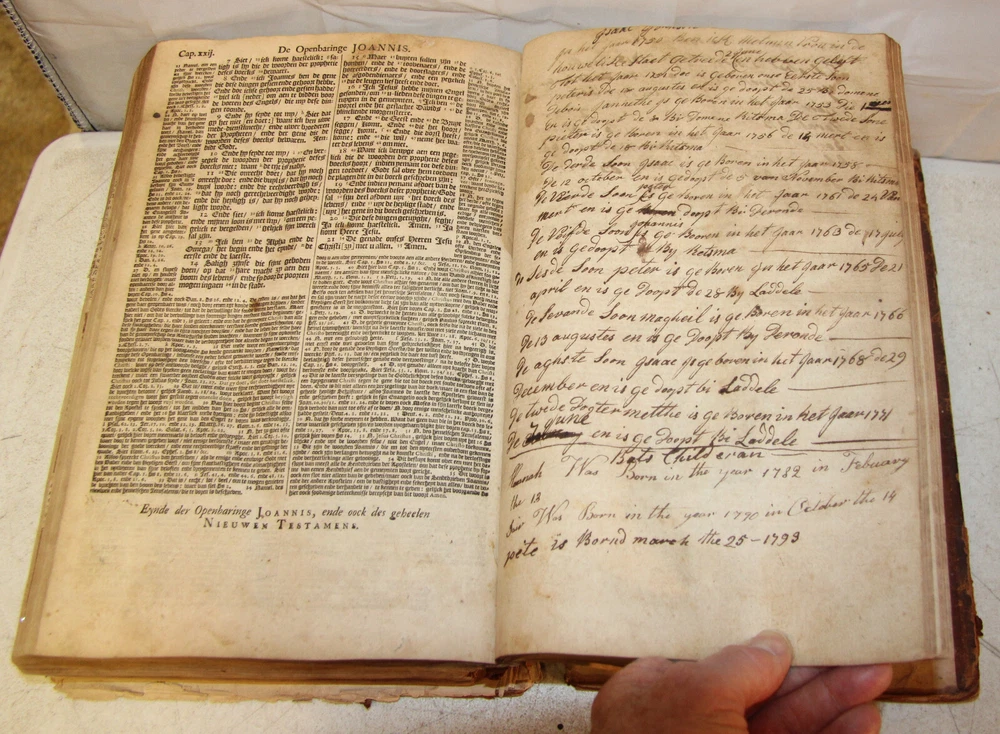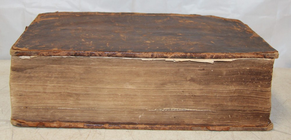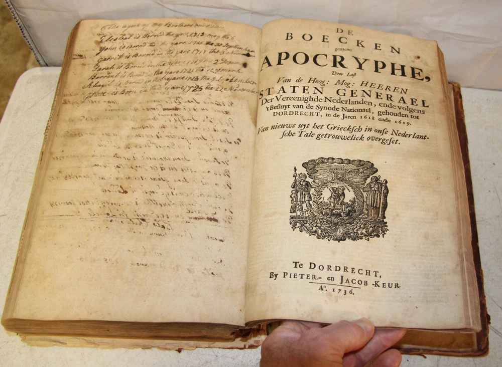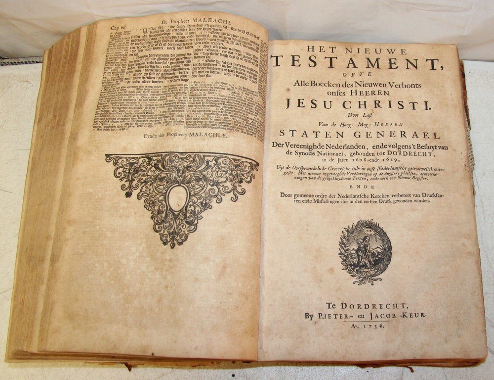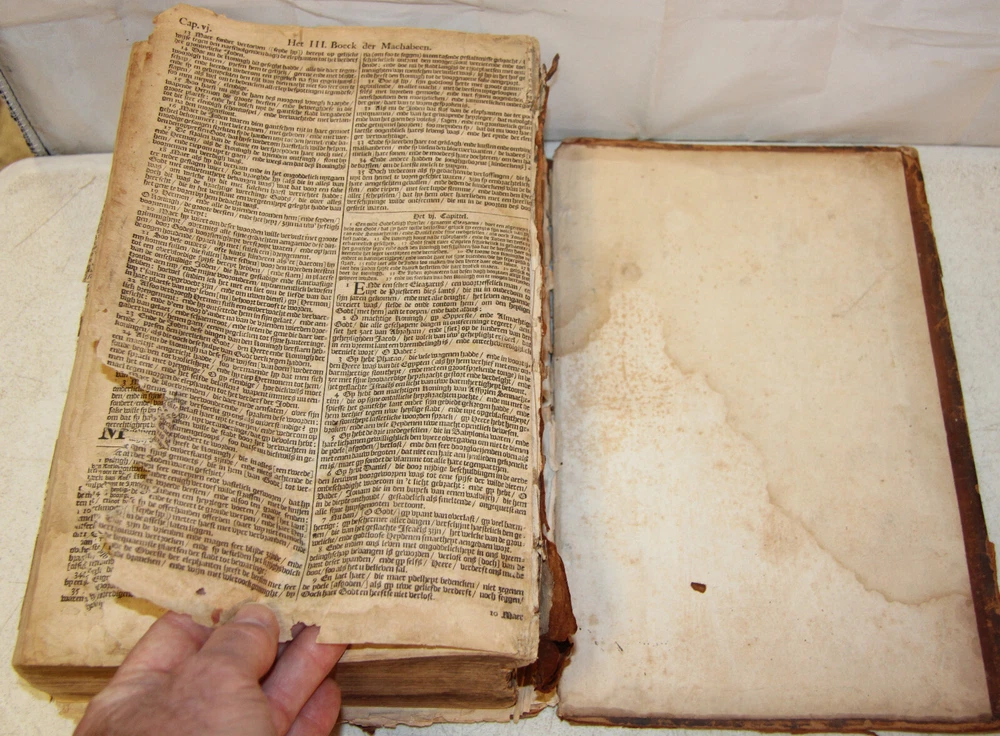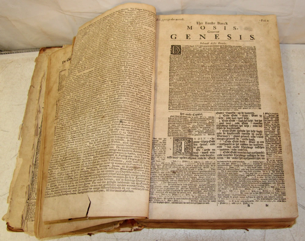 1736 Dutch Holy Bible. 13" tall X 8 3/4" wide and 3 7/8" thick. Both covers detached, leather peeling from spine and covers. First 10 pages (including blank pages) detached with damage to margins. Main title page missing, New Testament and Apocrypha title pages dated 1736. Numerous previous tape repairs to pages. Some fold-out maps have tape repairs that hinder opening them, tlc necessary. Some maps missing content from torn leaves. Everything is legible. Many amazing illustrations. The final pages of the Apocrypha missing. Restore or adore as is. Free shipping to lower 48 states via insured Media Mail.