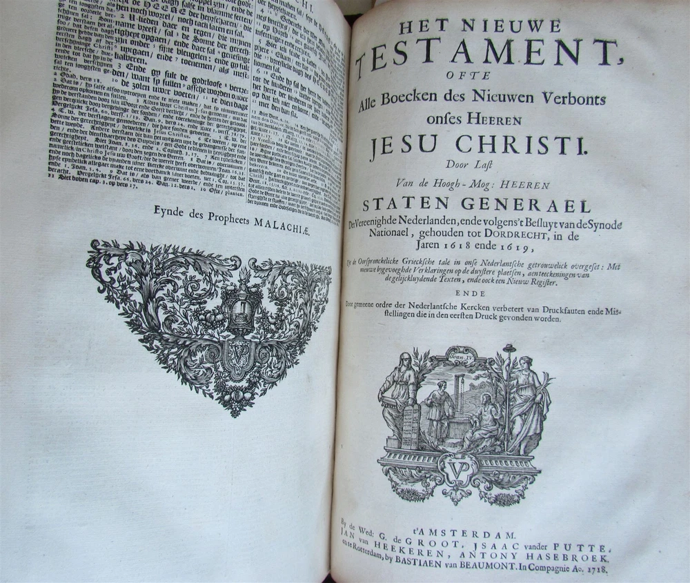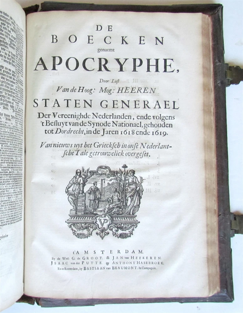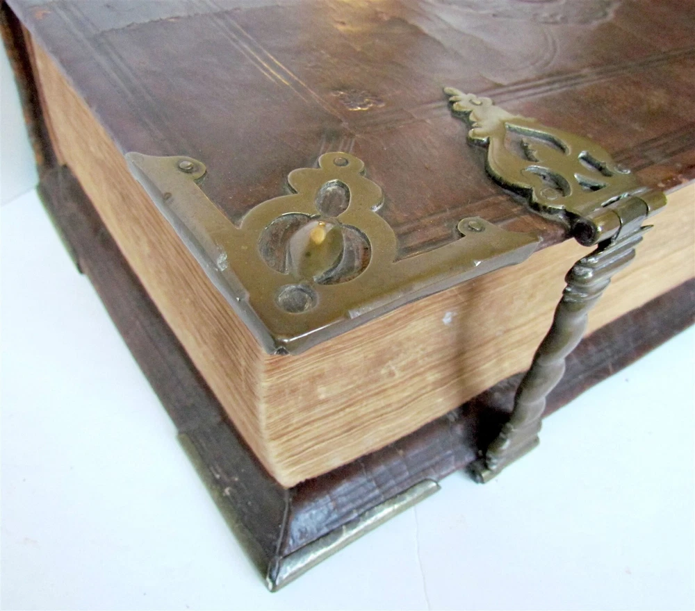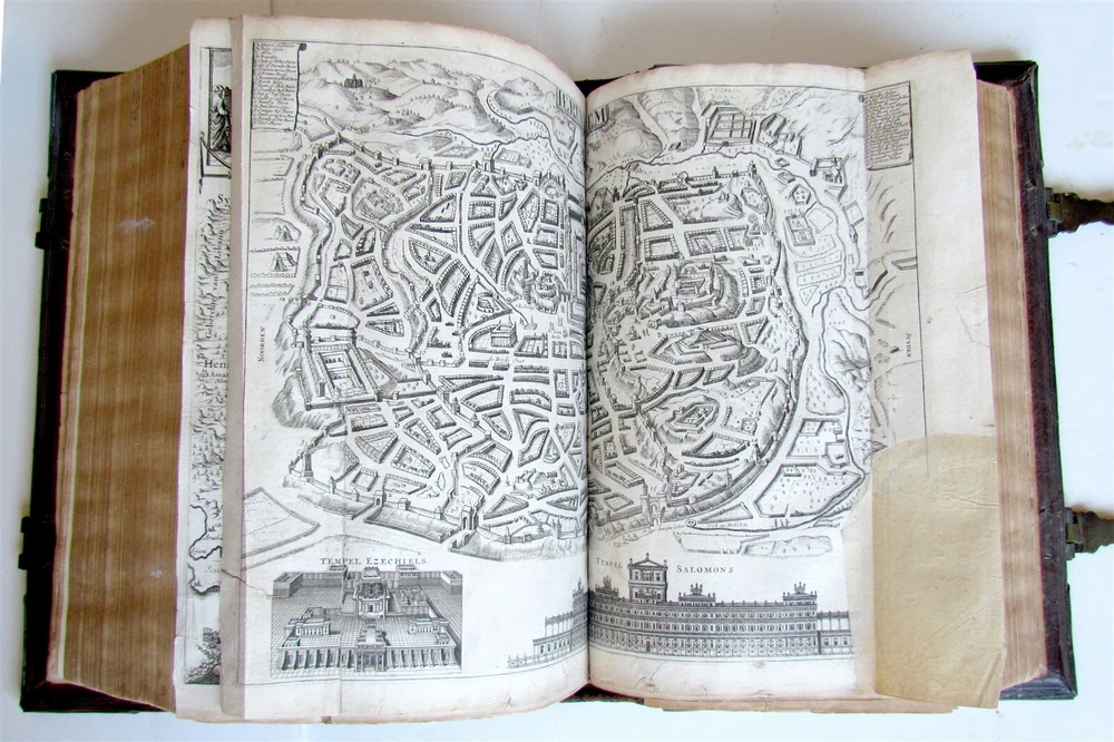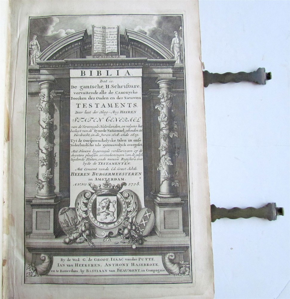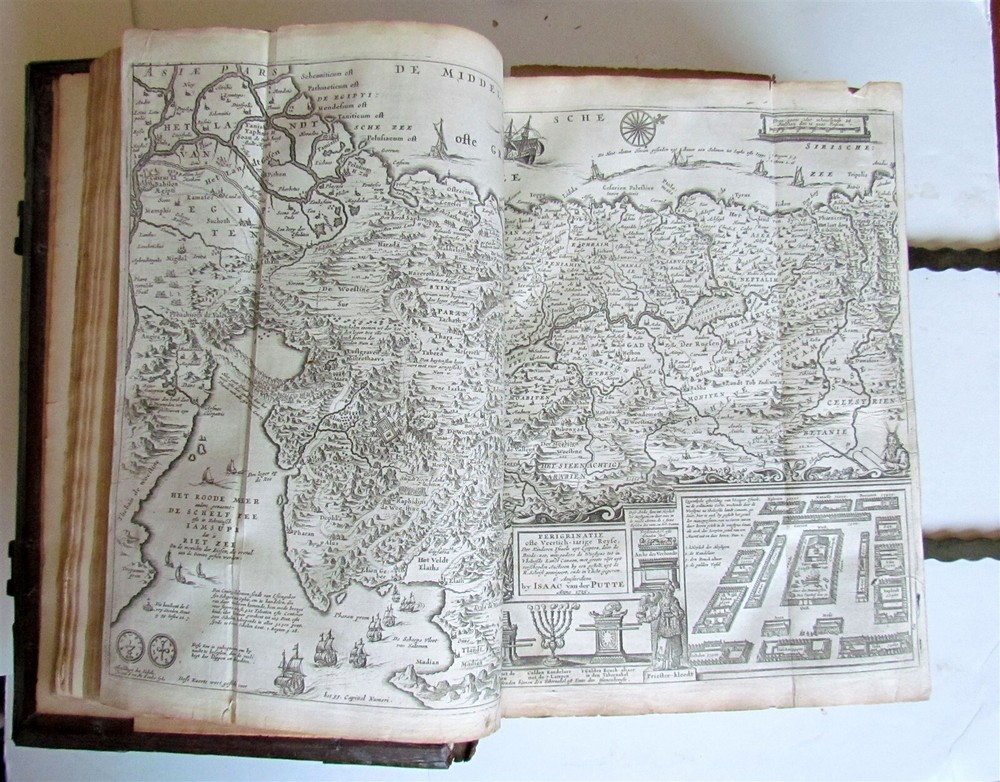 BIBLIA, DAT IS DE GANTSCHE H. SCHRIFTURE, vervattende alle de canonijcke boecken des ouden en des nieuwen testaments (...). Amsterdam; 1738 Old and new Testaments Illustrated with 5 maps (including world's map) and plan of Jerusalem bound in original full leather with intact brass clasps , catches and 8 brass corner pieces. Some wear of binding, damage to the upper end of the spine. Plan of Jerusalem with missing lower right corner, some repairs to the margins of the maps. 3 of the maps are detached (but present), 2 maps with reinforced backs. Pages are clean and crisp Massive folio, Size: 9 3/4 by 15" Thickness 5" text in Dutch ========================== =================================================== Please see my other auctions Thank You Refund Policy: We will issue a FULL REFUND, 100% money back if you are not satisfied with your purchase. Items must be returned to us within 20 days in order to receive a refund or replacement. Buyer is responsible for shipping costs. Powered by SixBit's eCommerce Solution