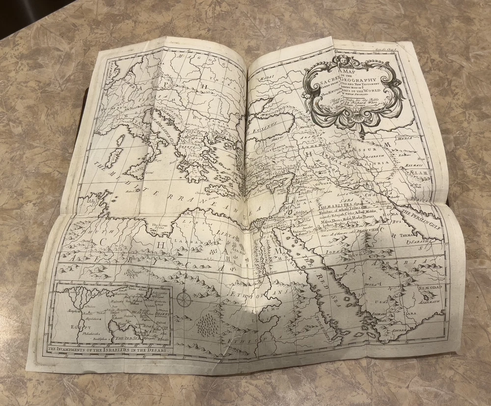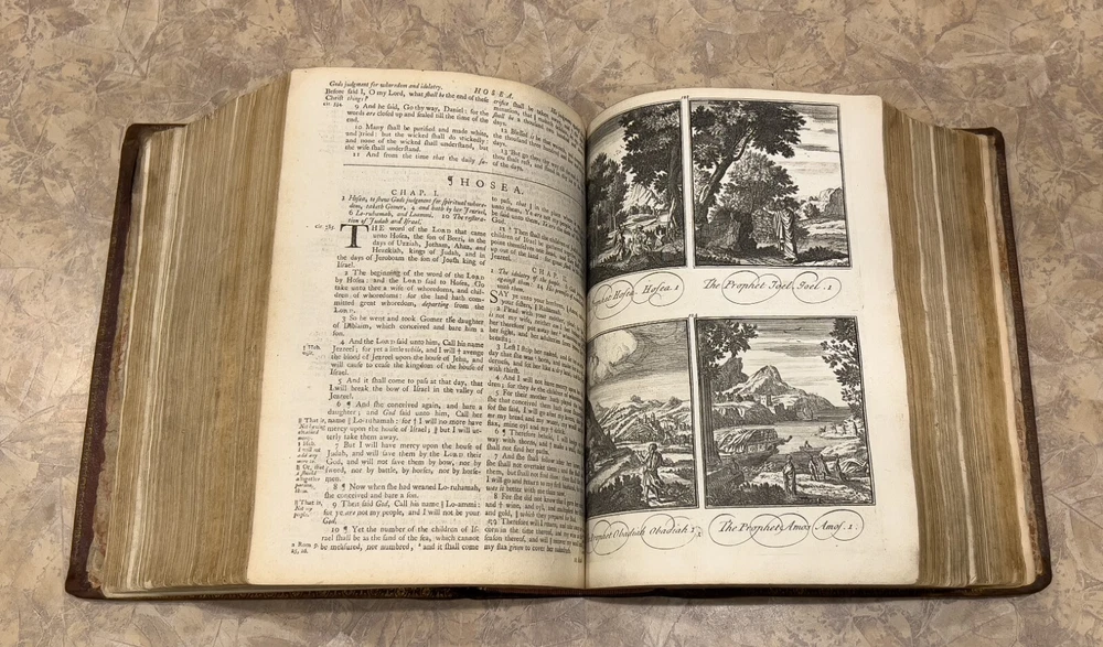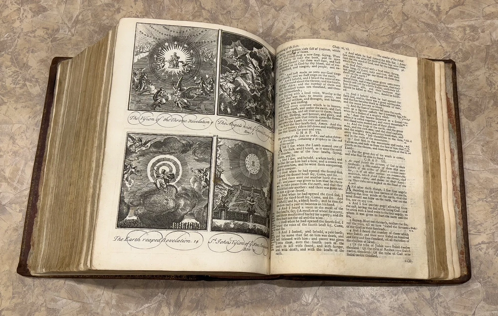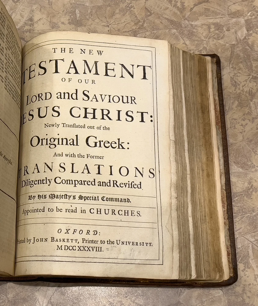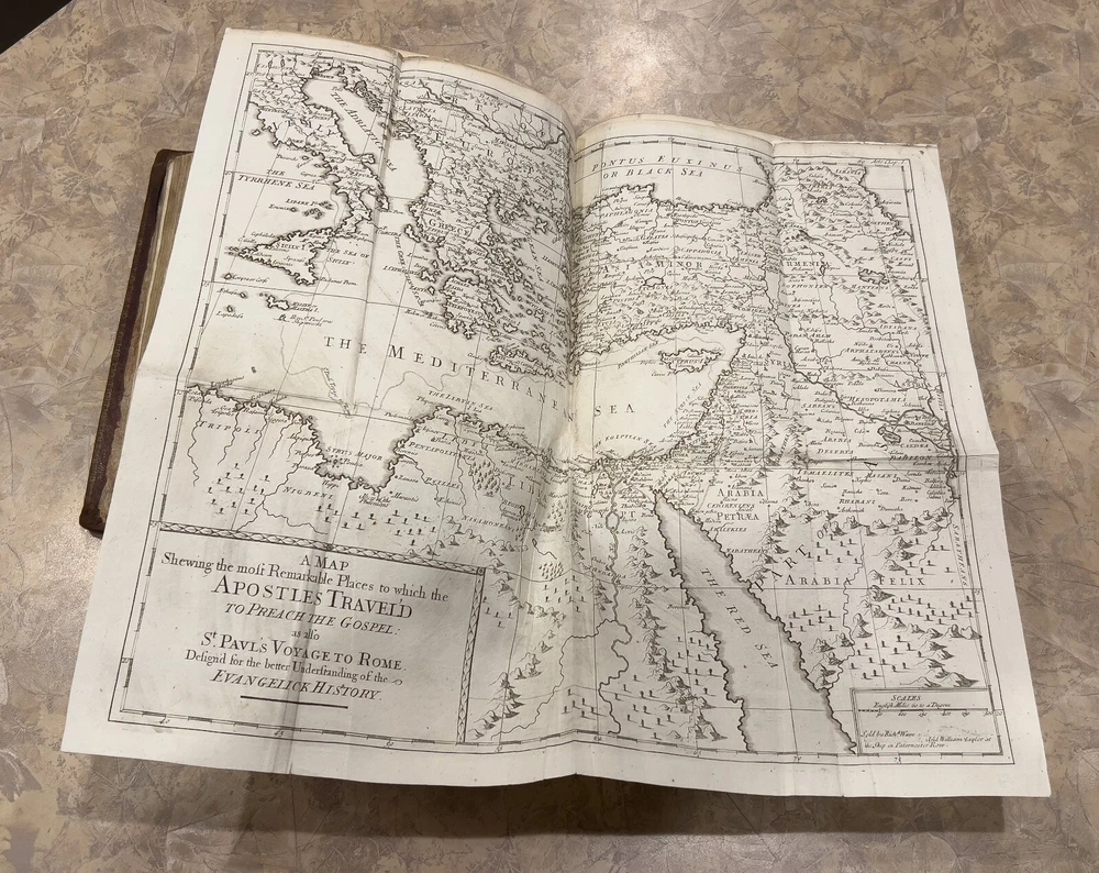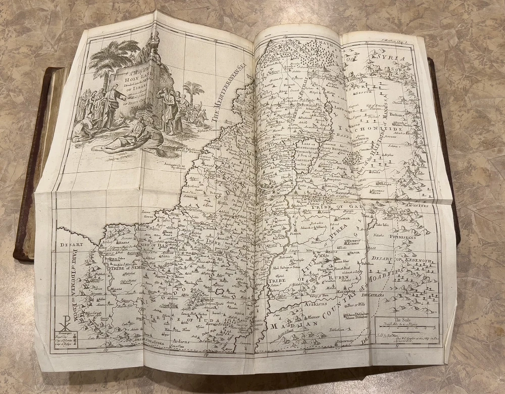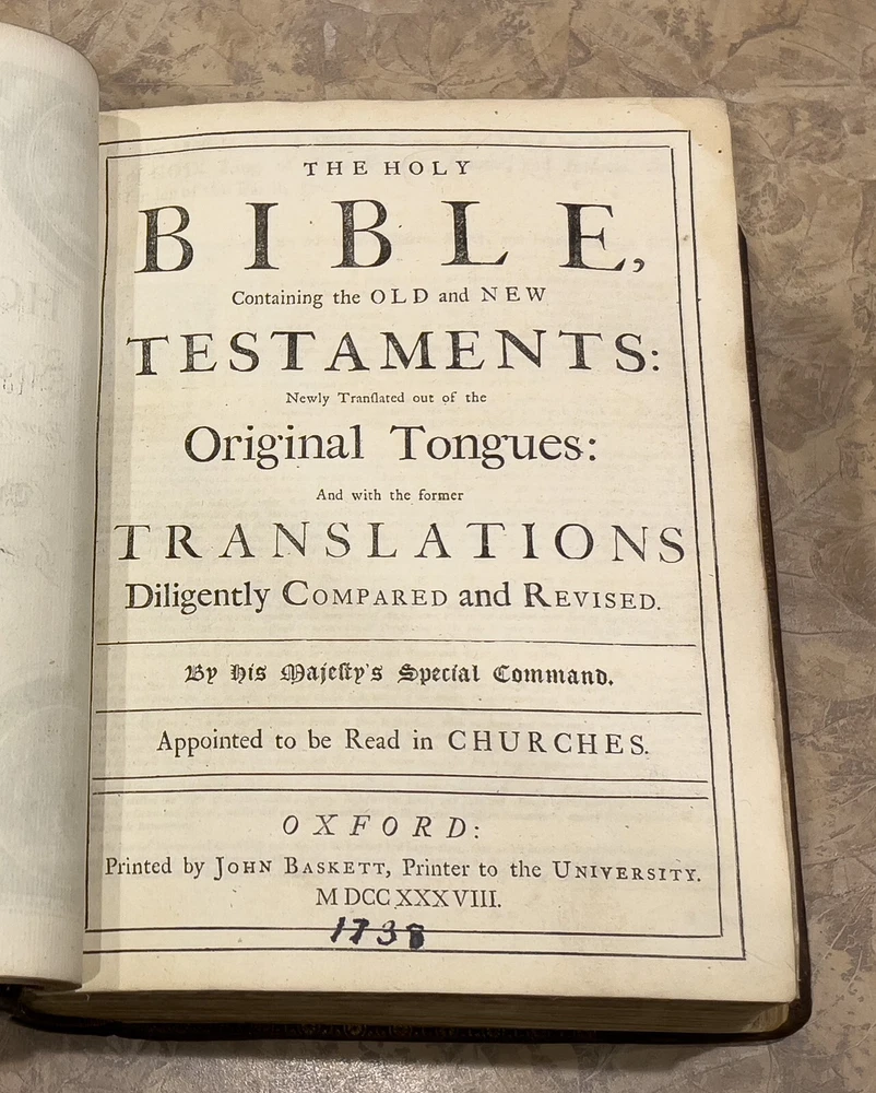 1738/39 Extensively Illustrated KJV Bible and Book of Common Prayer AMAZING FOLD OUT MAPS! (best I've seen really) STUNNING binding. This is a superb Holy Bible, restored at the best bookbinder in the UK. Full of superb engravings and four fold out maps. "The Book of Common Prayer And Administration of the Sacraments..." Oxford: John Baskett, Printer ot the University. Dated: MDCCXXXIX (1739) Large, Thick quarto. Engraved pulus printed title pages. Collates A-H2 Very good clean condition. Minor wear or blemishes else very good. BOUND WITH "The Holy Bible Containing The Old & New Testaments, Newly Translated Out of the Original Tongues..." Oxford: John Baskett, Printer to the Universtiy. Dated: MDCCXXXVIII (1738) Engraved plus printed title pages. Collates A-Yy4 (OT), A-K7 (Apocrypha), A-O4 (NT), A-I4 (Index & History) Separate printed titles to OT and NT. No title called for in Apocrypha. Separate Index and History in the rear following Revelation. 204 numbered engravings, four to a page (Two leaves of engravings lacking and one with tear). For stunning fold-out maps present. All in all in very good condition with minor wear and the odd clean tear, etc. Some detached. A Little marginal wear in the odd place else a lovely copy This Bible came back from a UK book binder with 30 year binding history. It was respined over raise bands with original gilt leather spine relaid. This is a beautifuld dark red leather binding with gilt tooled borders and center lozenge to front and rear. Gilt ornately decorated spine. New Gilt lettered label. One of the nicest bindings I've seen. 10" x 8.5" x4.25" thick. See images for more info.