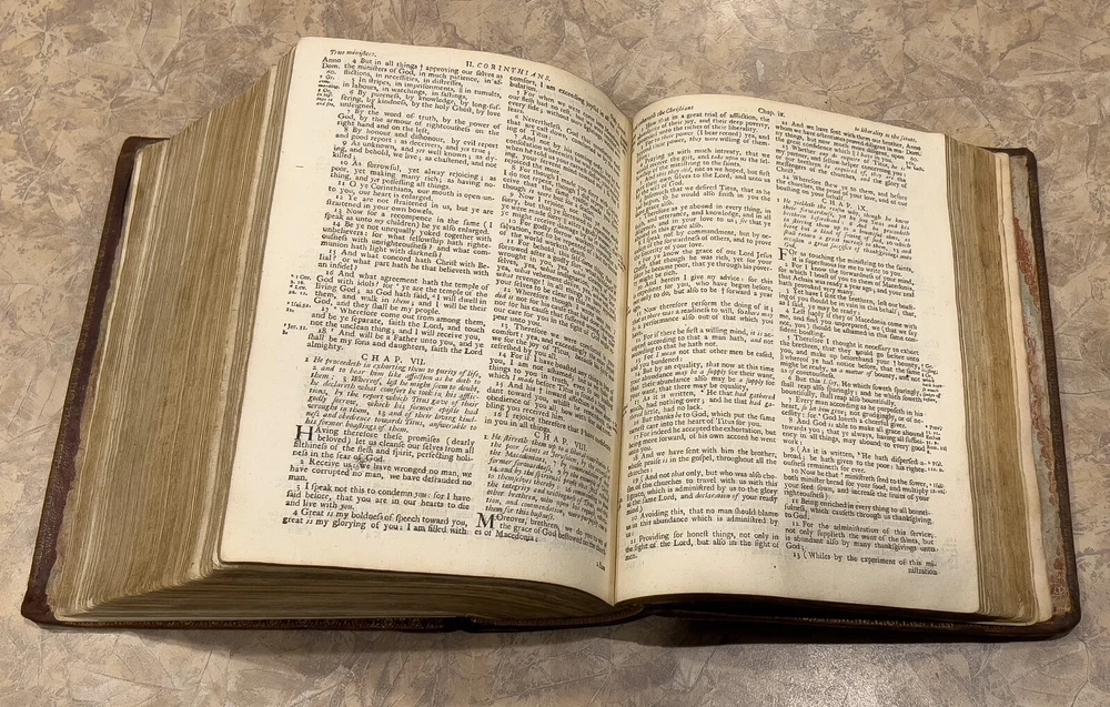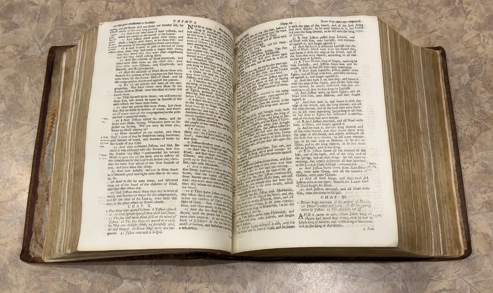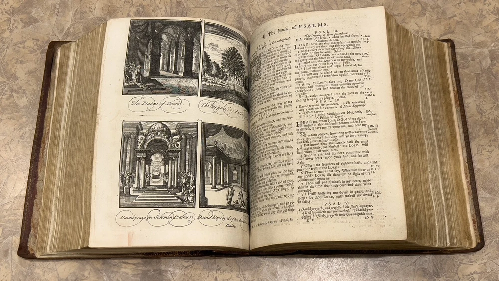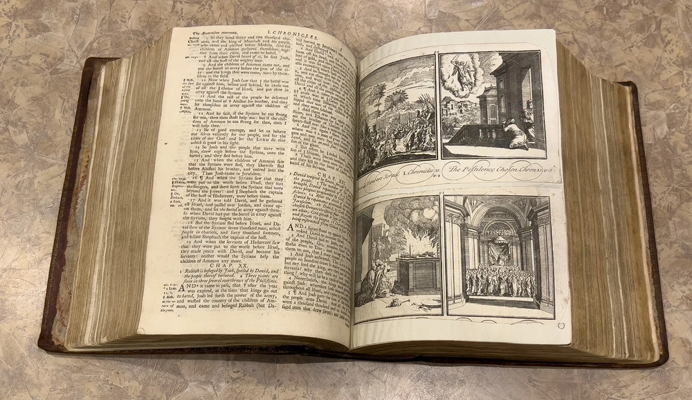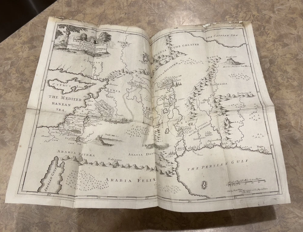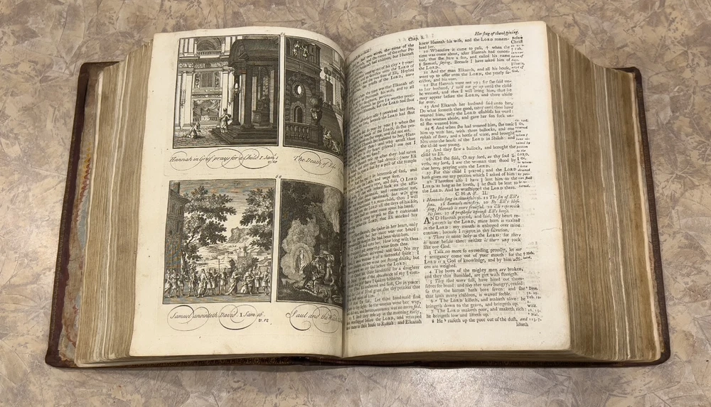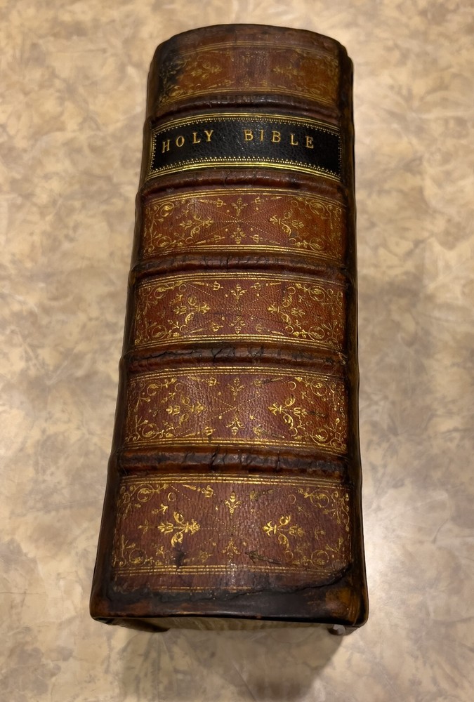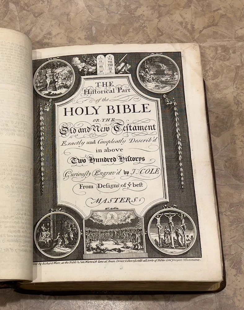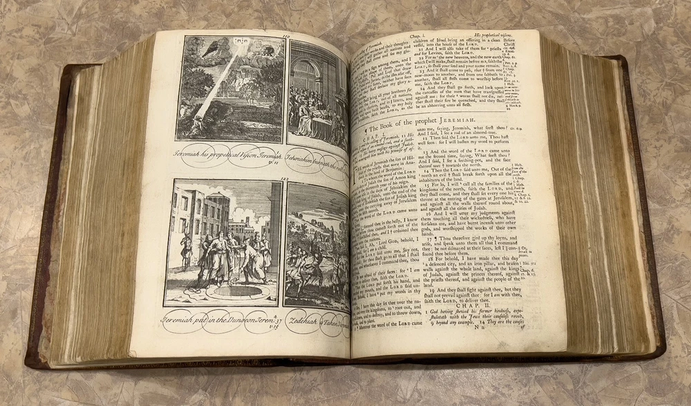 1738/39 Extensively Illustrated KJV Bible and Book of Common Prayer AMAZING FOLD OUT MAPS! (best I've seen really) STUNNING binding. This is a superb Holy Bible, restored at the best bookbinder in the UK. Full of superb engravings and four fold out maps. "The Book of Common Prayer And Administration of the Sacraments..." Oxford: John Baskett, Printer ot the University. Dated: MDCCXXXIX (1739) Large, Thick quarto. Engraved pulus printed title pages. Collates A-H2 Very good clean condition. Minor wear or blemishes else very good. BOUND WITH "The Holy Bible Containing The Old & New Testaments, Newly Translated Out of the Original Tongues..." Oxford: John Baskett, Printer to the Universtiy. Dated: MDCCXXXVIII (1738) Engraved plus printed title pages. Collates A-Yy4 (OT), A-K7 (Apocrypha), A-O4 (NT), A-I4 (Index & History) Separate printed titles to OT and NT. No title called for in Apocrypha. Separate Index and History in the rear following Revelation. 204 numbered engravings, four to a page (Two leaves of engravings lacking and one with tear). For stunning fold-out maps present. All in all in very good condition with minor wear and the odd clean tear, etc. Some detached. A Little marginal wear in the odd place else a lovely copy This Bible came back from a UK book binder with 30 year binding history. It was respined over raise bands with original gilt leather spine relaid. This is a beautifuld dark red leather binding with gilt tooled borders and center lozenge to front and rear. Gilt ornately decorated spine. New Gilt lettered label. One of the nicest bindings I've seen. 10" x 8.5" x4.25" thick. See images for more info.